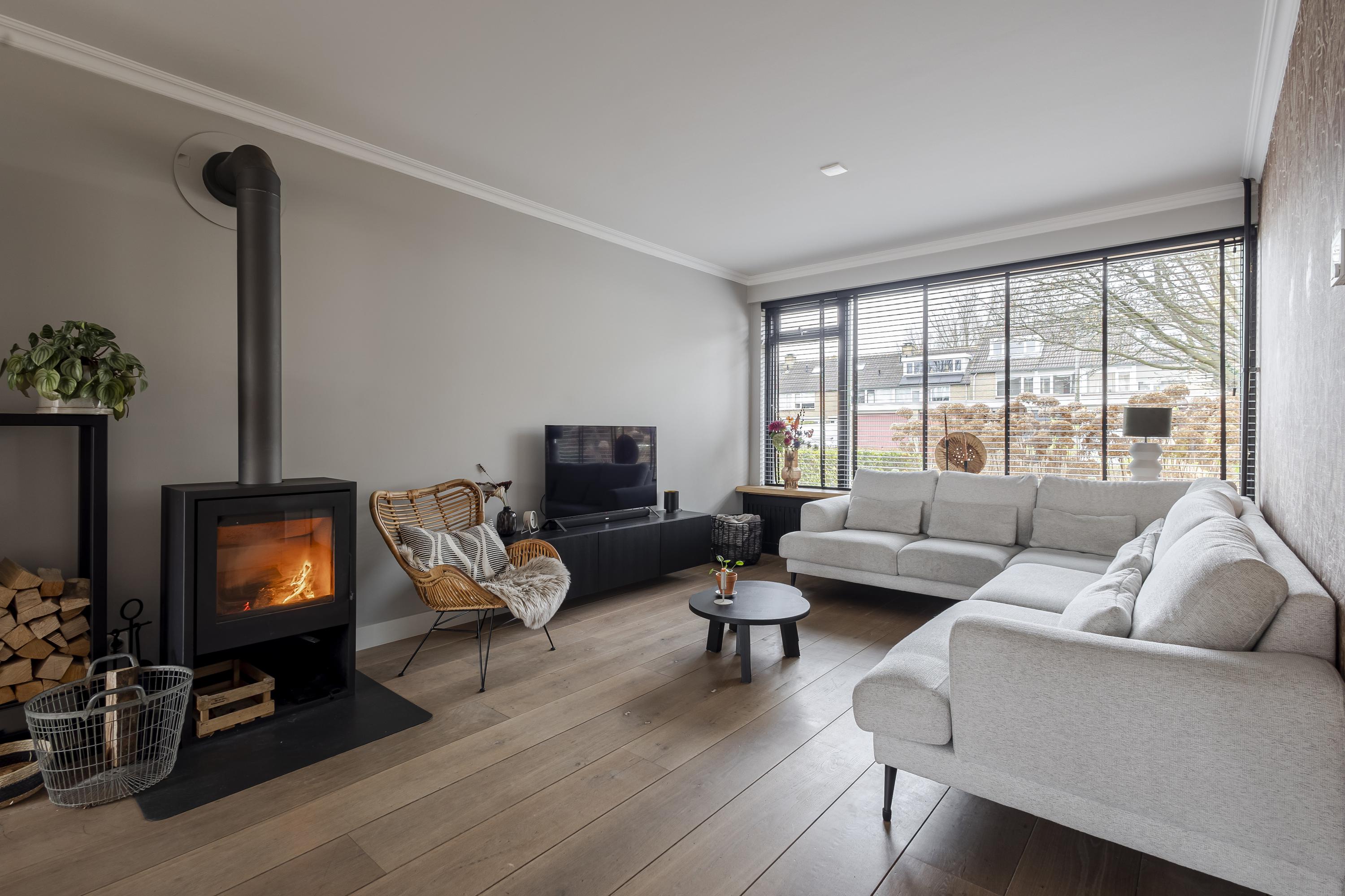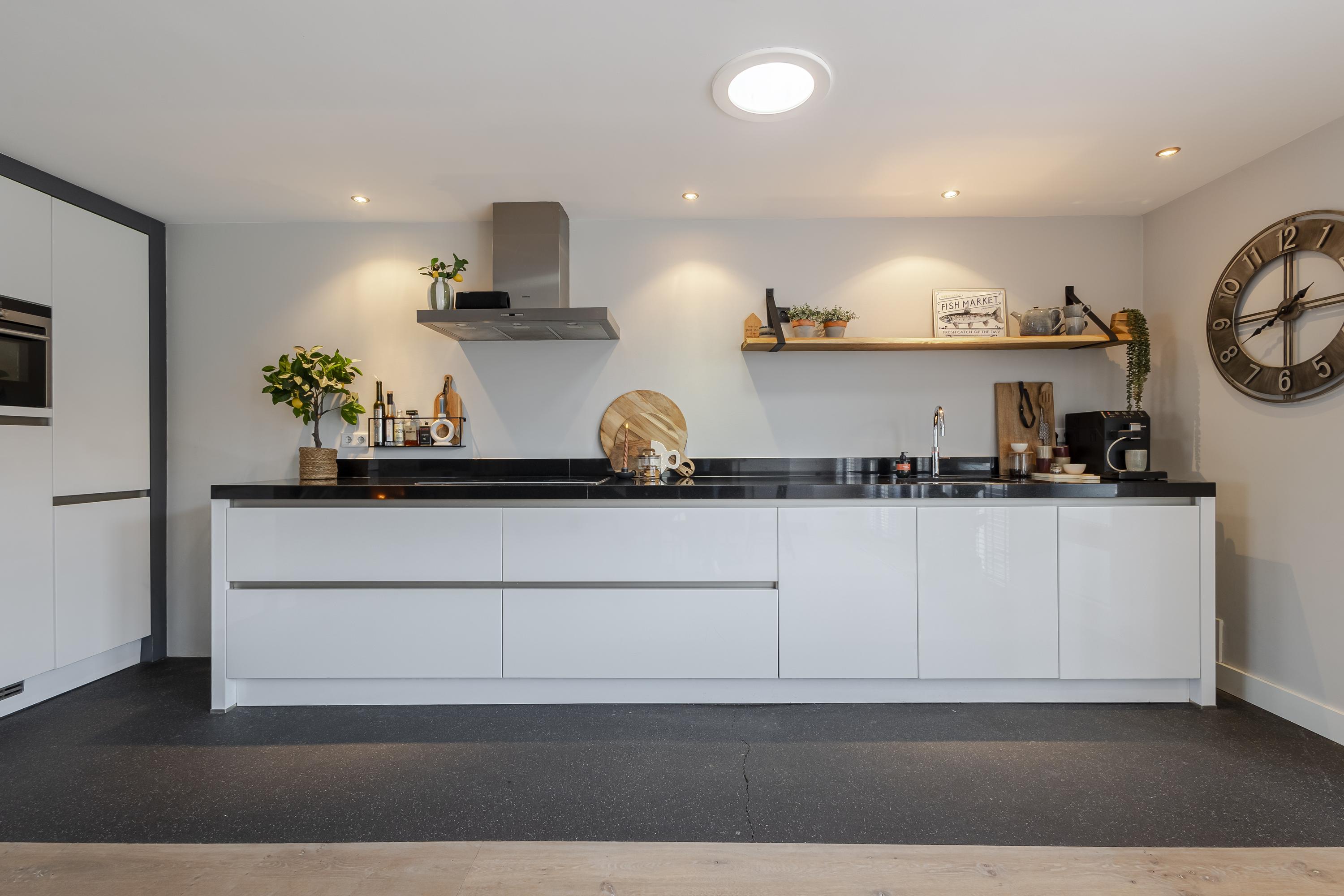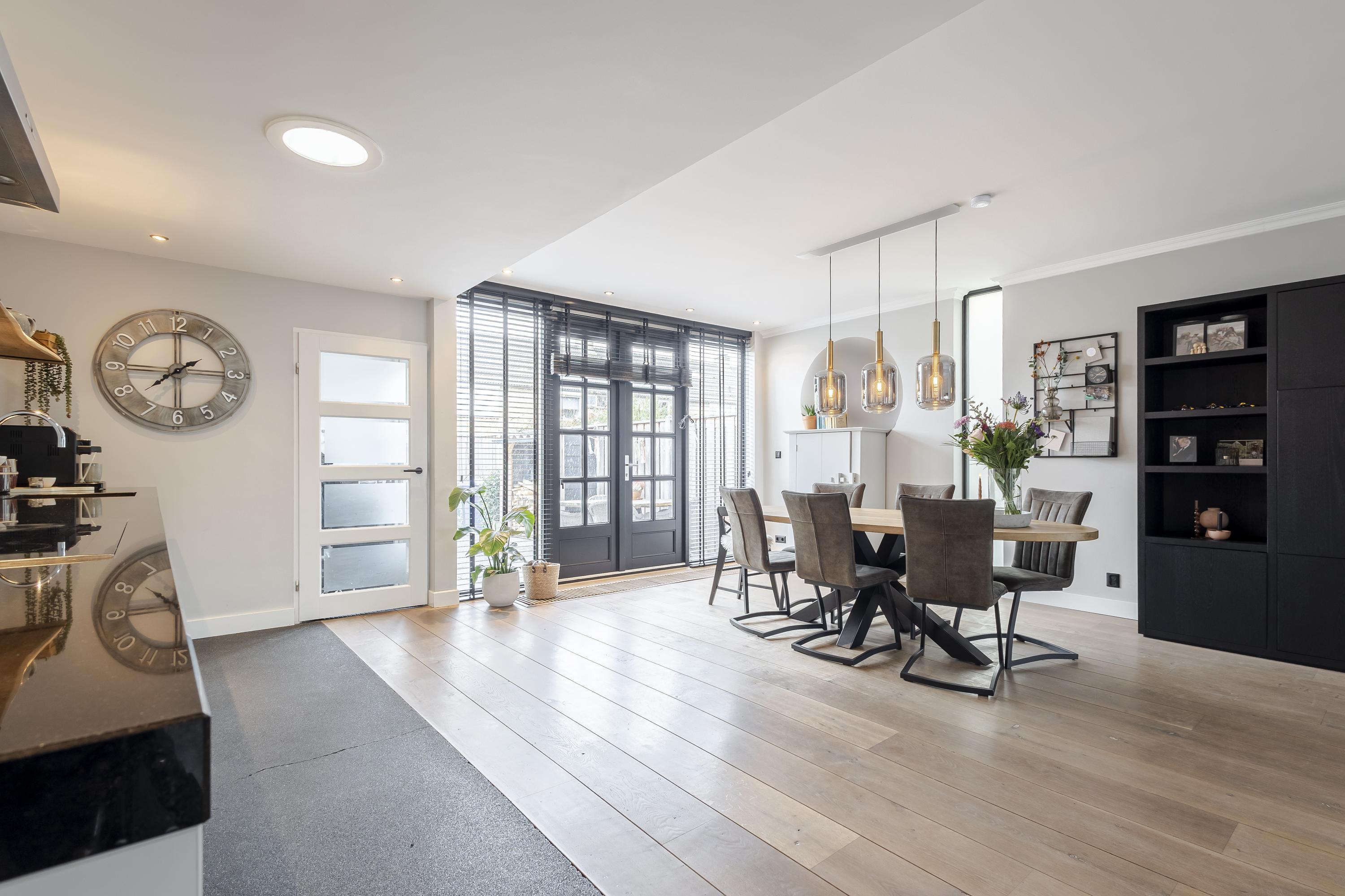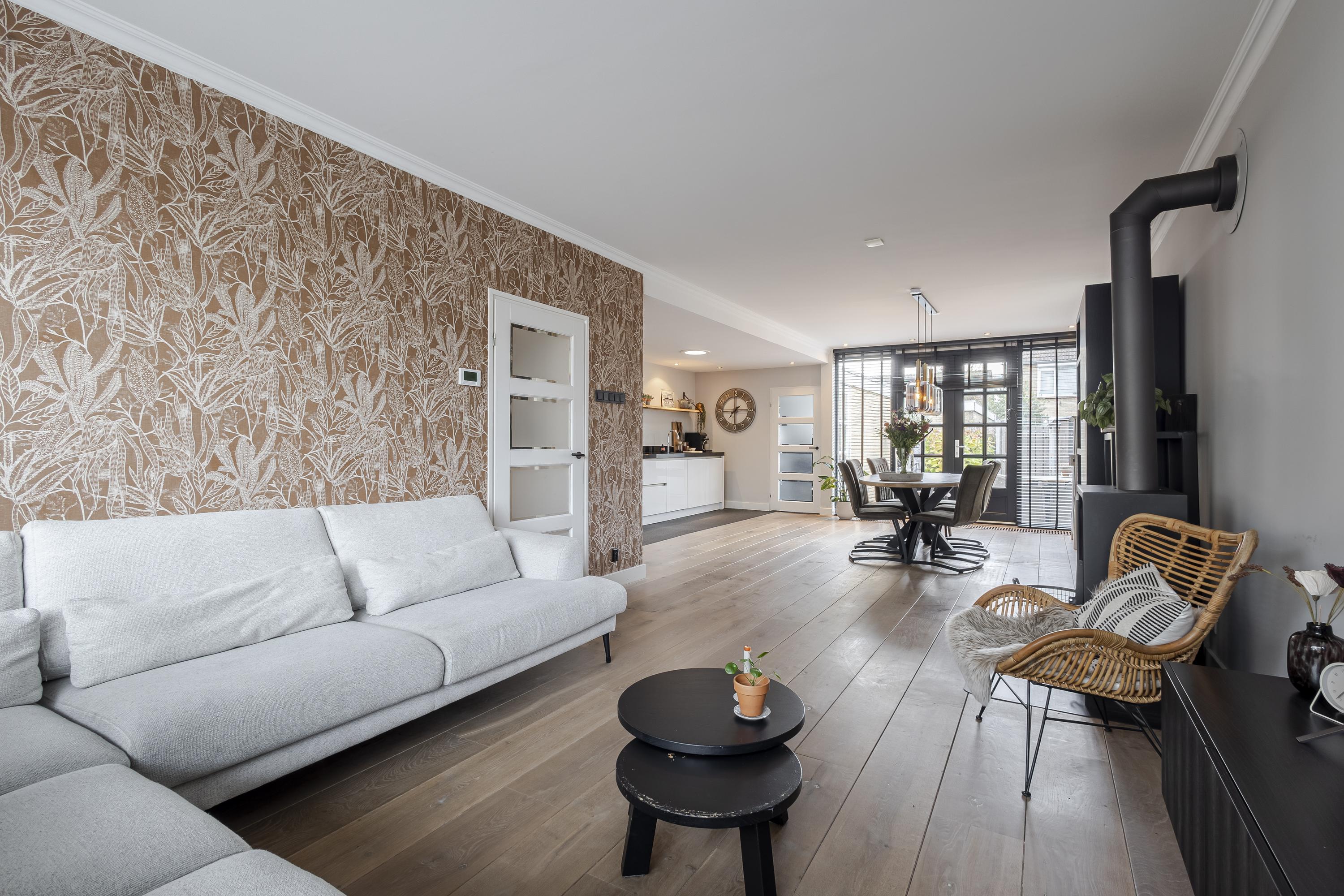 De royale aanbouw aan de achterzijde vormt het hart van de woning: een heerlijk ruime woonkamer met open keuken waar leven en genieten samenkomen. De strak vormgegeven keuken, de fraaie houten vloer, dubbele tuindeuren en de rijke daglichttoetreding zorgen voor een lichte en prettige leefruimte. Het brede straatbeeld draagt bij aan het gevoel van ruimte, terwijl een houtkachel op koude dagen zorgt voor extra warmte en gezelligheid.