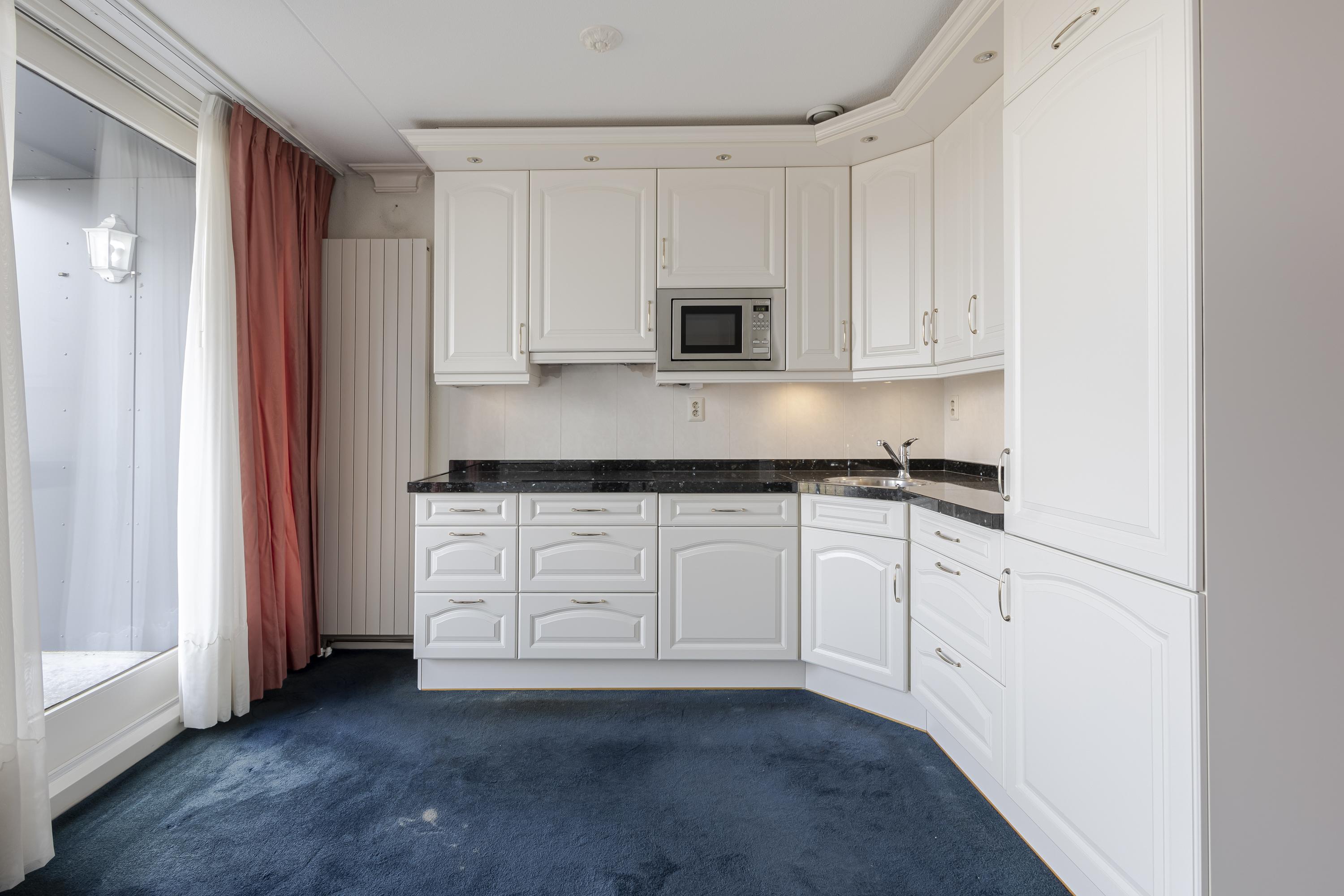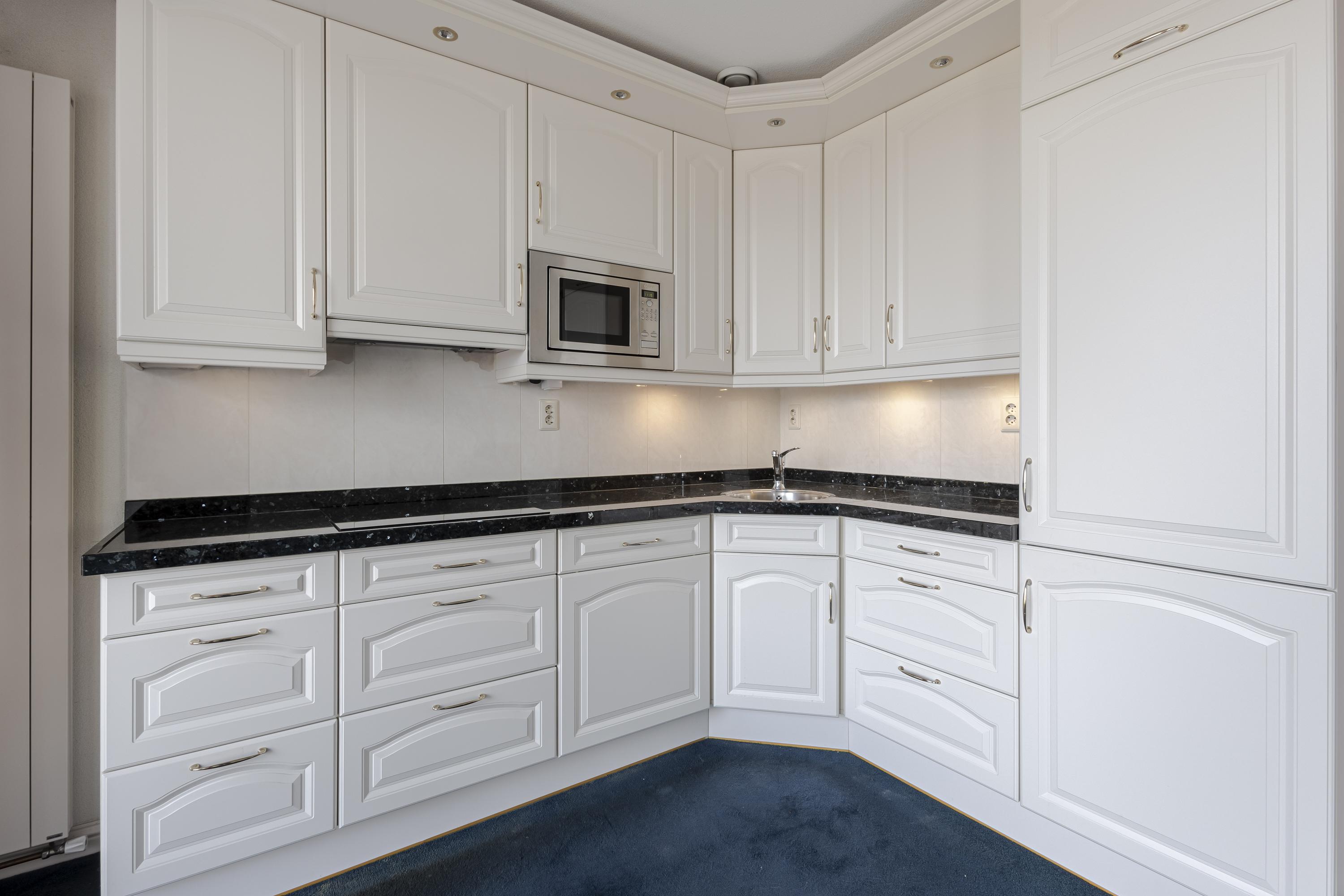De open keuken in hoekopstelling is compleet uitgerust met diverse inbouwapparatuur, waaronder een vaatwasser, magnetron en koel-/vriescombinatie. Alles verkeert in nette staat en is goed onderhouden.