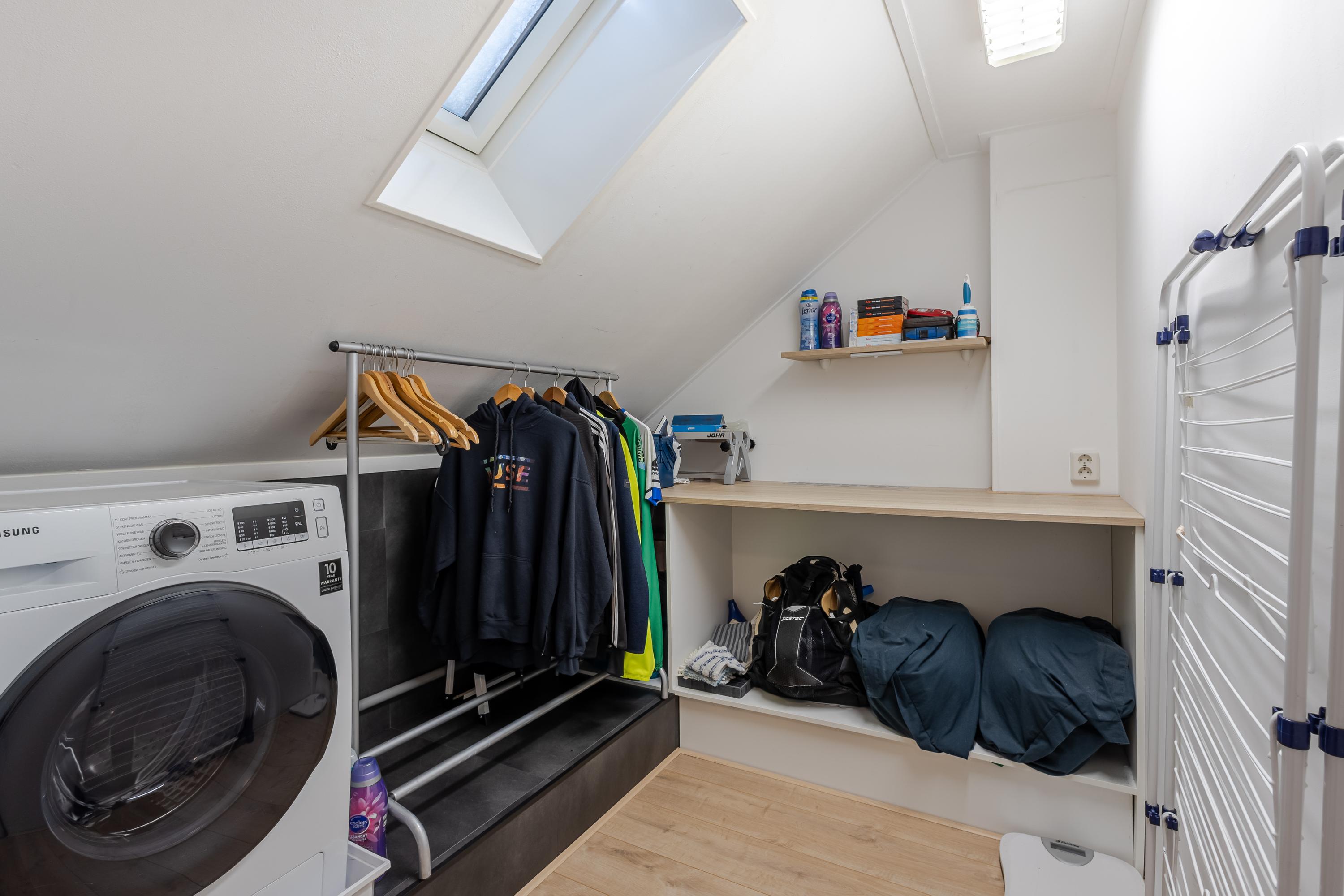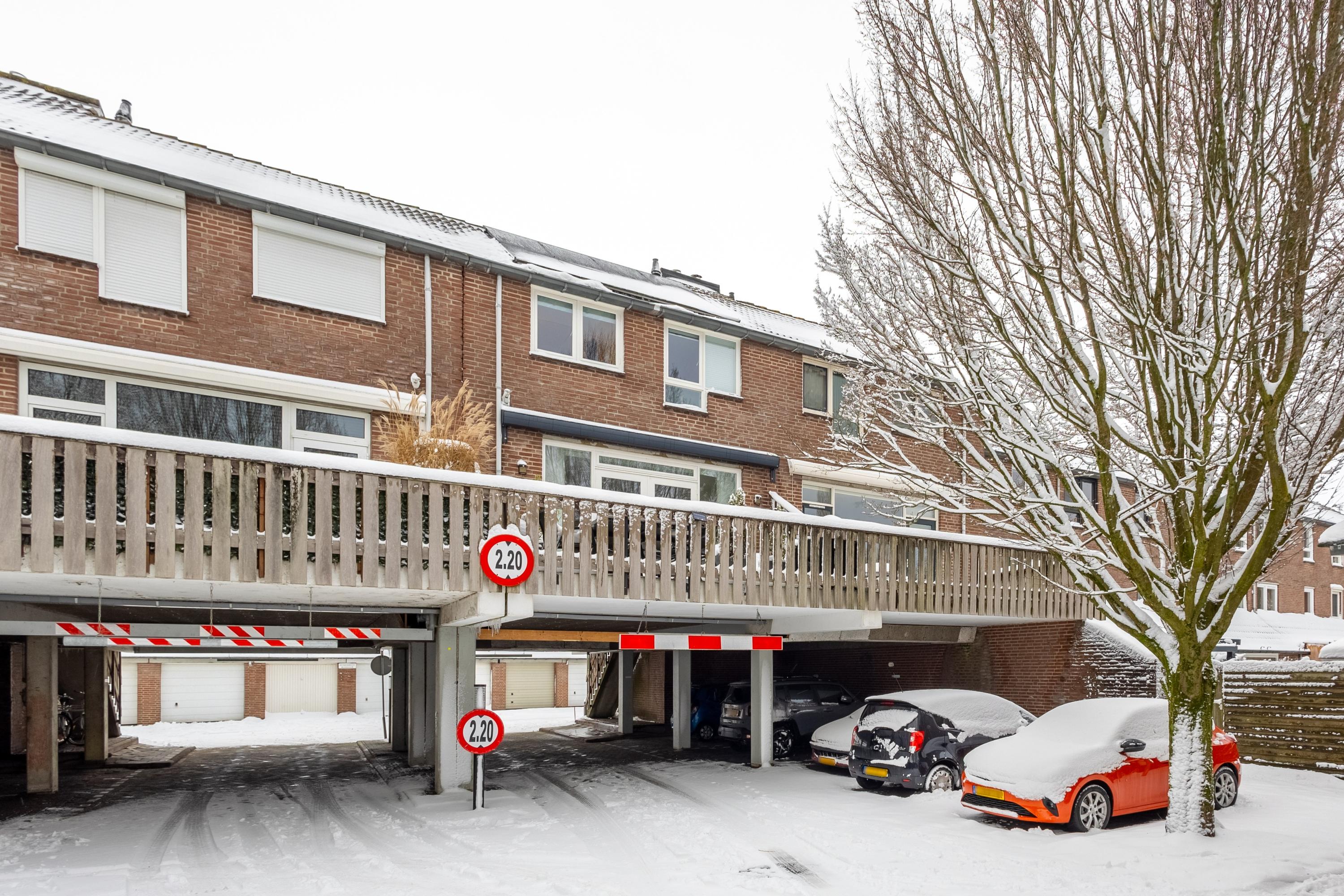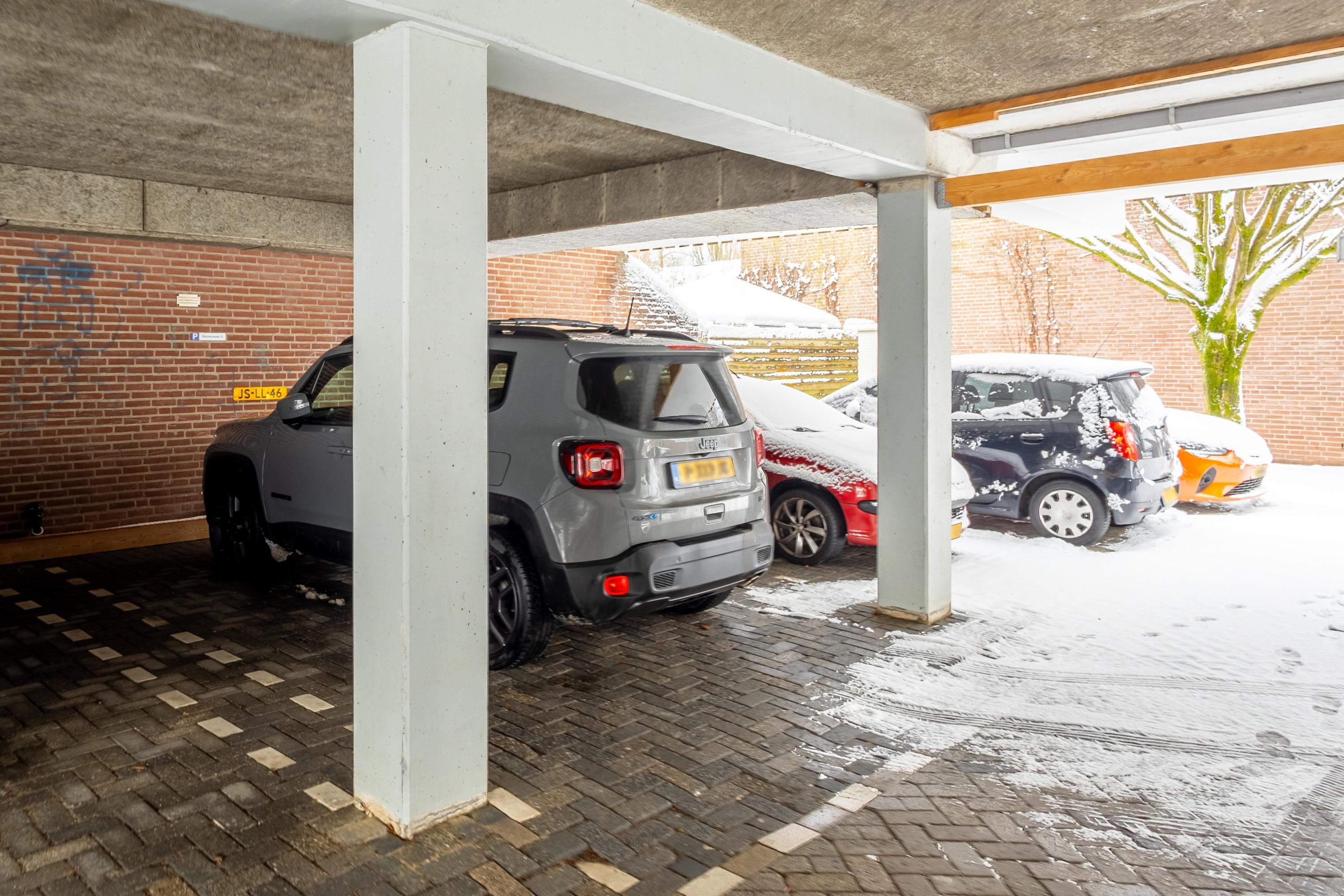 De eigen berging is praktisch gelegen aan de voorzijde van de woning, direct naast de trapopgang. Parkeren doe je op je eigen, overdekte parkeerplaats onder de woning – comfortabel en altijd dichtbij.