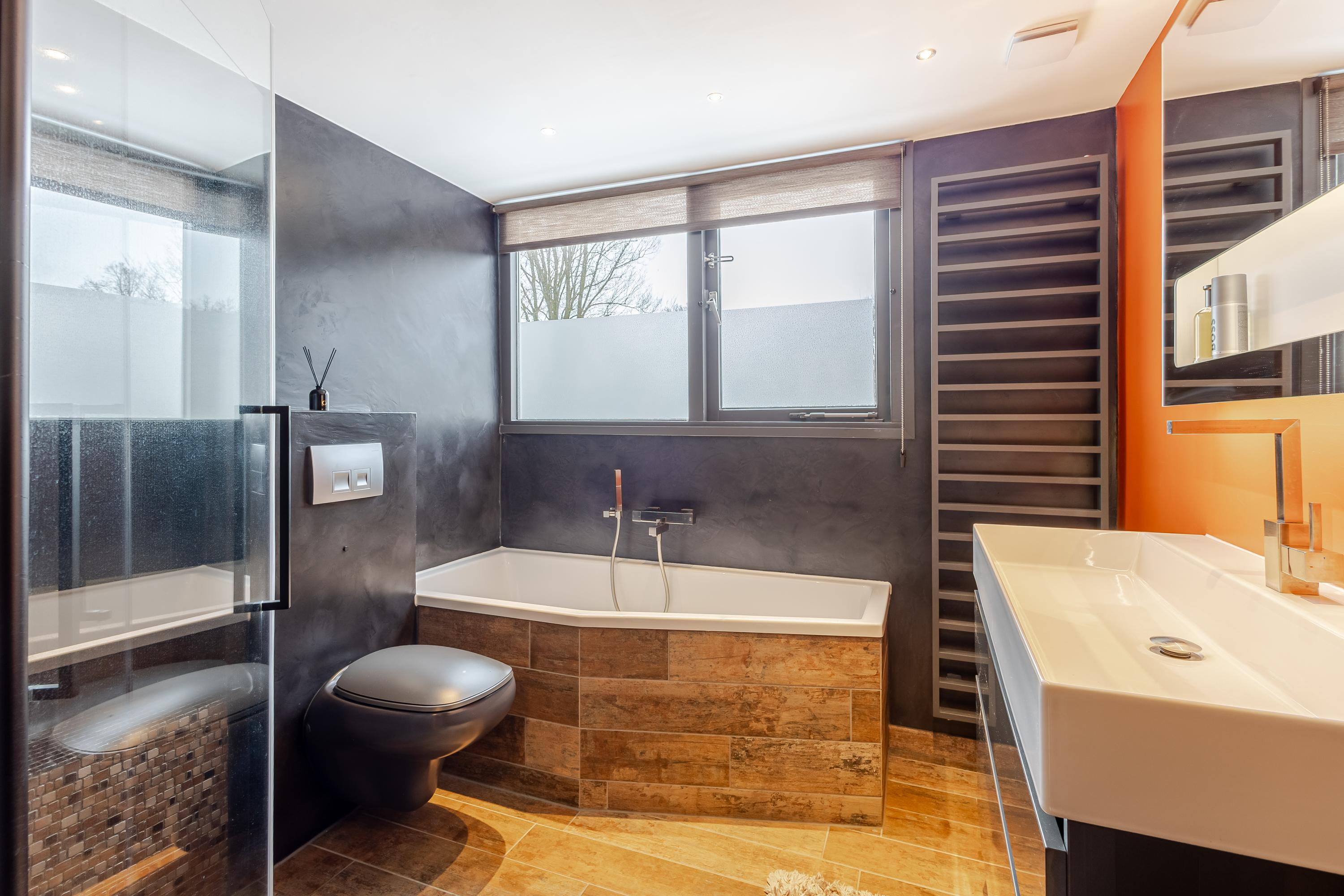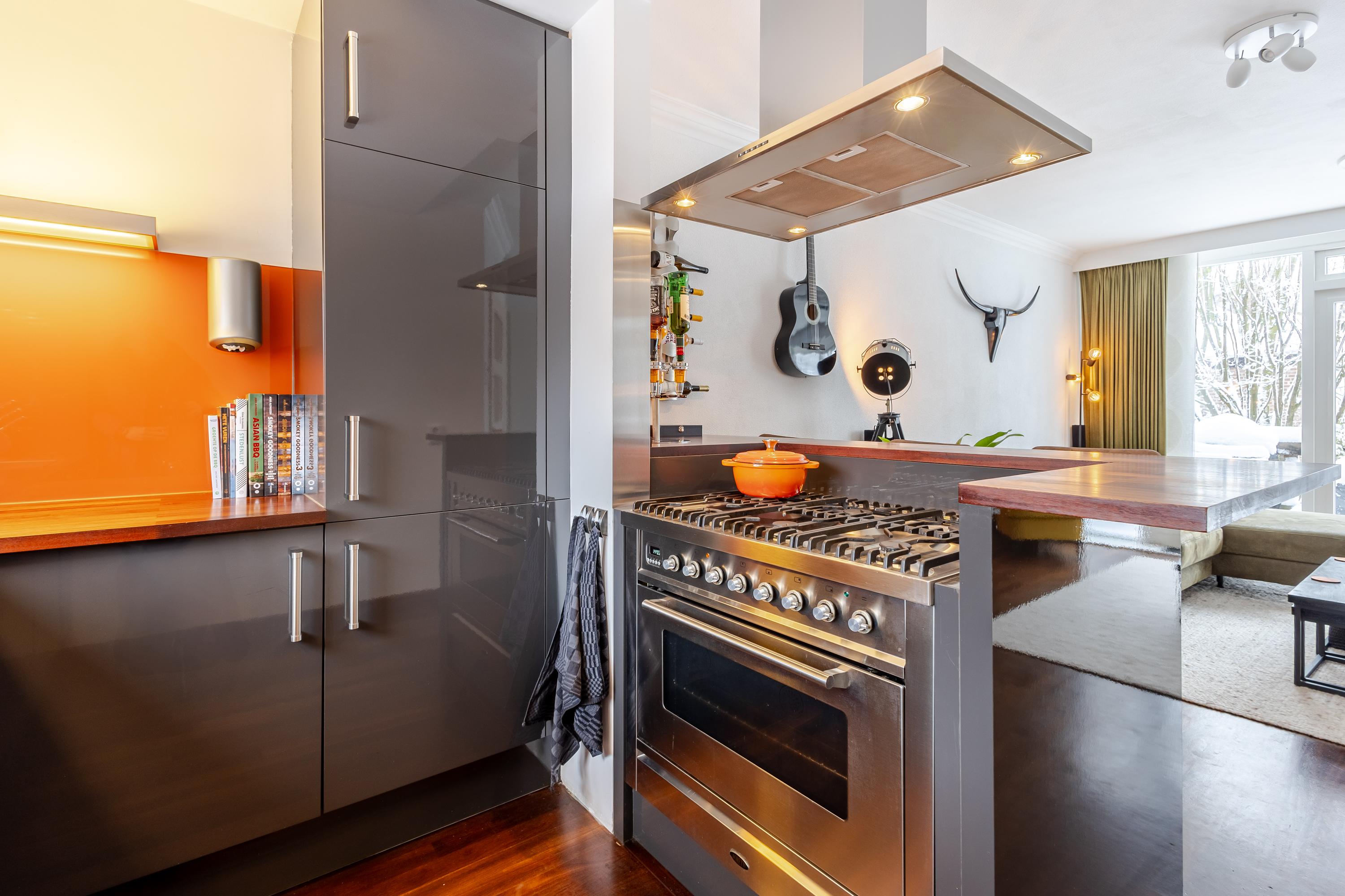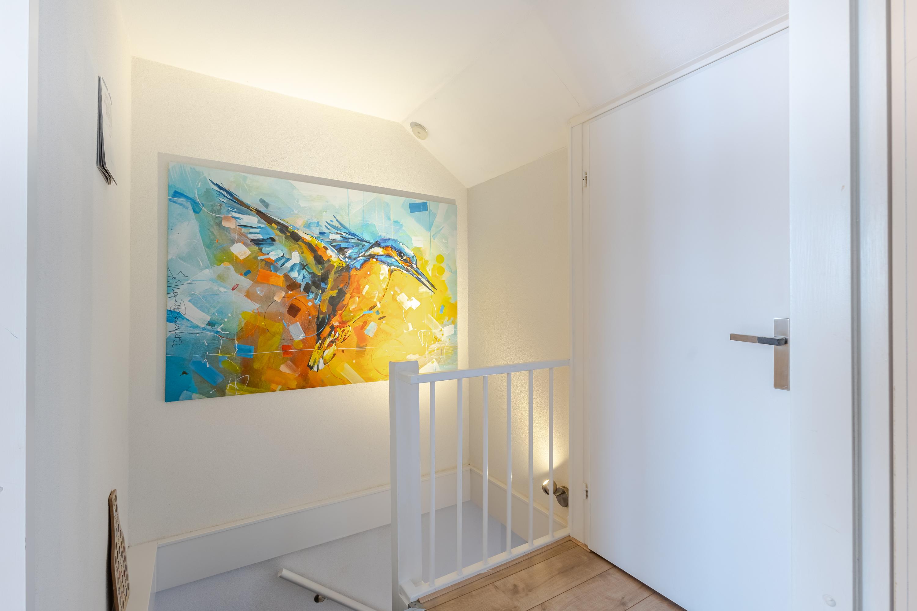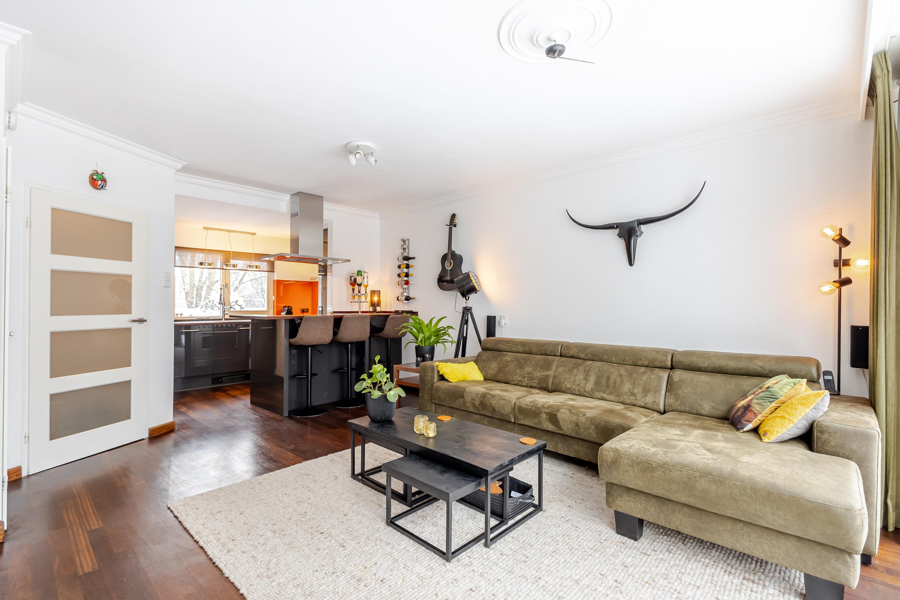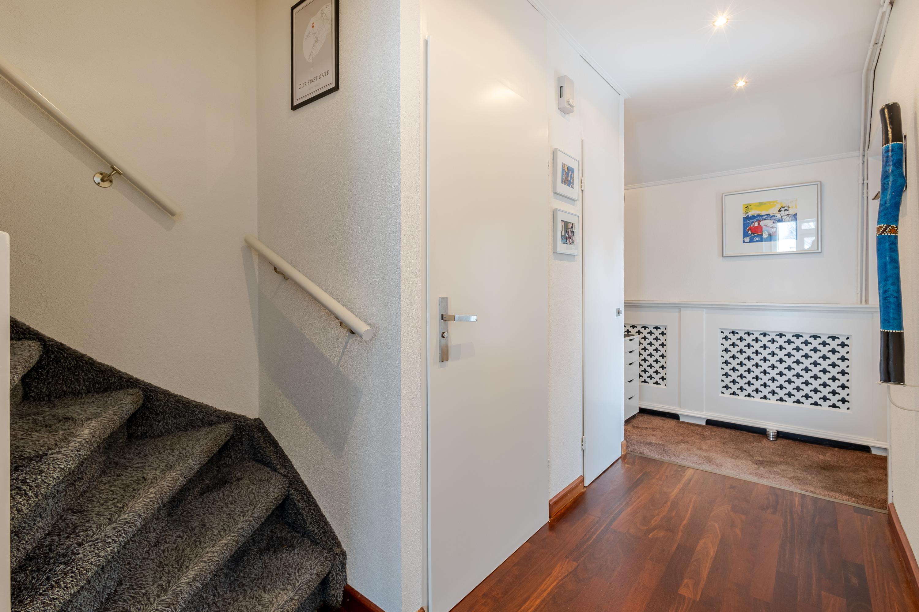 De entree van de woning bevindt zich op de eerste verdieping en is bereikbaar via een ruim terras aan de voorzijde. Bij binnenkomst geeft de ruime hal toegang tot de meterkast, het toilet, de trap naar de verdieping én de woonkamer. De woonkamer is ruim opgezet en door de grote ramen v.v. veel daglichtinval. De open keuken is efficiënt ingericht en v.v. diverse laden, kasten en inbouwapparatuur. En voor de échte kok: Wat te denken van de grote oven met 6 gasbranders? Aansluitend een gezellige bar met zitmogelijkheid voor 5 personen. Vanuit de woonkamer stap je zo het 2e terras op aan de achterzijde van de woning: een op het zuiden gelegen terras van ca. 16m2, perfect om lekker buiten te vertoeven en te genieten in én van de zon. Op de tweede verdieping bevinden zich 3 slaapkamers waarvan 1 als wasruimte in gebruik is. De 2 grootste slaapkamers zijn aan de achterzijde gesitueerd. Vanuit één van deze kamers is via een vlizotrap de bergzolder bereikbaar (nokhoogte. 1,44m). Op de bergzolder is de cv-opstelling en de omvormer van 8 zonnepanelen te vinden en daarnaast volop bergruimte voor niet-allerdaagse spullen! De badkamer bevindt zich aan de voorzijde en heeft door de dakkapel extra stahoogte. De badkamer is een echte eyecatcher en is v.v. een ligbad, douchecabine, 2e toilet, wastafelmeubel, designradiator en vloerverwarming. Het geheel is fraai afgewerkt met betonciré.