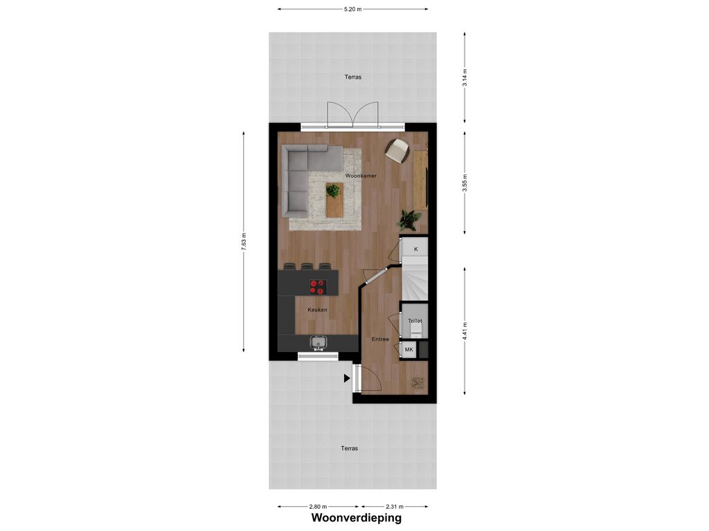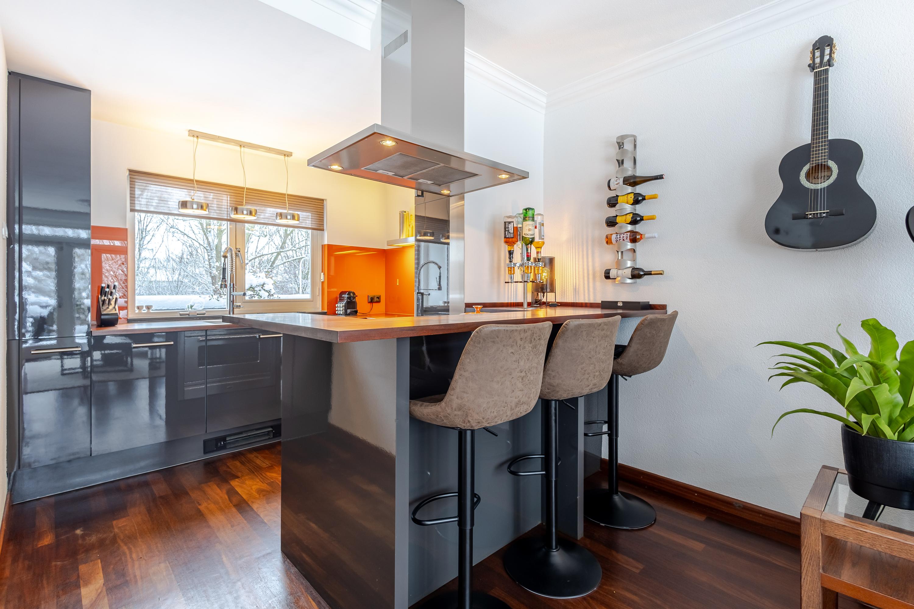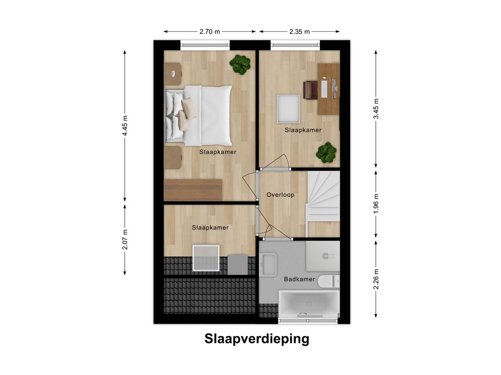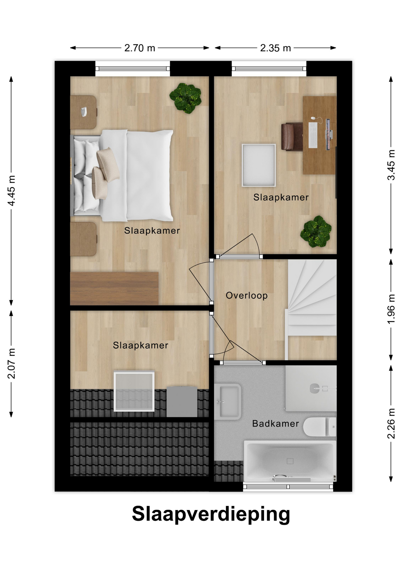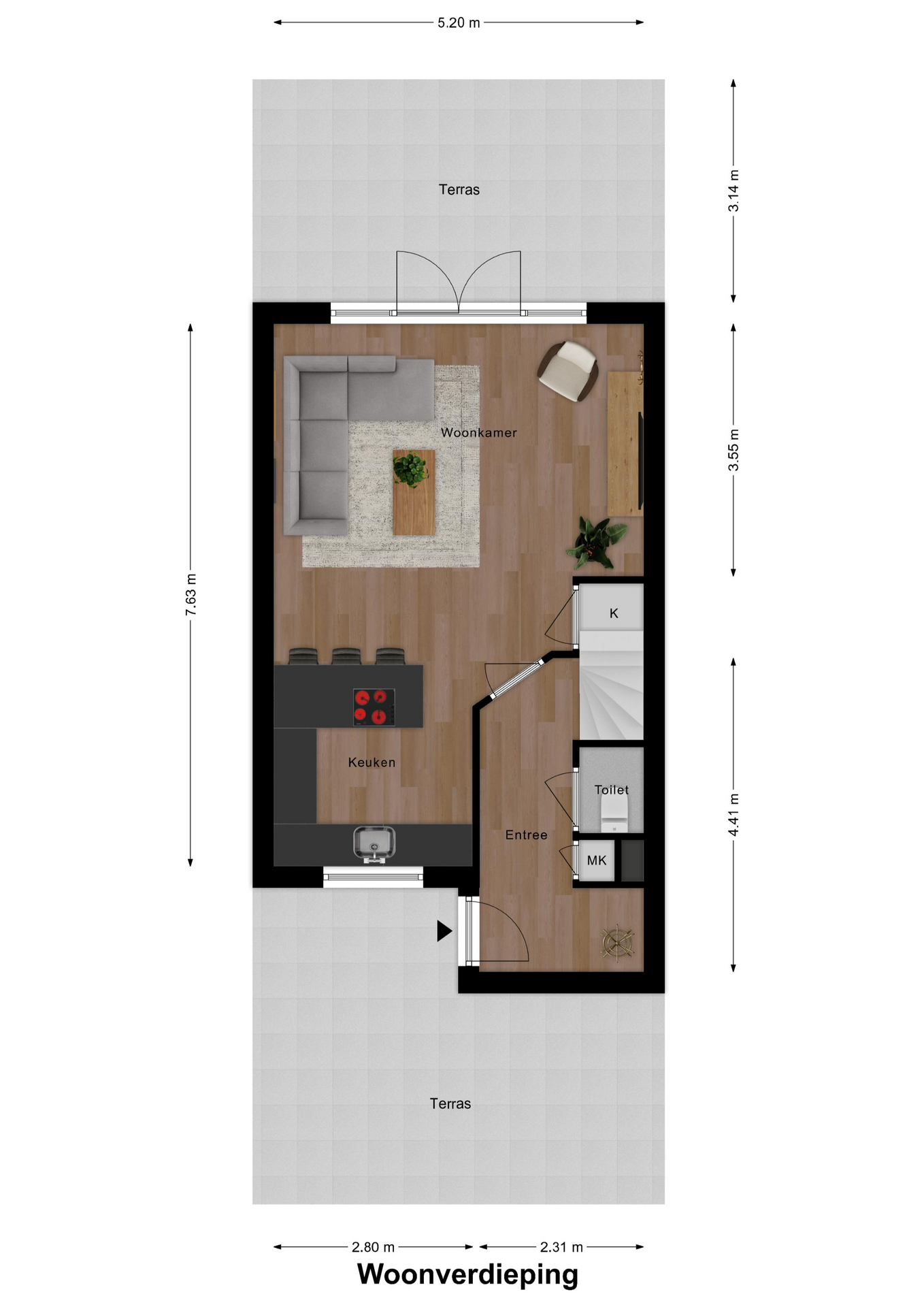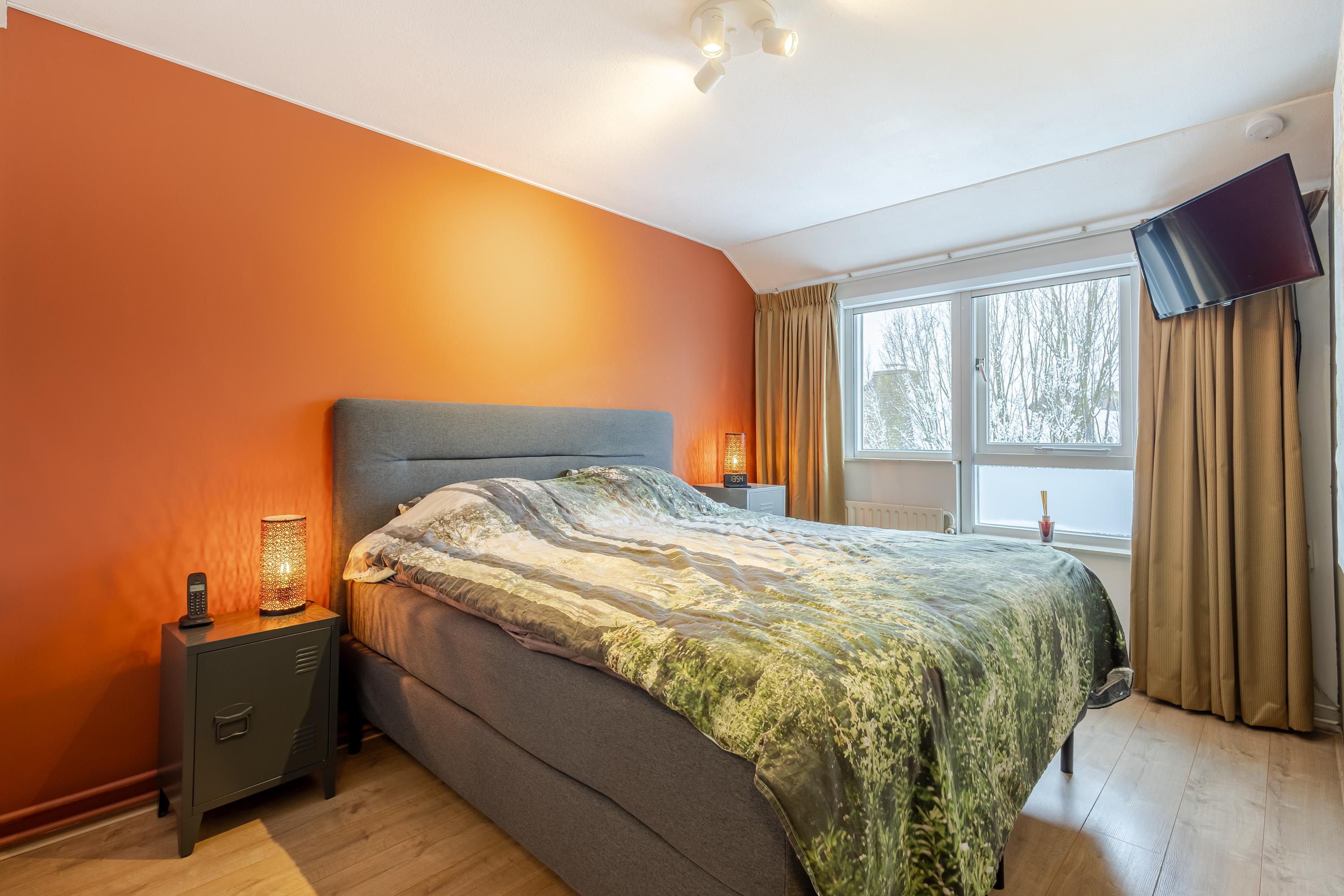 De entree van de woning bevindt zich op de eerste verdieping en is bereikbaar via een ruim terras aan de voorzijde. Bij binnenkomst geeft de ruime hal toegang tot de meterkast, het toilet, de trap naar de verdieping én de woonkamer. De woonkamer is ruim opgezet en door de grote ramen v.v. veel daglichtinval. De open keuken is efficiënt ingericht en v.v. diverse laden, kasten en inbouwapparatuur. En voor de échte kok: Wat te denken van de grote oven met 6 gasbranders? Aansluitend een gezellige bar met zitmogelijkheid voor 5 personen. Vanuit de woonkamer stap je zo het 2e terras op aan de achterzijde van de woning: een op het zuiden gelegen terras van ca. 16m2, perfect om lekker buiten te vertoeven en te genieten in én van de zon. Op de tweede verdieping bevinden zich 3 slaapkamers waarvan 1 als wasruimte in gebruik is. De 2 grootste slaapkamers zijn aan de achterzijde gesitueerd. Vanuit één van deze kamers is via een vlizotrap de bergzolder bereikbaar (nokhoogte. 1,44m). Op de bergzolder is de cv-opstelling en de omvormer van 8 zonnepanelen te vinden en daarnaast volop bergruimte voor niet-allerdaagse spullen! De badkamer bevindt zich aan de voorzijde en heeft door de dakkapel extra stahoogte. De badkamer is een echte eyecatcher en is v.v. een ligbad, douchecabine, 2e toilet, wastafelmeubel, designradiator en vloerverwarming. Het geheel is fraai afgewerkt met betonciré.