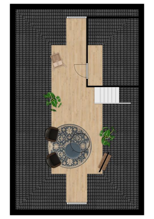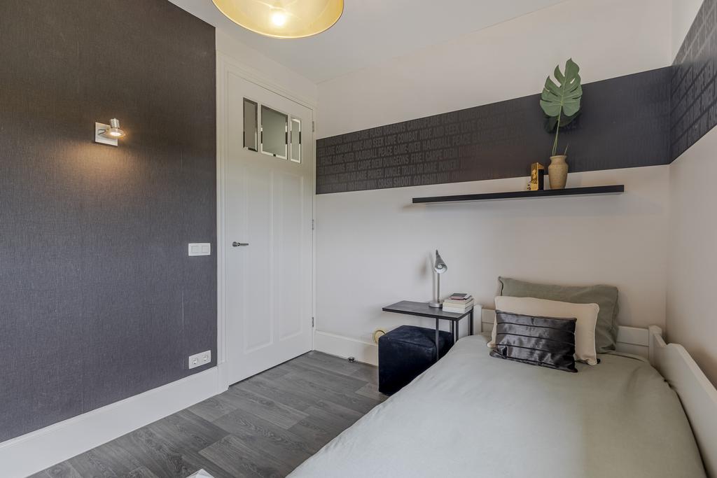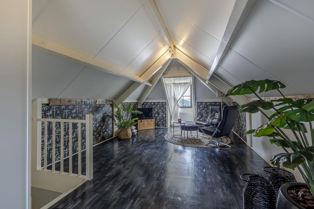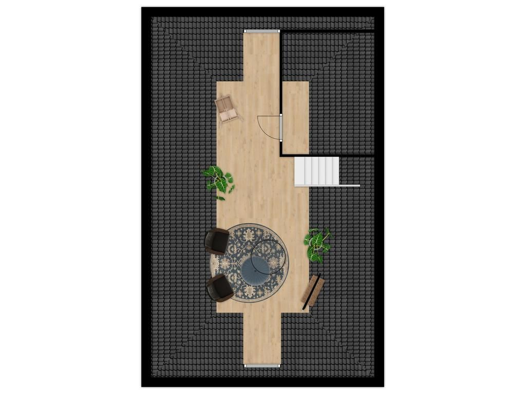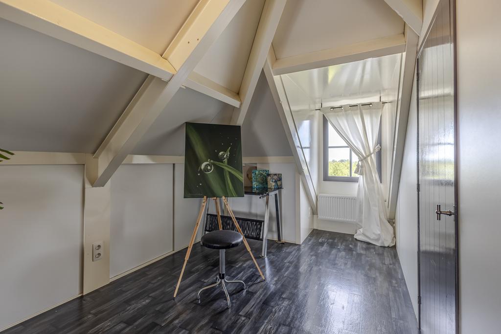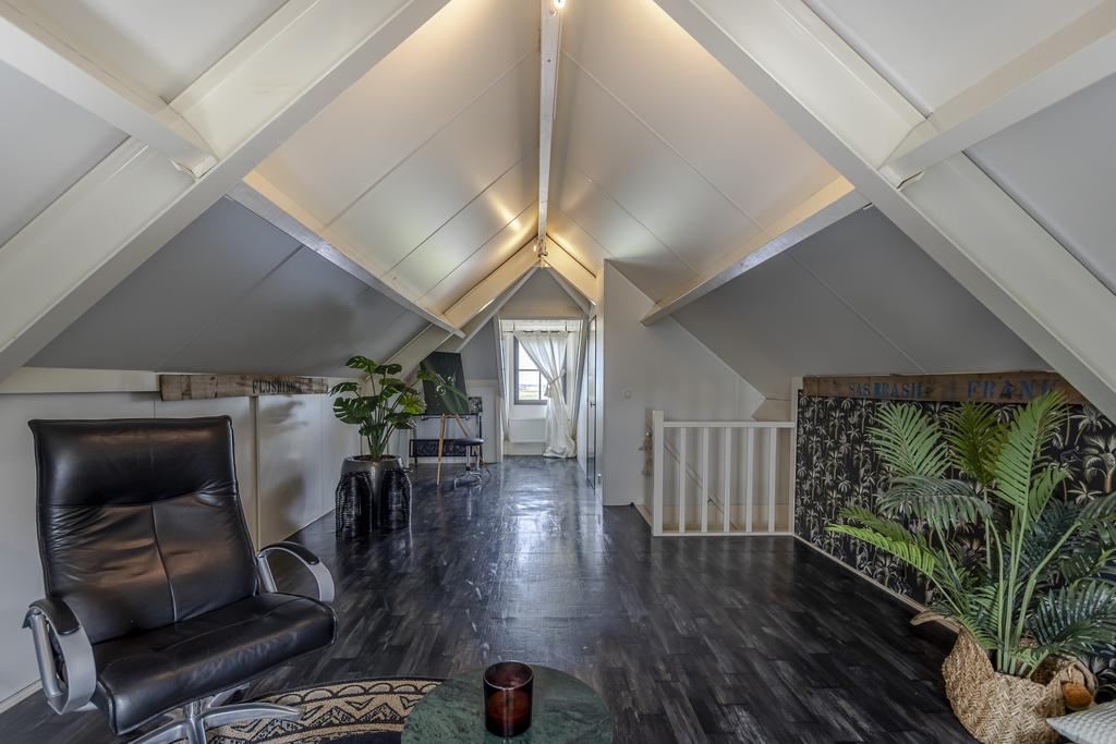 De hal met trapopgang loopt als een rechte ader over de begane grond en daardoor is er een privacy-volle scheiding tussen woonkamer en (eet)keuken. De complete keuken in duo-opstelling ligt aan de voorzijde van de woning. De L-vormige woonkamer met haard komt uit op het aangebouwde balkon en geeft toegang tot de bijkeuken. Op de verdieping zijn 3 slaapkamers (de ouderslaapkamer met walk-in-closet), een complete badkamer en een separaat toilet. De badkamer is v.v. een ligbad, separate douche en dubbele wastafel. Op de 2e verdieping, eigenlijk meer een loft, is nog een 4e slaapkamer met knieschotbergingen. De cv-opstelling is gesitueerd in een afsluitbare kast met extra bergruimte.