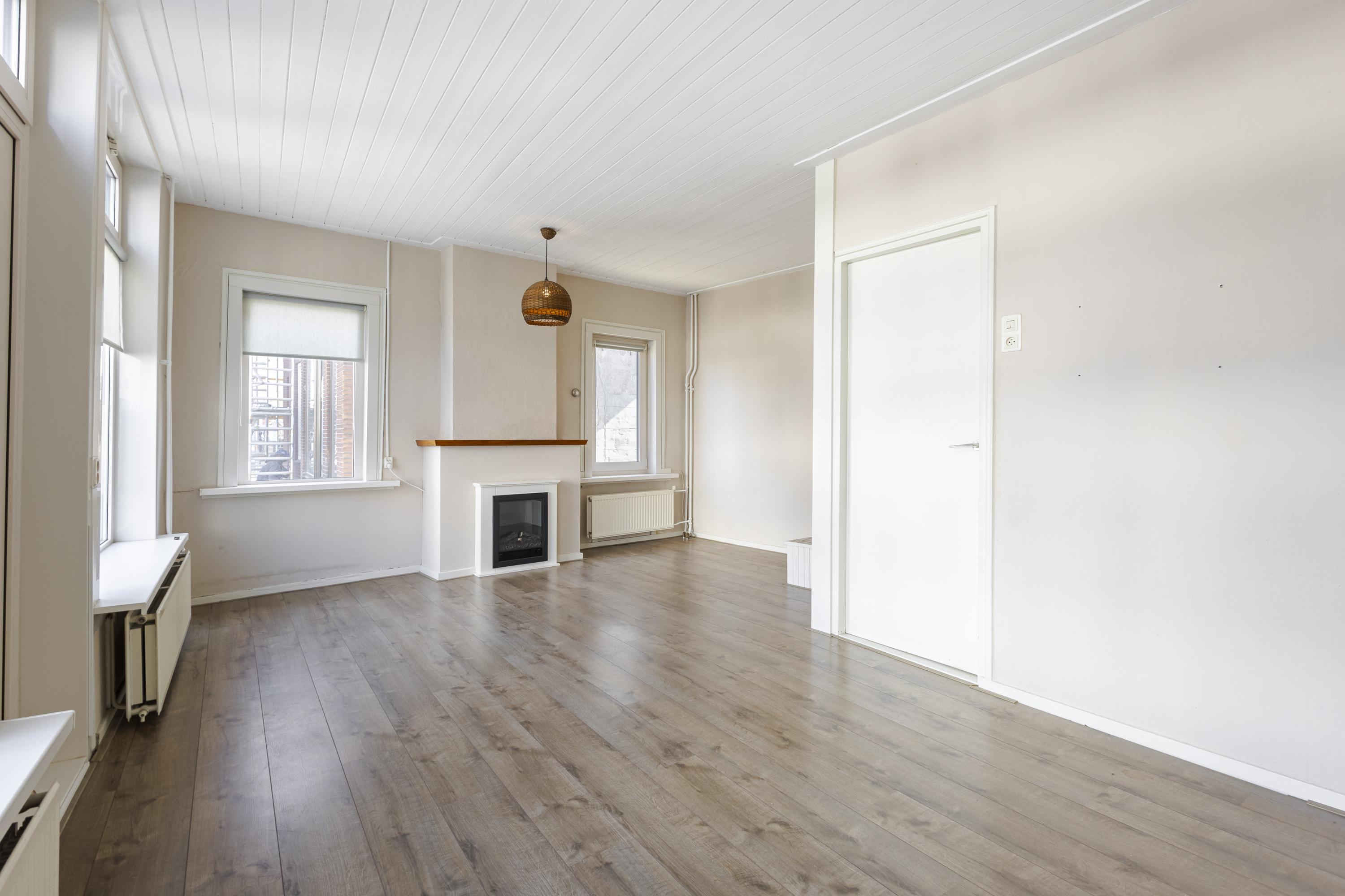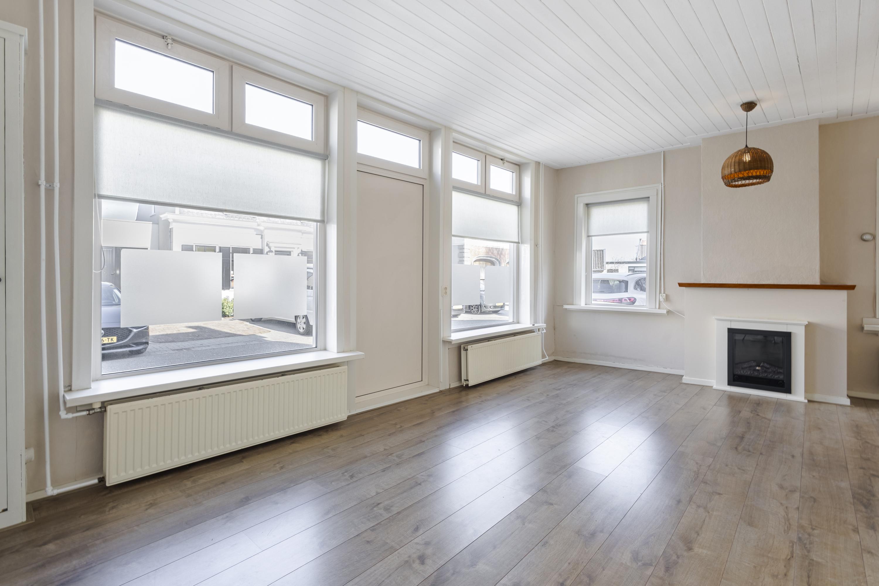 De woonkamer ligt aan de voorzijde van de woning en is dankzij de diverse raampartijen aangenaam licht. Hier bevinden zich ook de meterkast en de trapopgang naar de eerste verdieping.