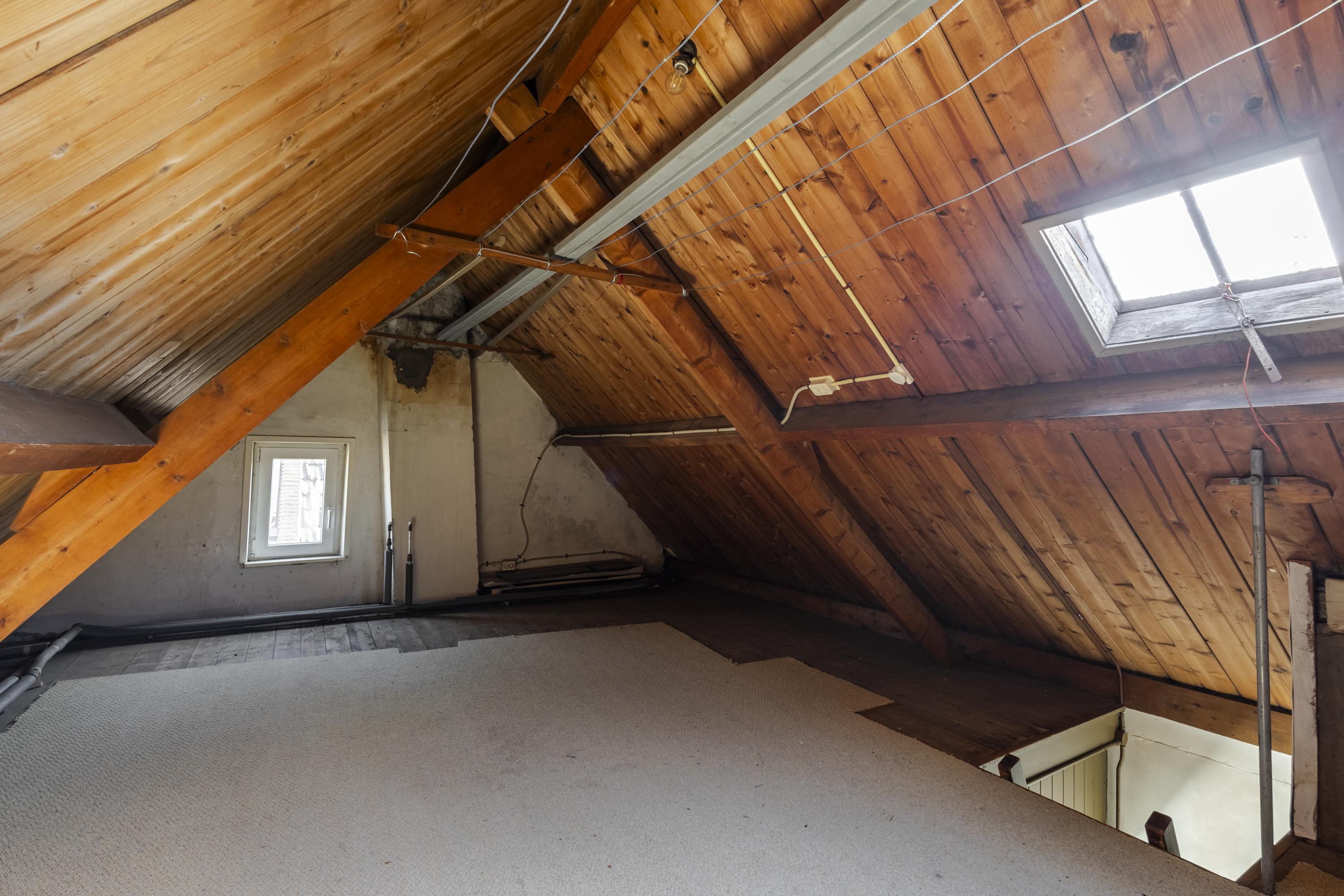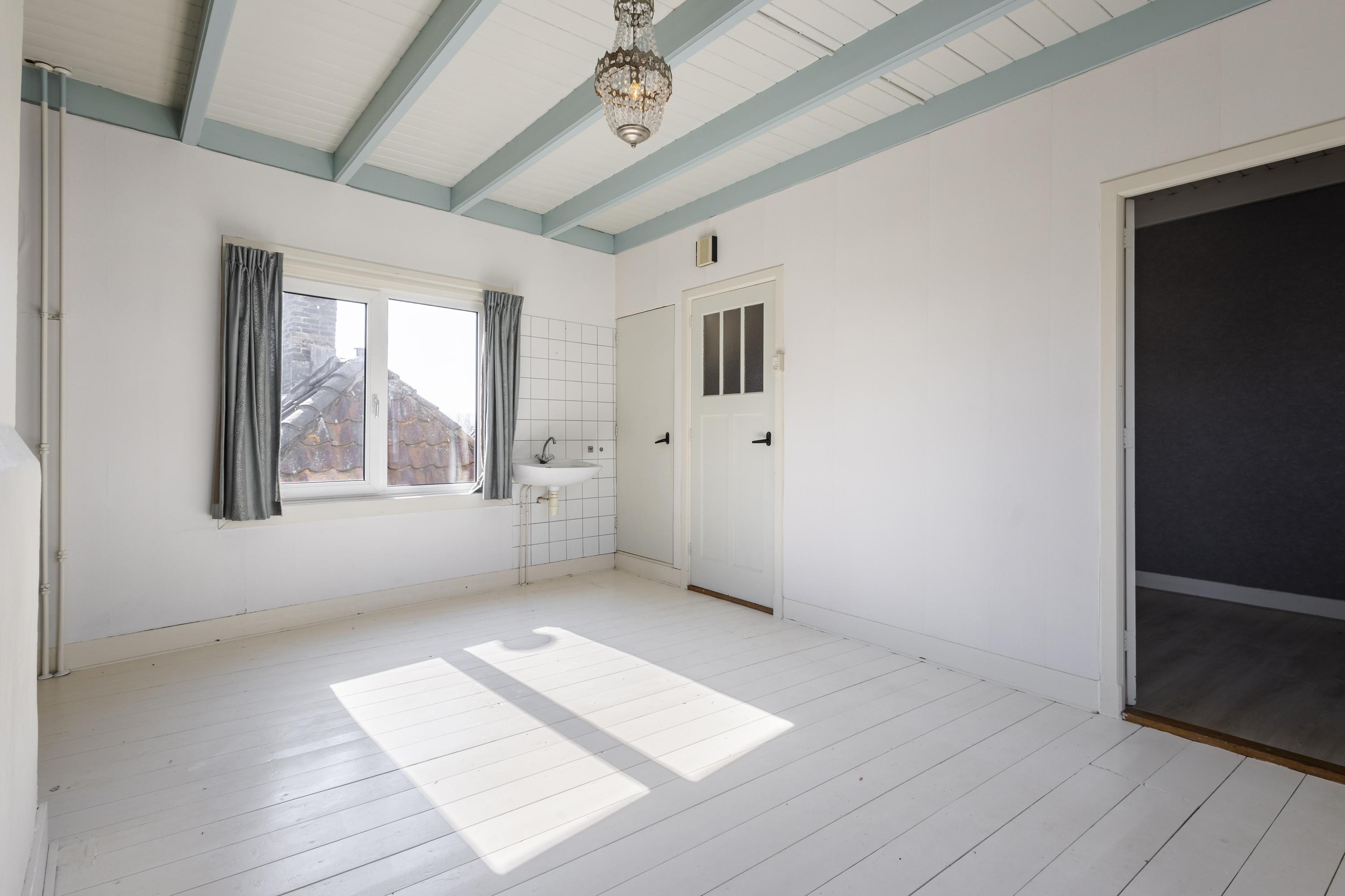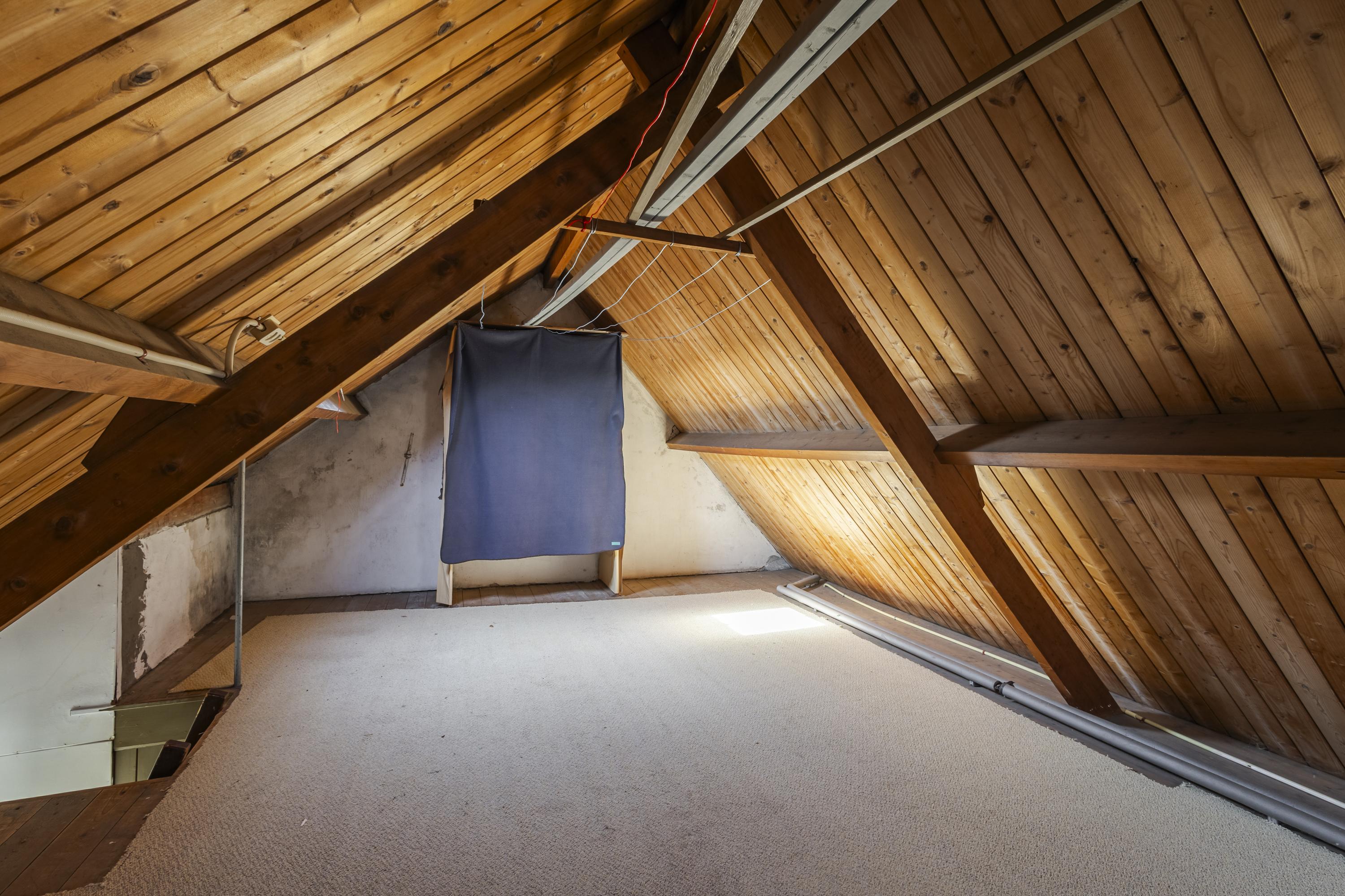 Op de eerste verdieping vind je twee kamers en een portaal met toegang tot de zolder via een losse trap. De tweede kamer is bereikbaar via de hoofdslaapkamer en kan uitstekend dienen als werk- of hobbykamer. De zolderverdieping heeft een maximale stahoogte van circa 2,30 meter en biedt extra mogelijkheden.