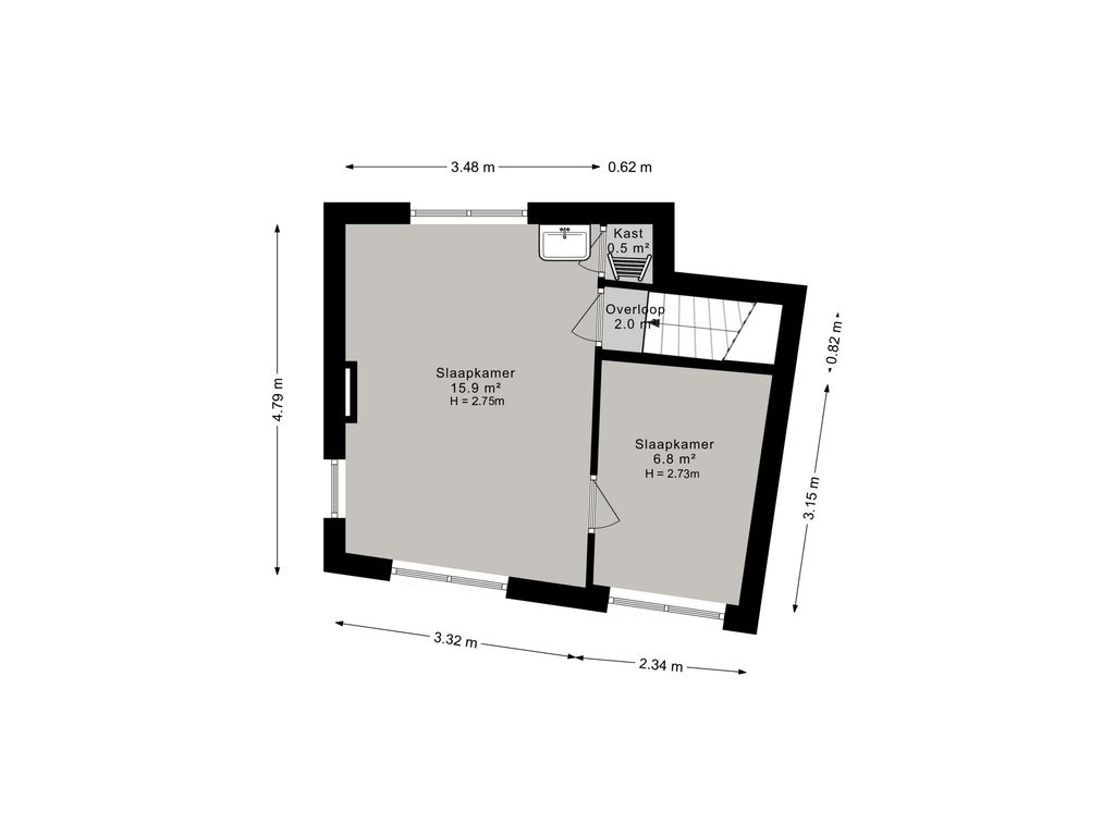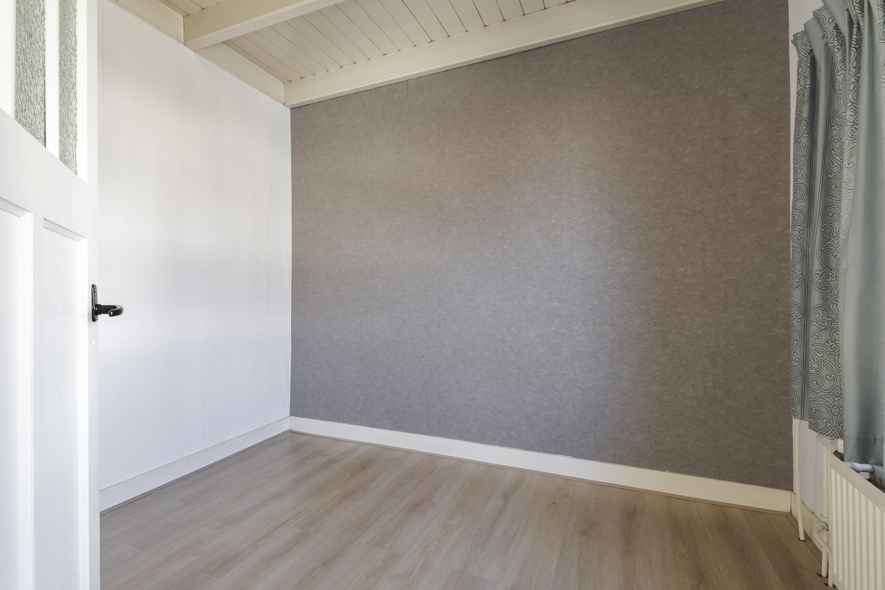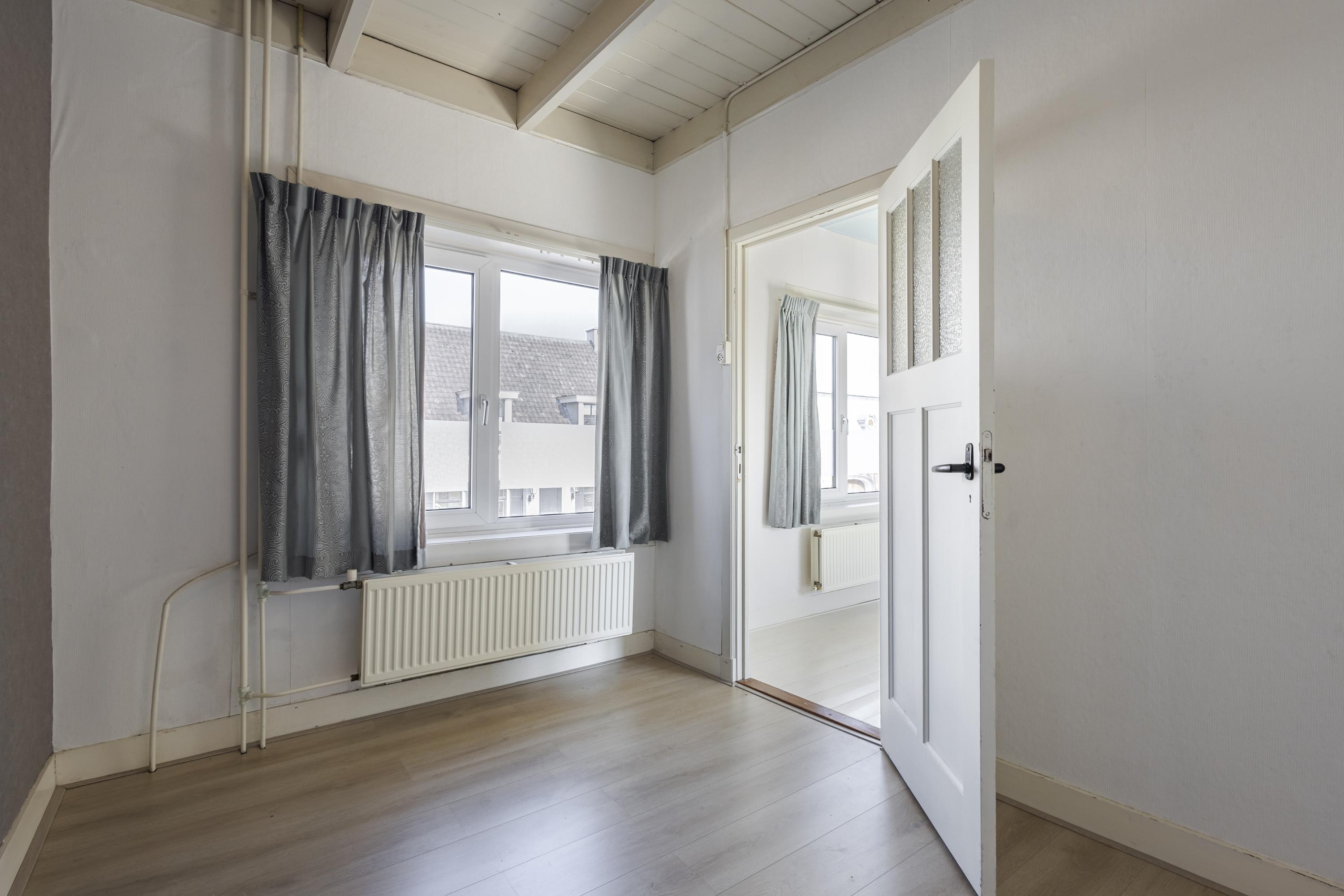 Op de eerste verdieping vind je twee kamers en een portaal met toegang tot de zolder via een losse trap. De tweede kamer is bereikbaar via de hoofdslaapkamer en kan uitstekend dienen als werk- of hobbykamer. De zolderverdieping heeft een maximale stahoogte van circa 2,30 meter en biedt extra mogelijkheden.