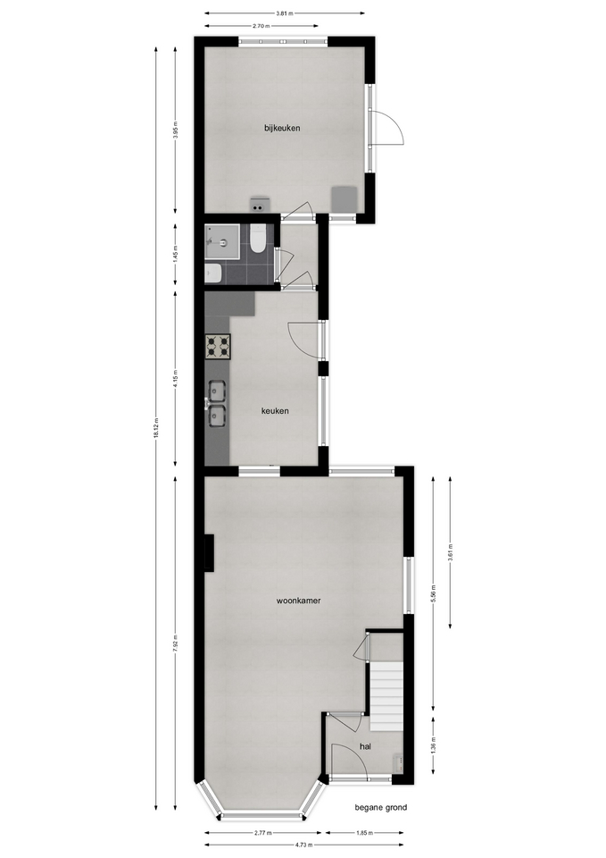 Naast de hal, woonkamer en keuken vinden we aan de achterzijde van de woning een badkamer en een grote bijkeuken die voor verschillende doeleinden ingericht/gebruikt kan worden. Boven zijn 3 slaapkamers en een grote bergzolder. De totale woonoppervlakte beslaat 99 m2.