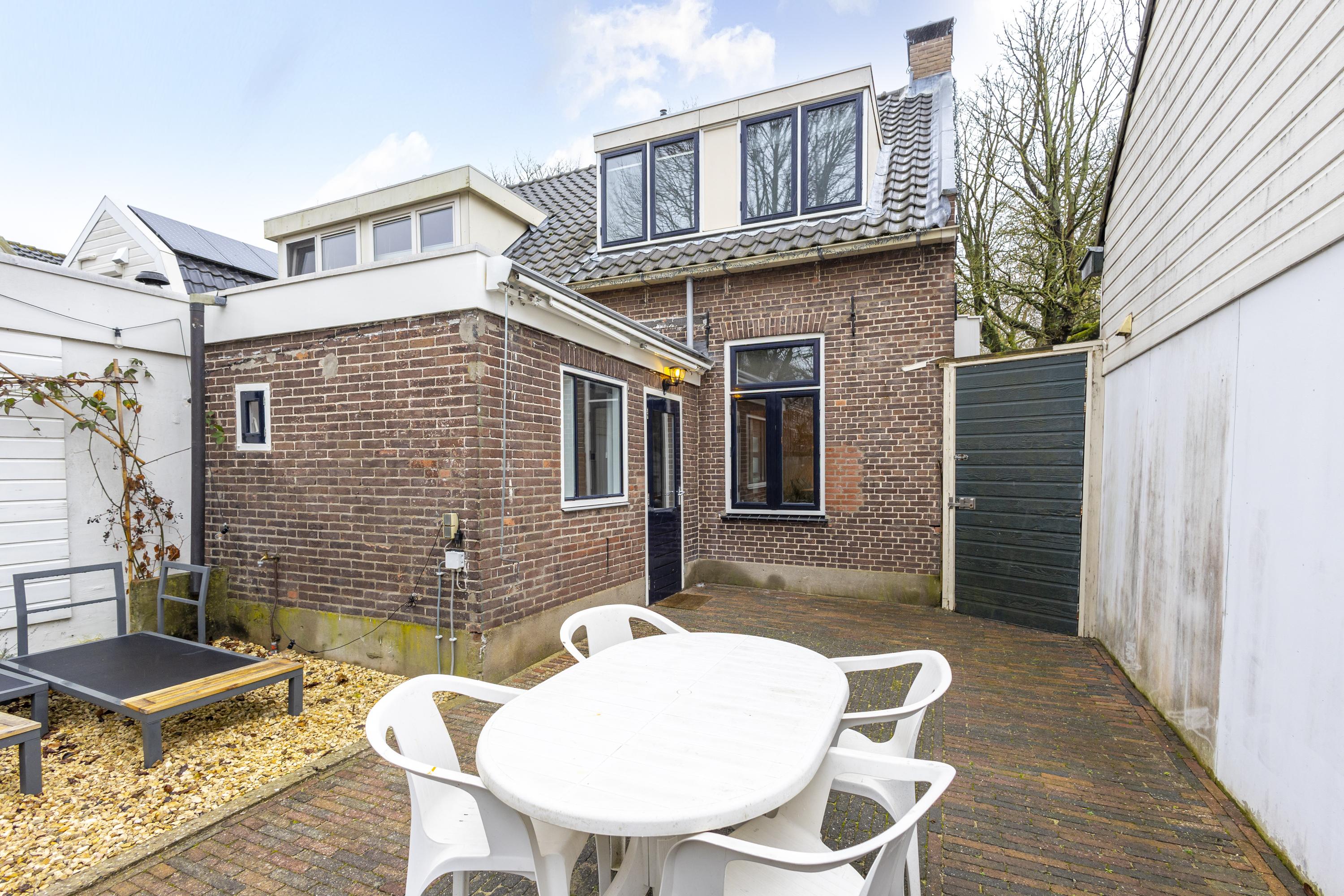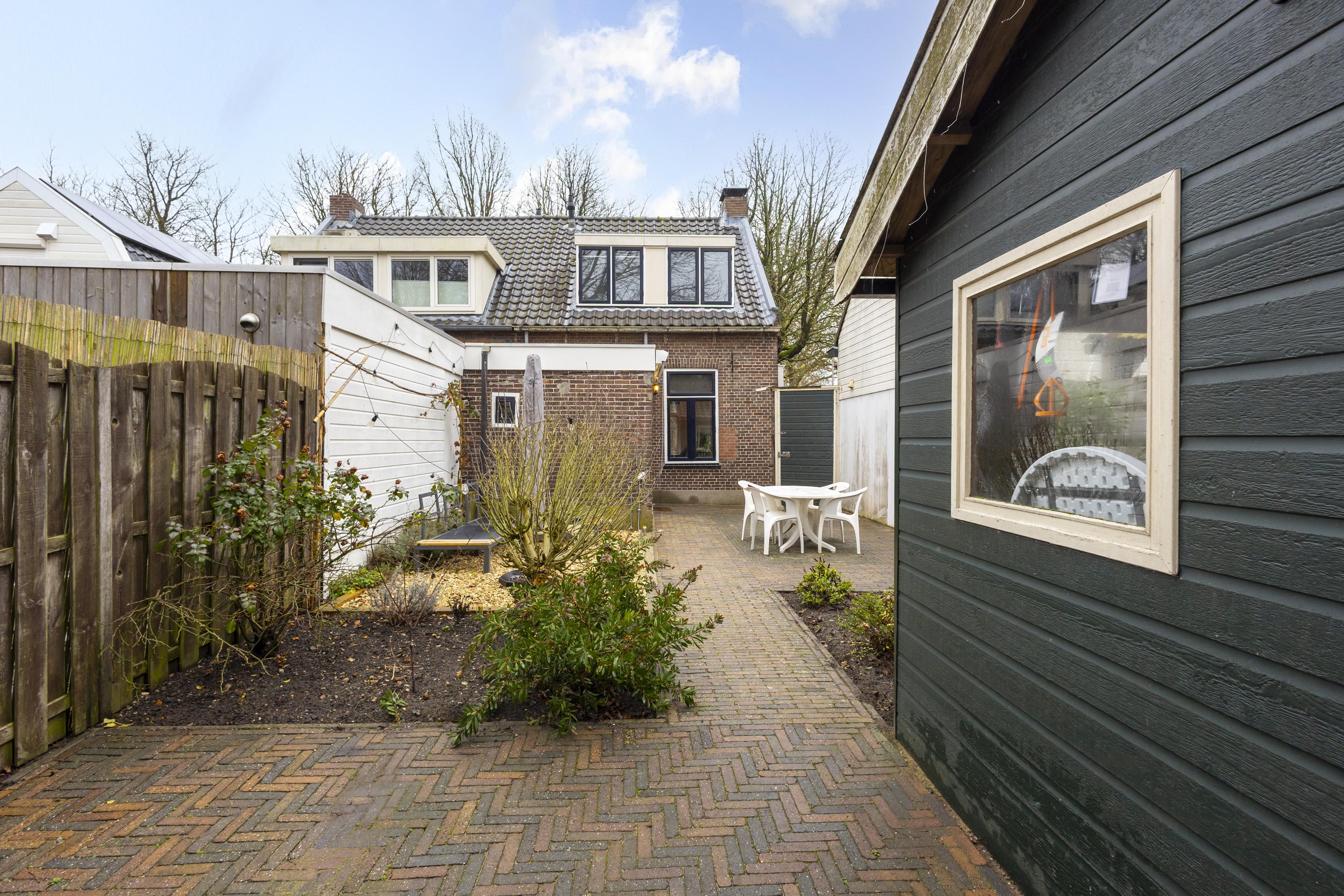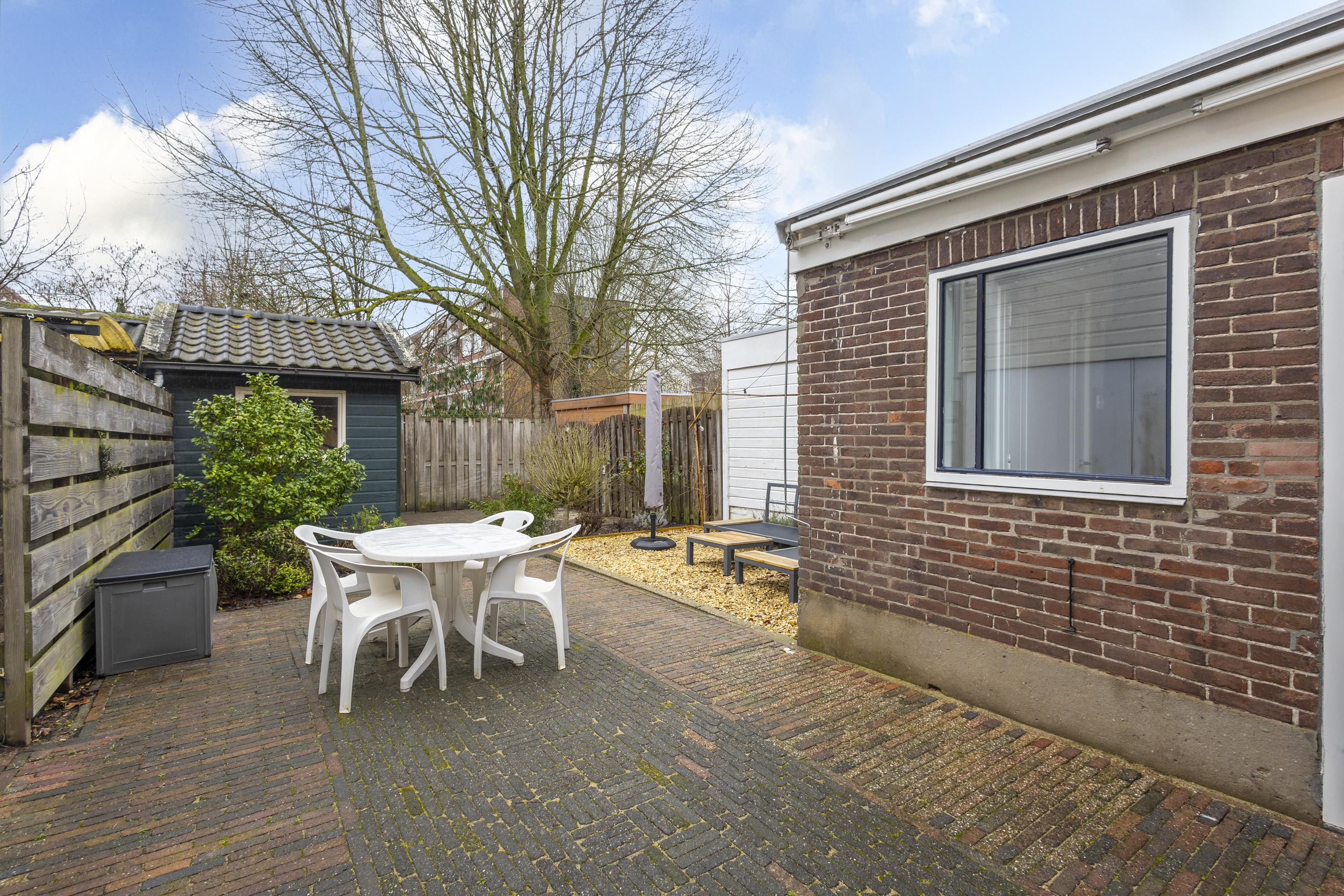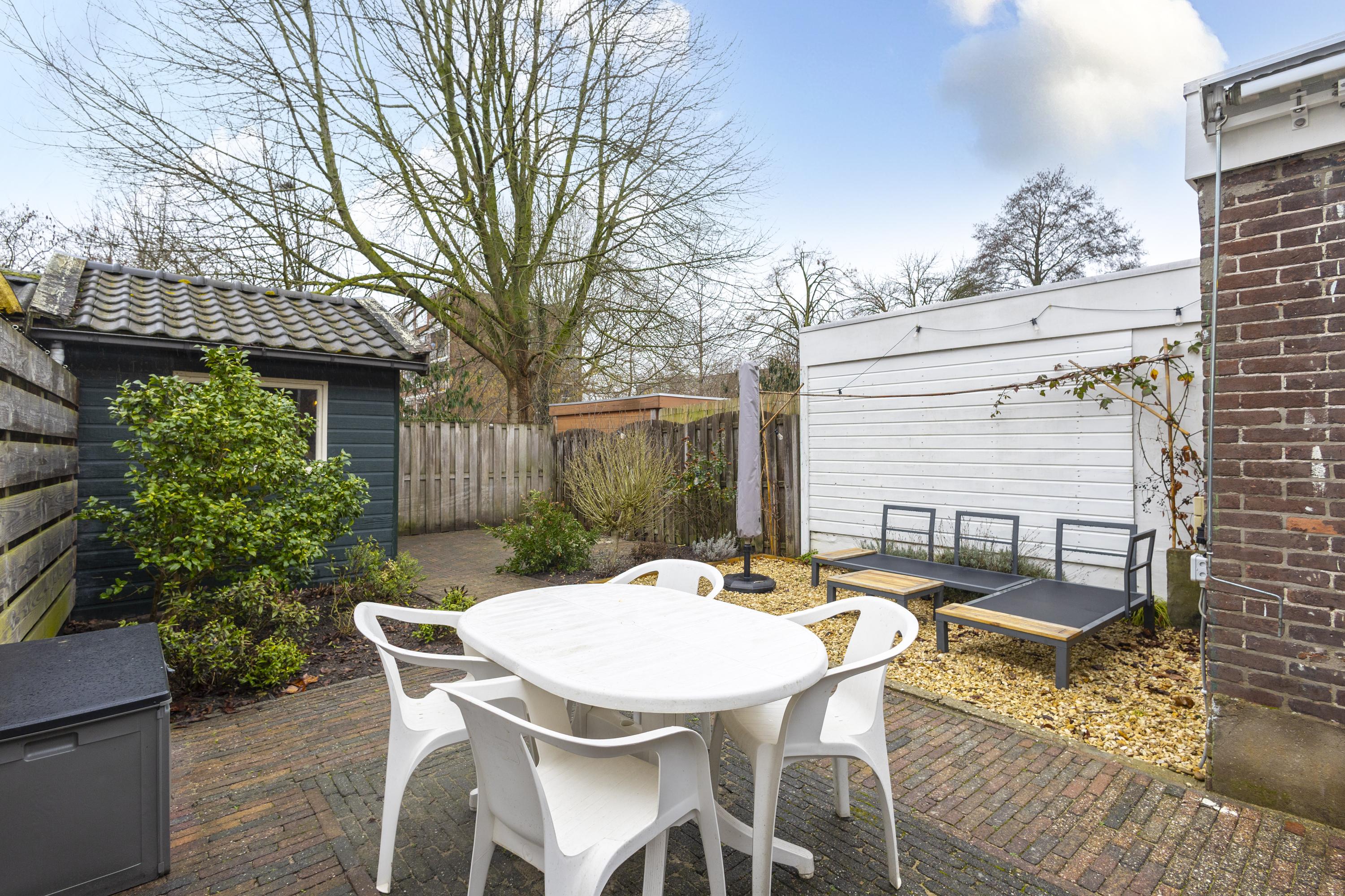De achtertuin is gelegen op het westen: hier geniet je fijn van de middag- en avondzon. De tuin is ingericht met sierstraatwerk, een ruim terras, diverse soorten (groen)beplanting en een vrijstaande berging. Het achterom maakt het plaatje compleet.