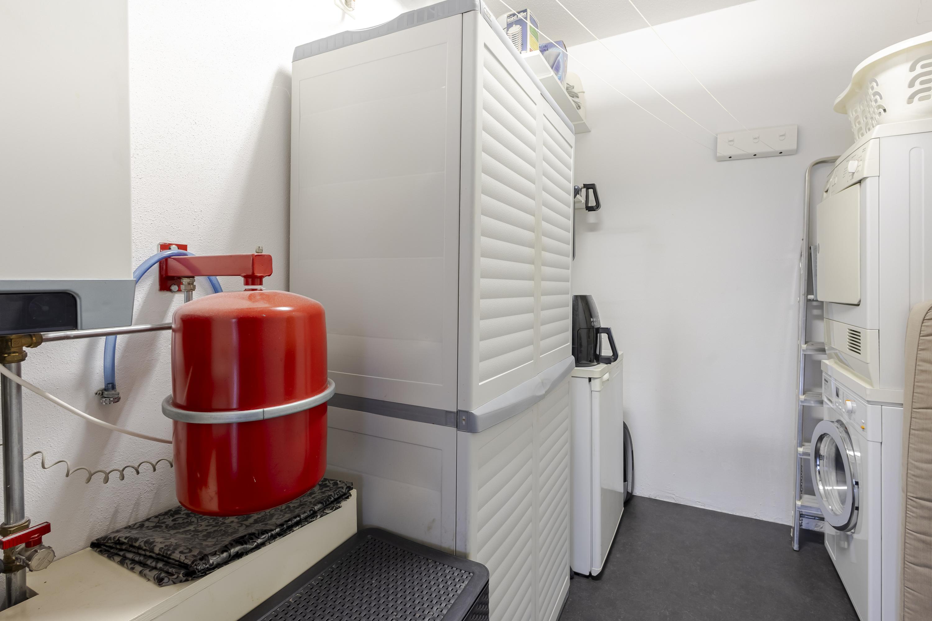 De badkamer is royaal opgezet en uitgevoerd met twee douchegelegenheden, een dubbel wastafelmeubel en een toilet. Daarnaast is er een separaat toilet bereikbaar vanuit de hal. De keuken is netjes, compleet en praktisch ingericht. Aangrenzend bevindt zich een bijkeuken met extra bergruimte en plaats voor het witgoed en de cv-installatie.