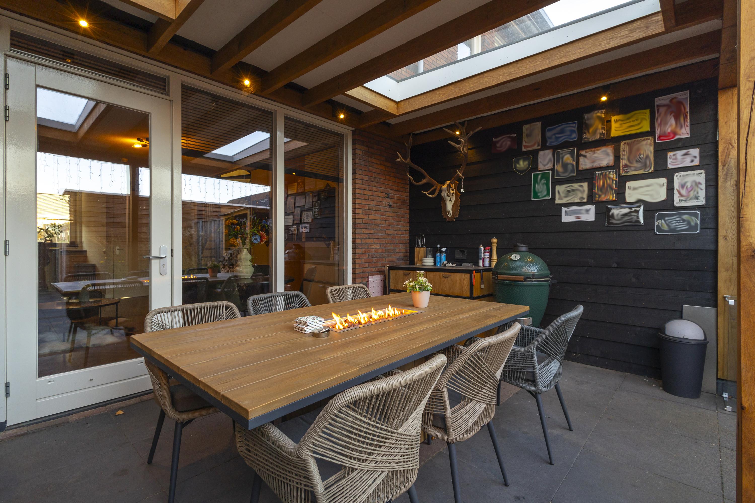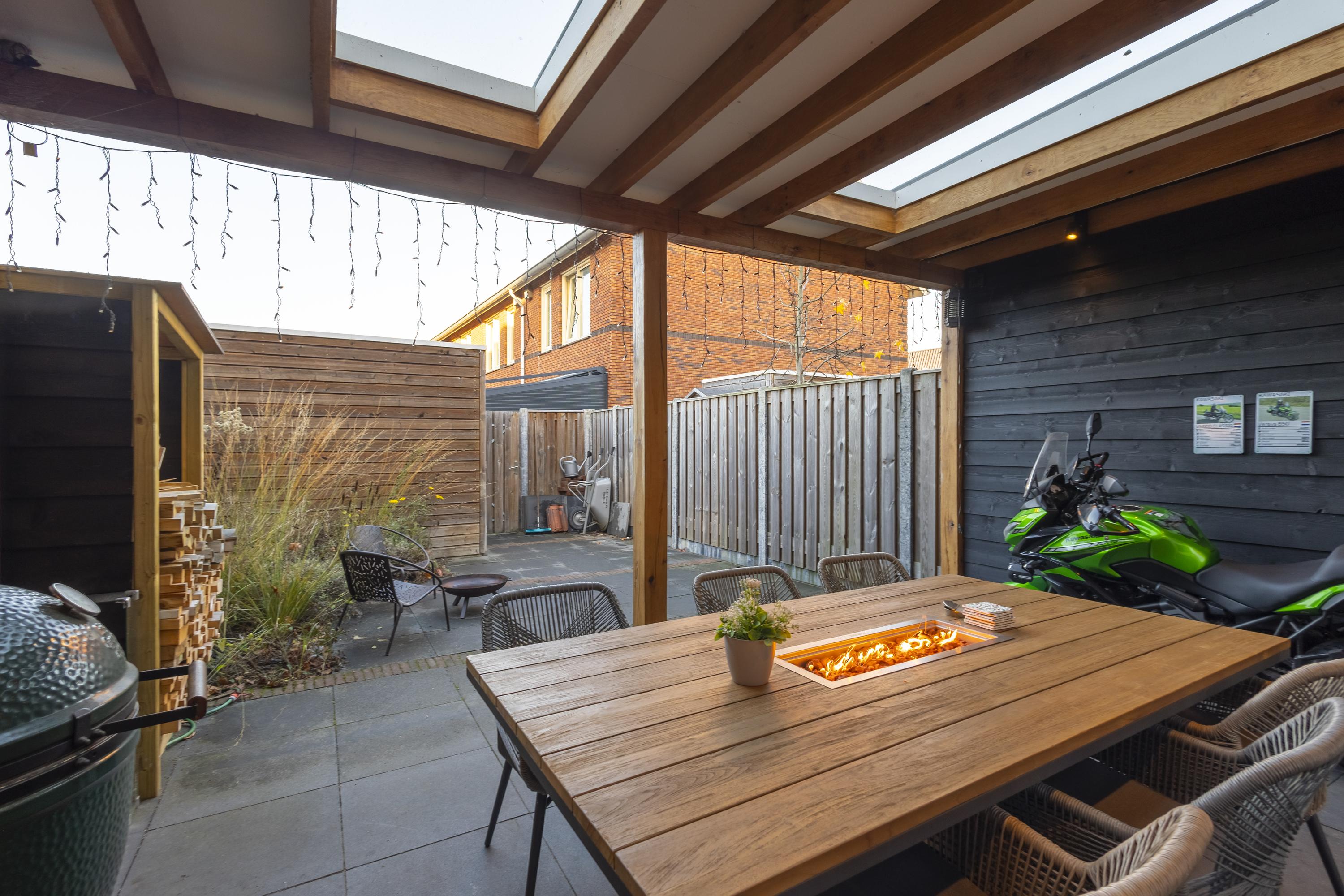 De tuin achter de woning vormt een verlengstuk van het huis. De tuin is onderhoudsvriendelijk aangelegd, compleet met een sfeervolle overkapping (ca. 3,20 x 5,05m) v.v. 2 lichtkoepels en mogelijkheid voor een buitenkeuken. Dé plek om samen met familie en vrienden van lange zomeravonden te genieten.
