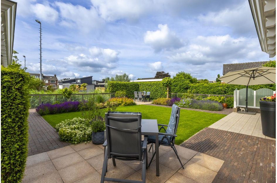 De recent aangelegde siertuin aan de achterzijde is werkelijk een plaatje. Geniet van een onderheid terras, ambachtelijk straatwerk met gebakken klinkers, weelderige bloemenperken, strakke buxus- en taxushagen, en een sfeervol hardhouten vlonder aan het water met eveneens hardhouten beschoeiing. Deze tuin is met zorg en visie ontworpen – een droom voor tuinliefhebbers én levensgenieters.