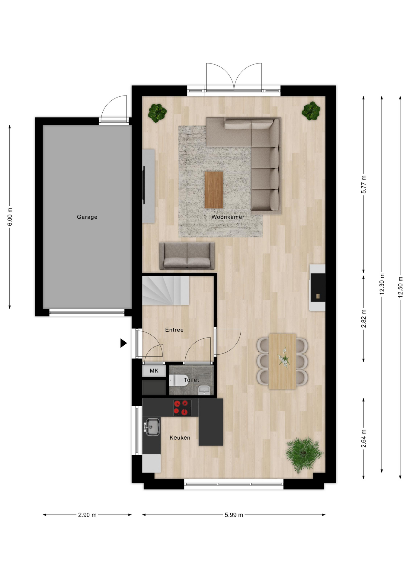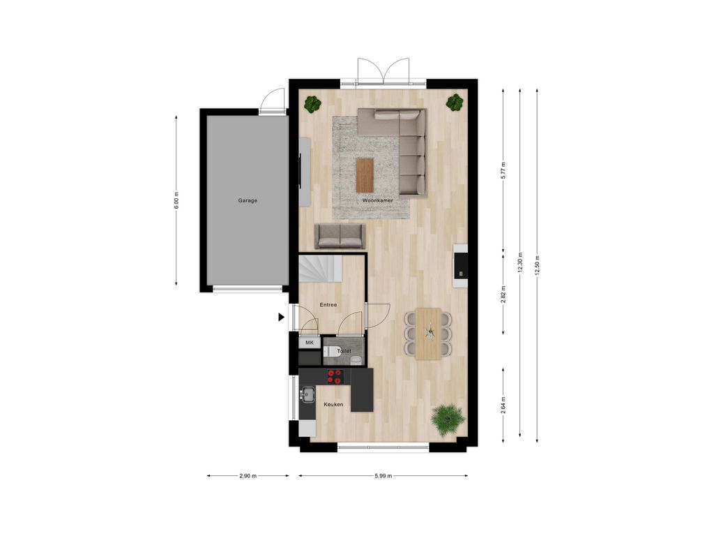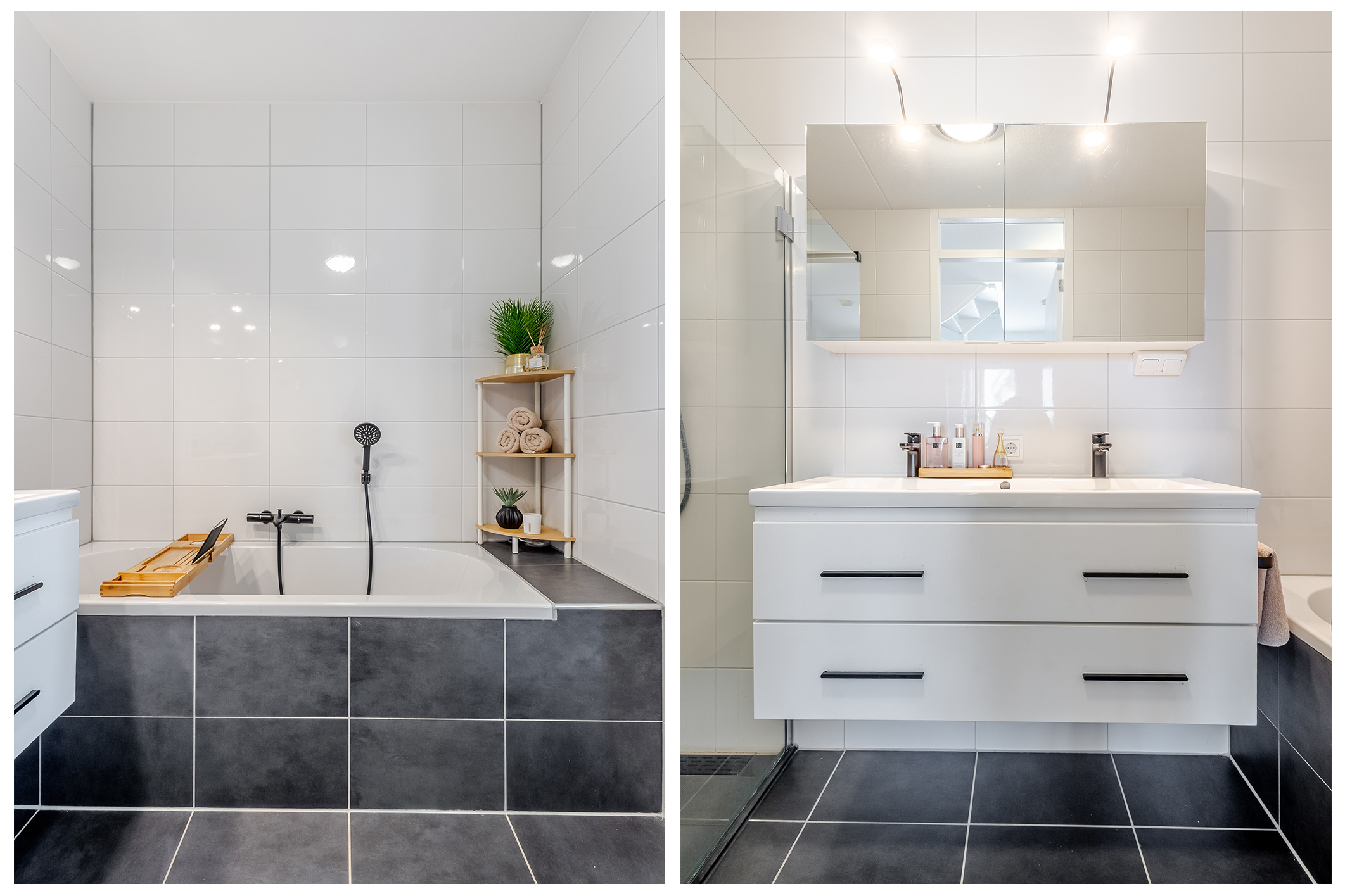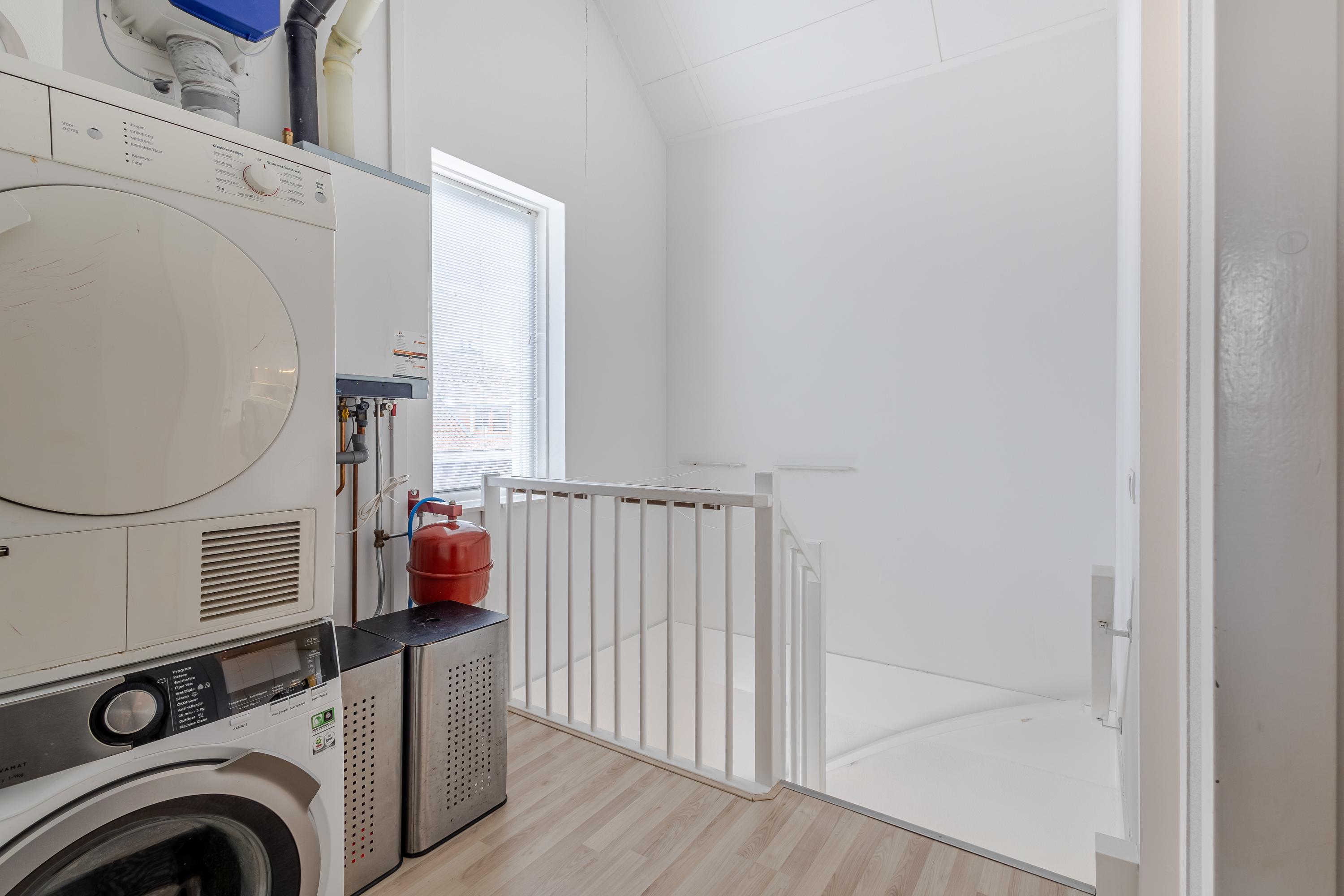 De begane grond biedt een ruime en praktische indeling met een open keuken die naadloos aansluit op de eet- en woonkamer. De woning is tijdens de bouw direct 2 meter uitgebouwd, wat zorgt voor extra leefruimte en een lichte, open sfeer. De tijdloze keuken is gelegen aan de voorzijde van de woning, is van alle gemakken voorzien en biedt genoeg ruimte voor een eetbar of een grote eettafel. De fikse raampartij zorgt voor heel veel lichtinval.