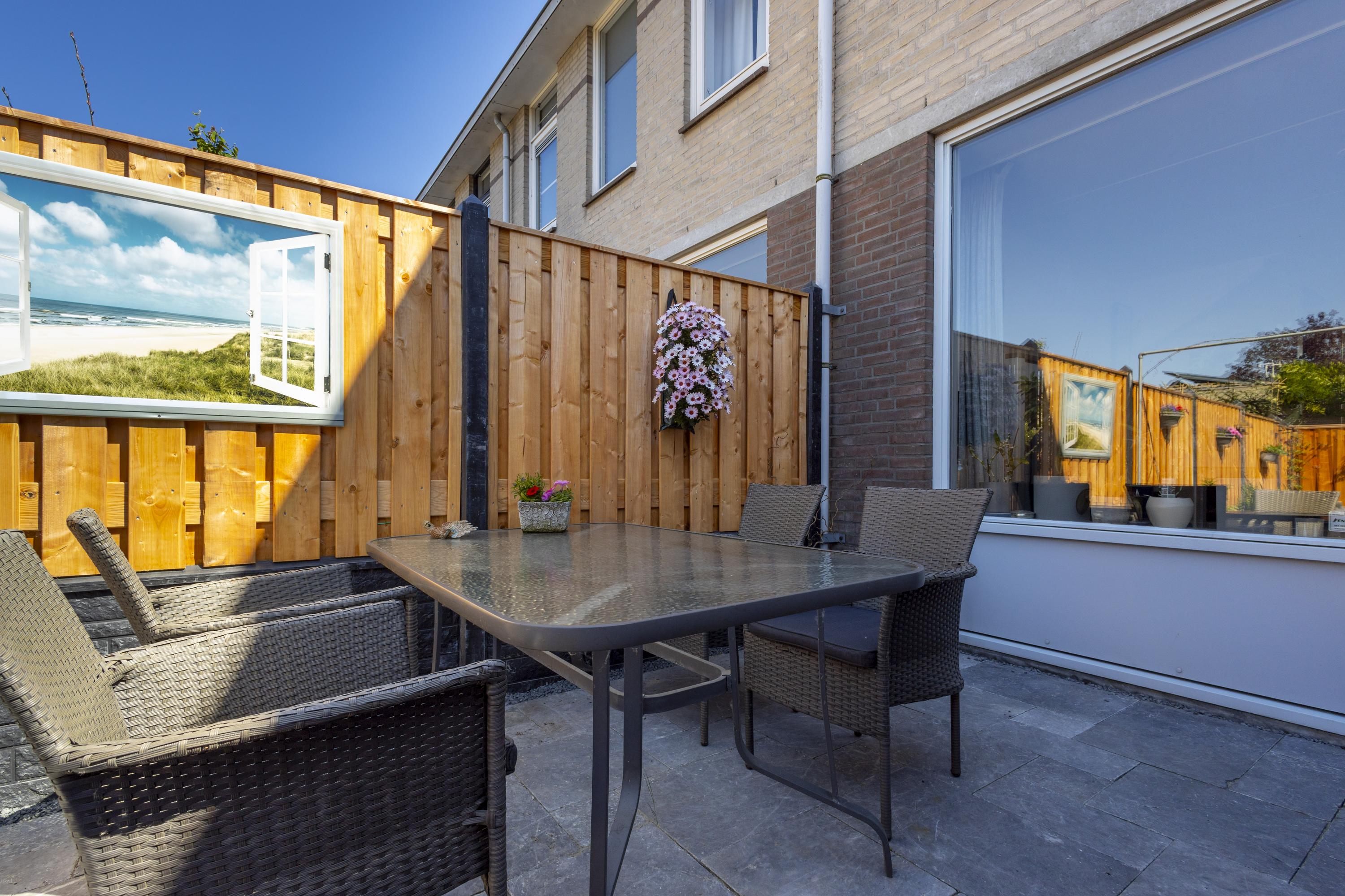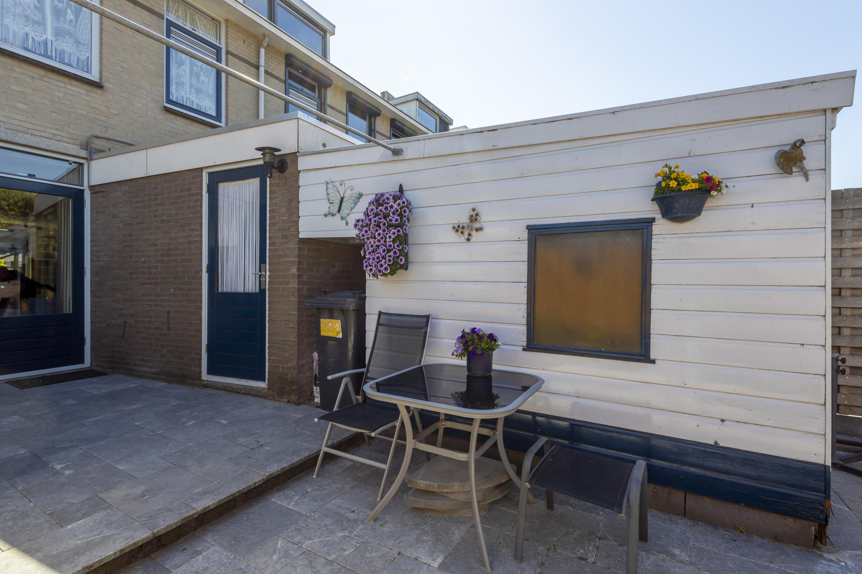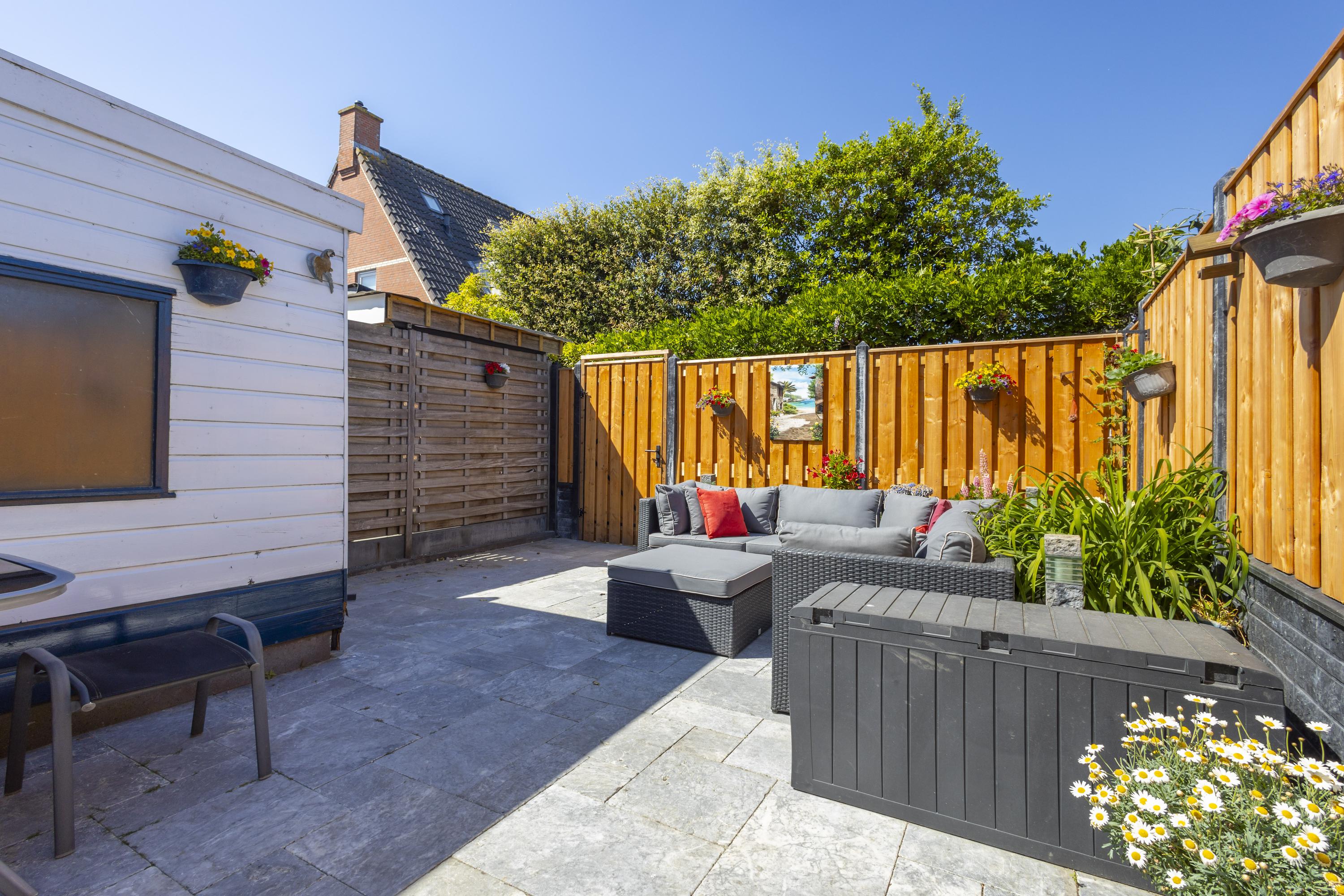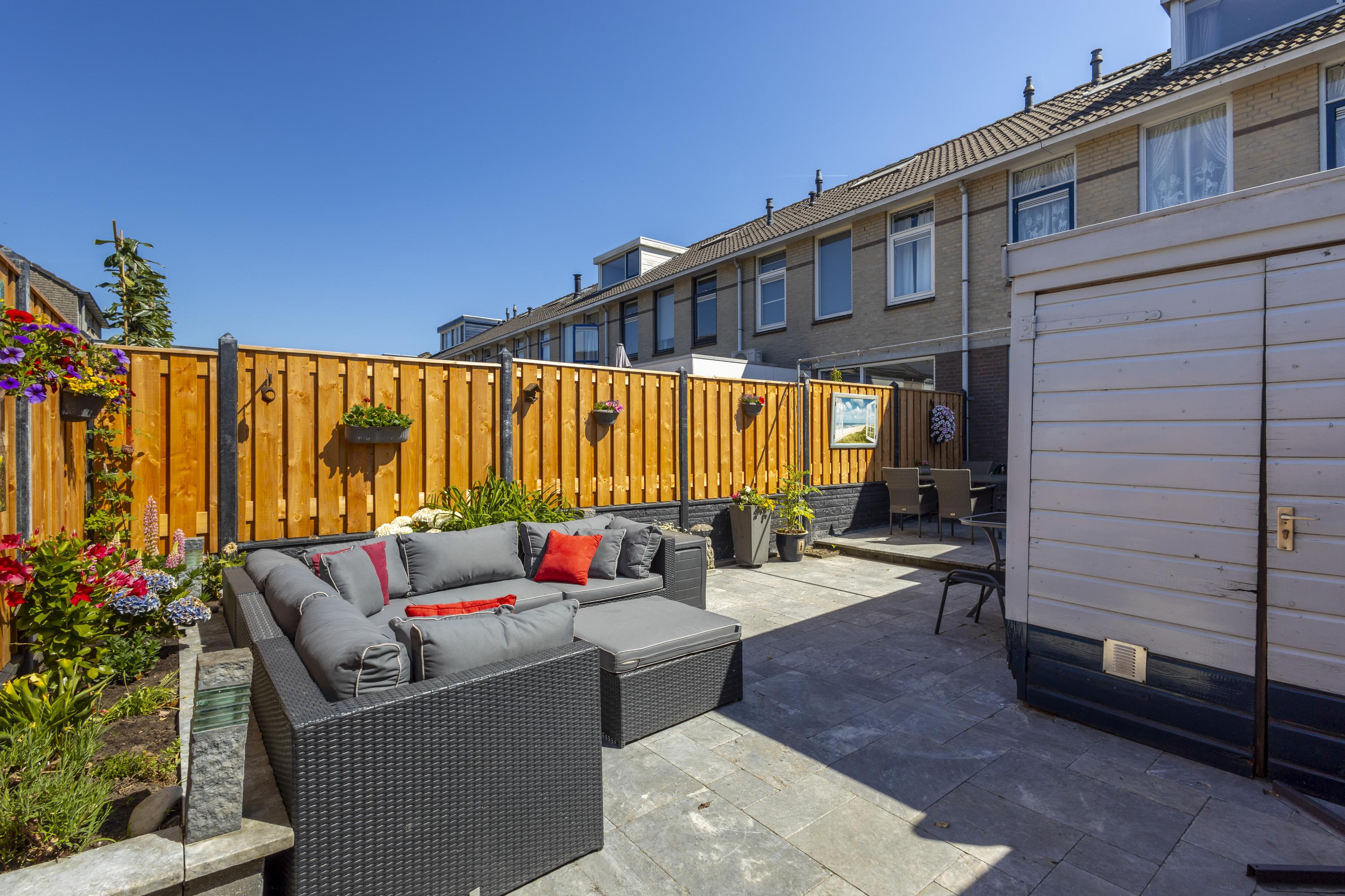 Buiten: de achtertuin is strak aangelegd met 2 terrassen, sierstraatwerk, een border met groen en is omsloten door een ‘nieuwe’ schutting met betonpalen en houten schuttingdelen. Aan de woning grenst een stenen berging en een houten blokhut zorgt voor extra bergruimte.
