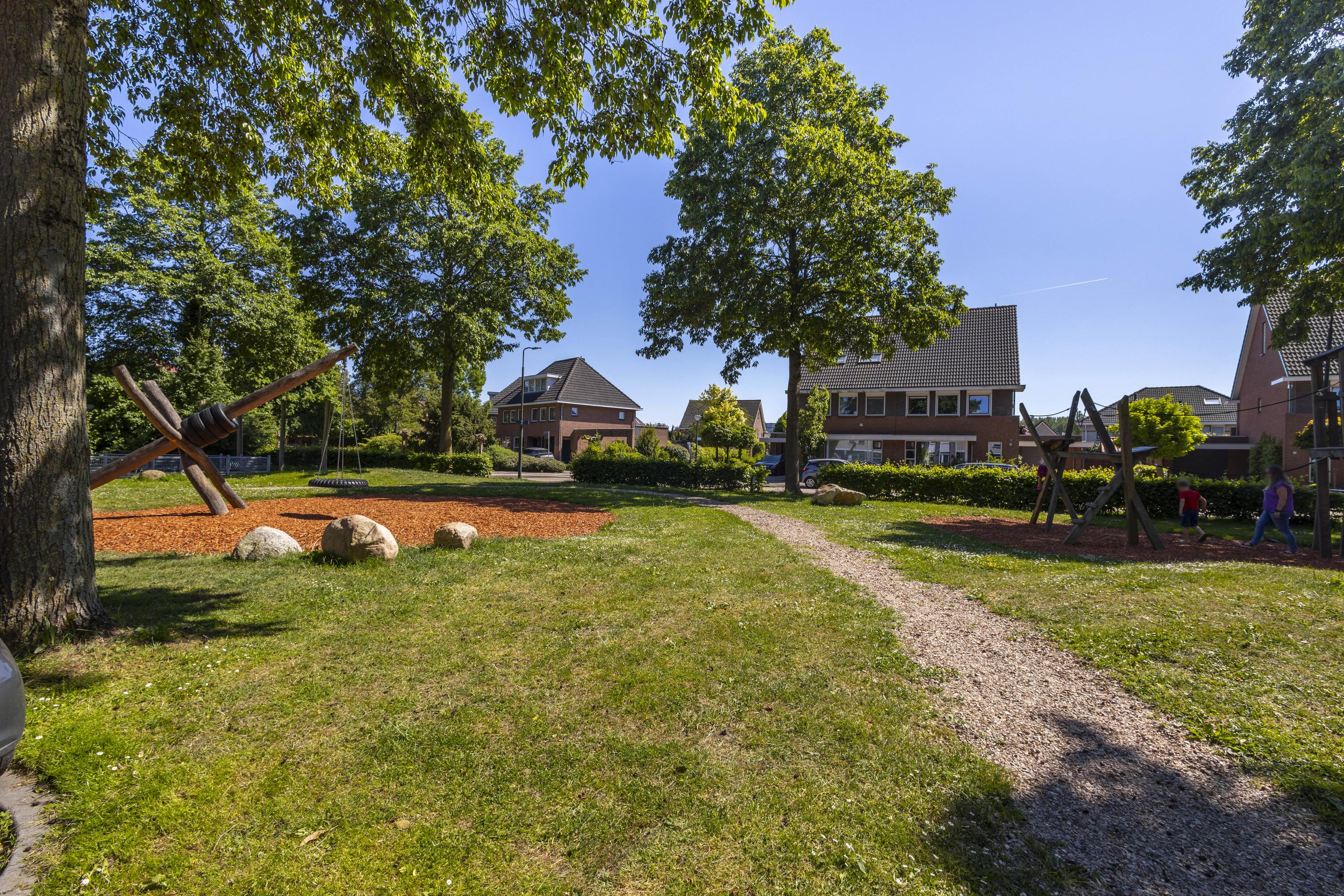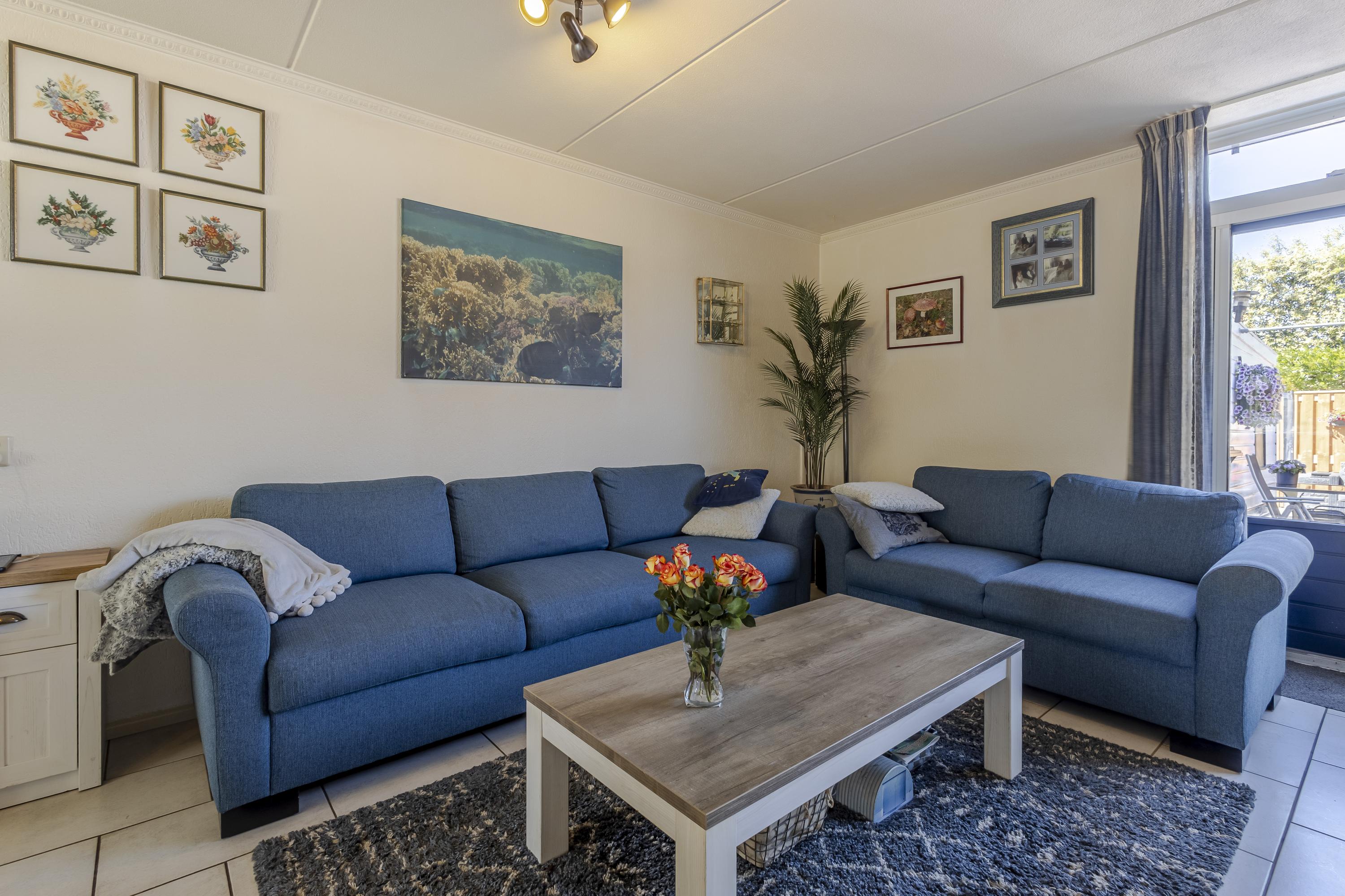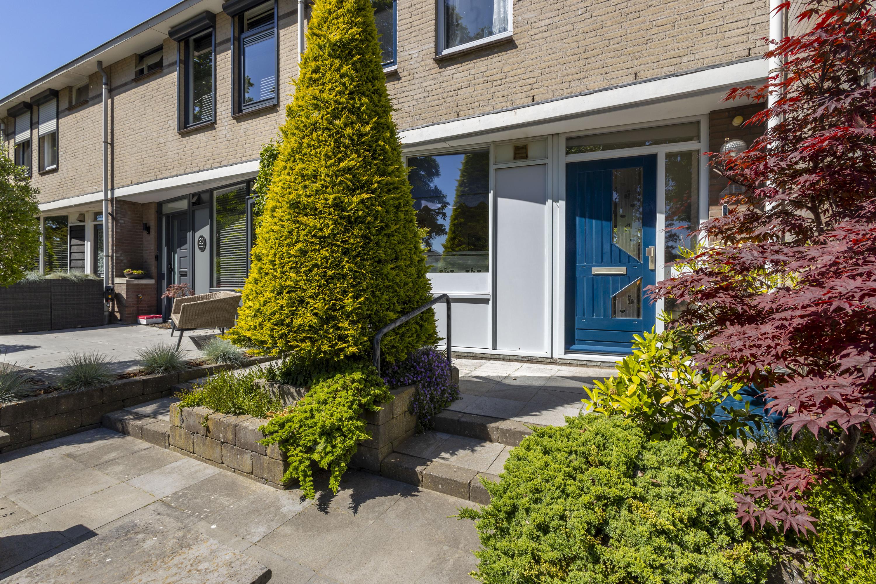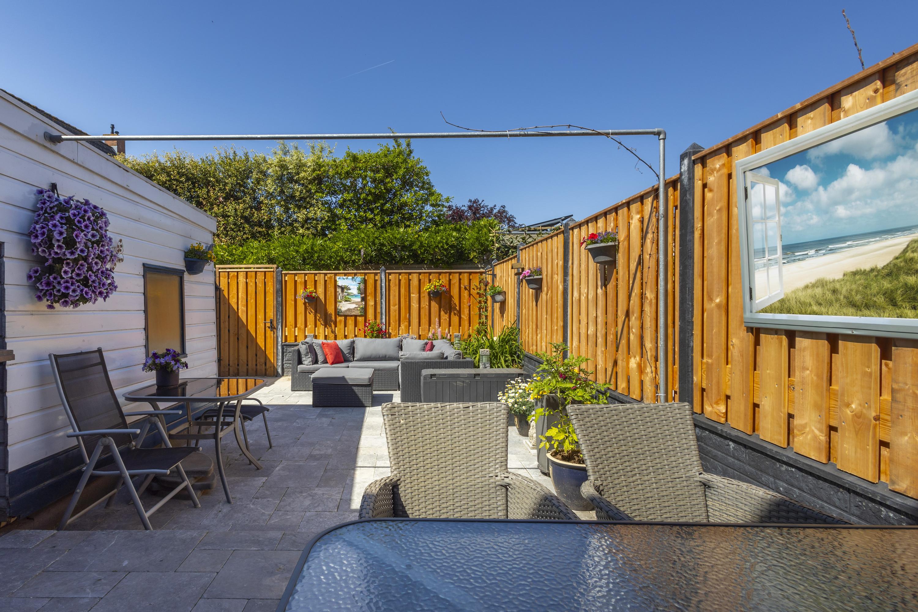 Buiten: de achtertuin is strak aangelegd met 2 terrassen, sierstraatwerk, een border met groen en is omsloten door een ‘nieuwe’ schutting met betonpalen en houten schuttingdelen. Aan de woning grenst een stenen berging en een houten blokhut zorgt voor extra bergruimte.