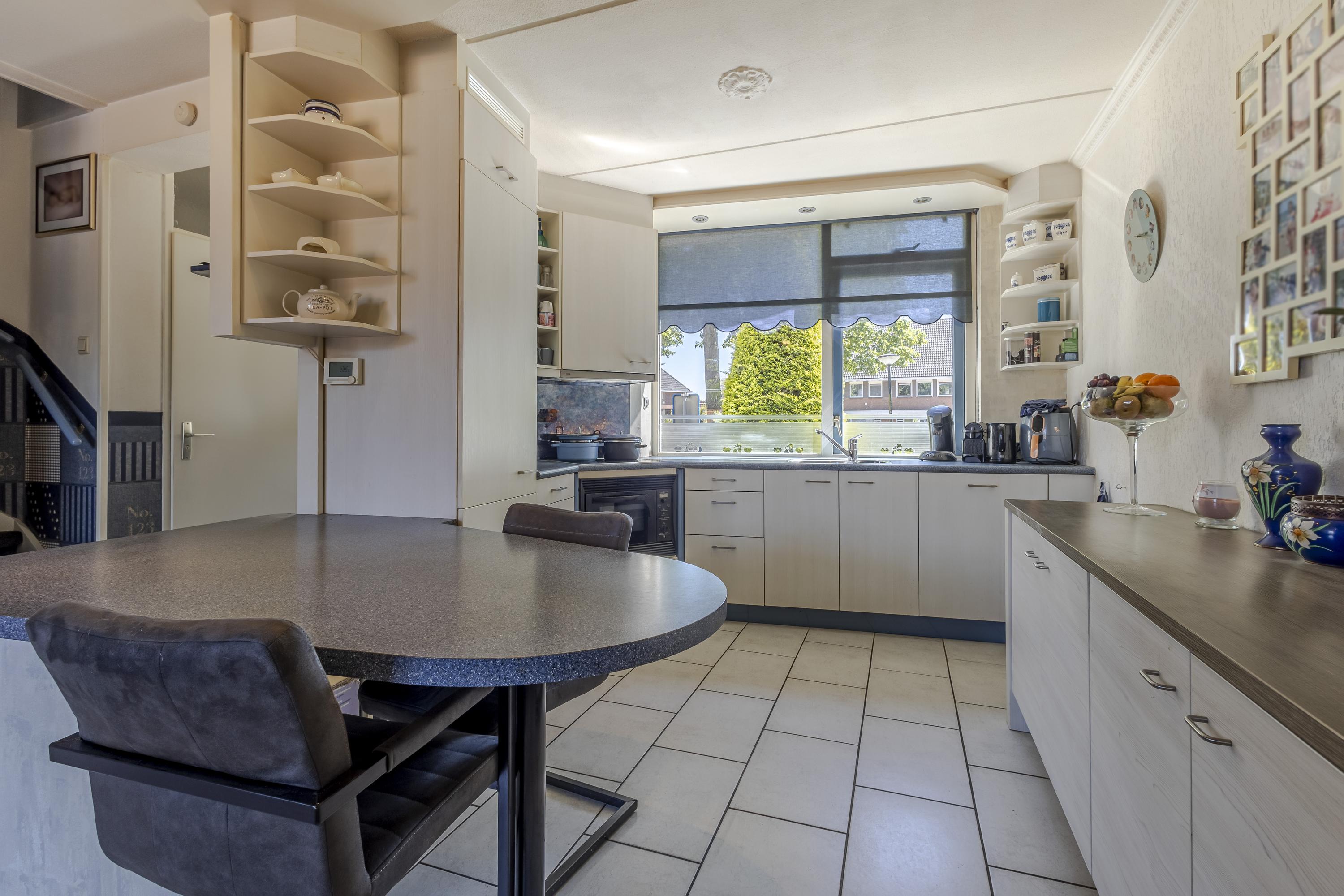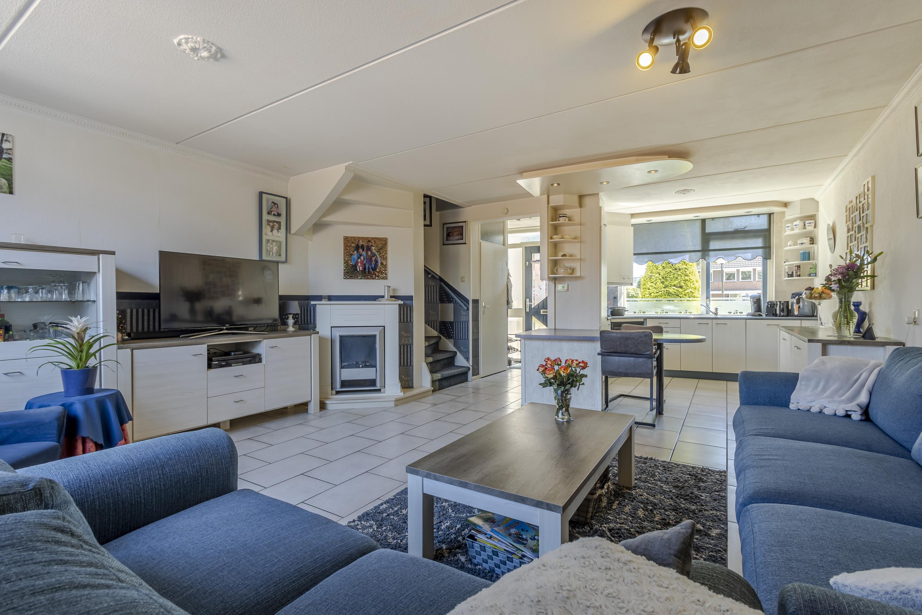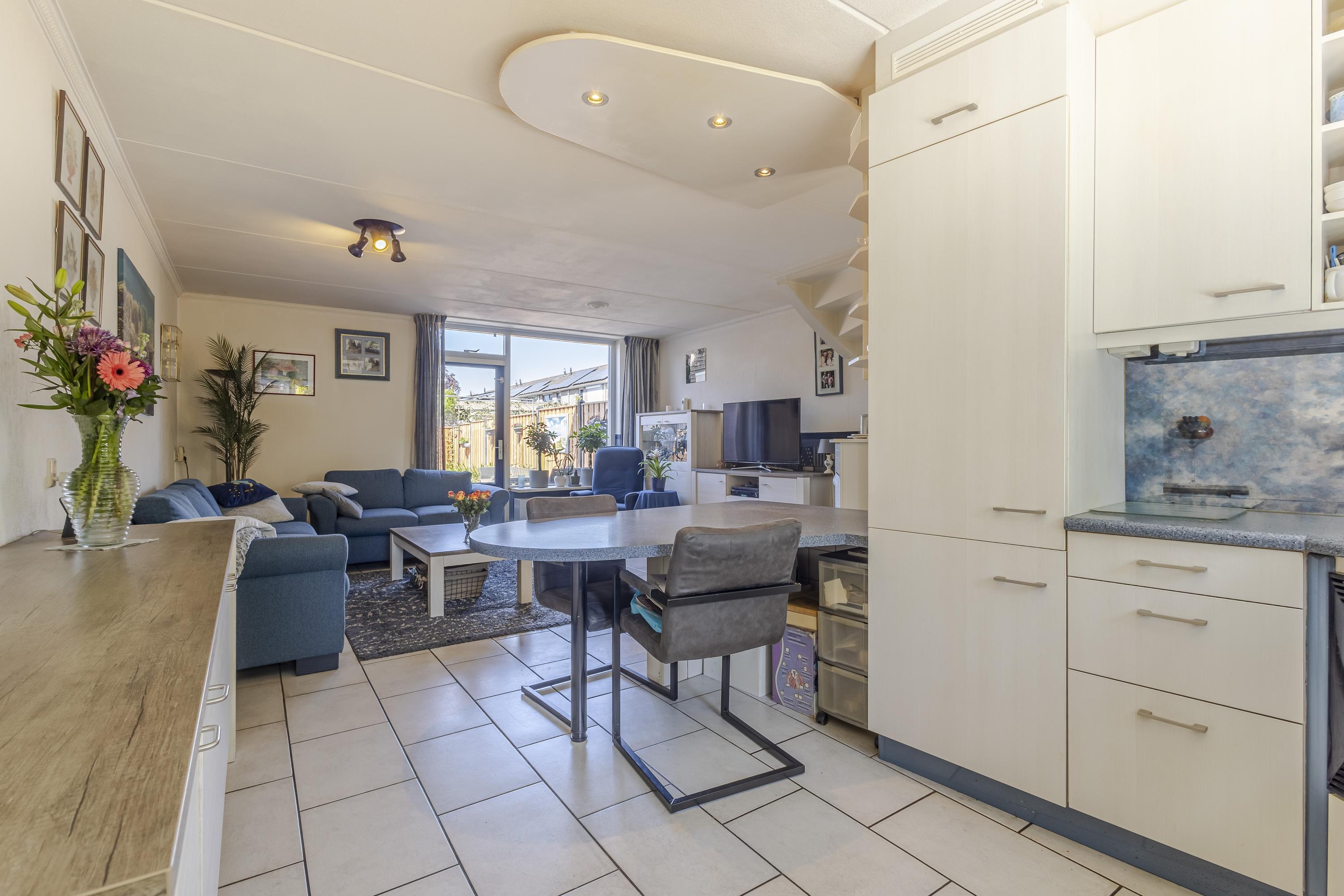 Begane grond: entree met meterkast, toilet, trap naar de 1e verdieping met aansluitend de woonkamer. De woonkamer is v.v. een lichte tegelvloer met vloerverwarming en aangrenzend de open keuken aan de voorzijde. De open keuken is gelegen in een hoekopstelling met een zit-/eetgedeelte en diverse inbouwapparatuur. Koken wordt hier een feestje, want vanuit het keukenraam is er vrij uitzicht aan de voorzijde. Vanuit de woonkamer is de achtertuin bereikbaar.