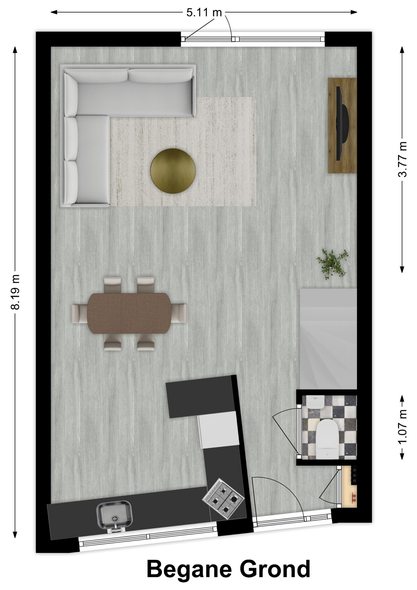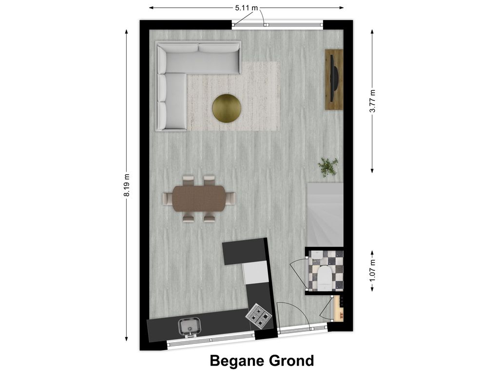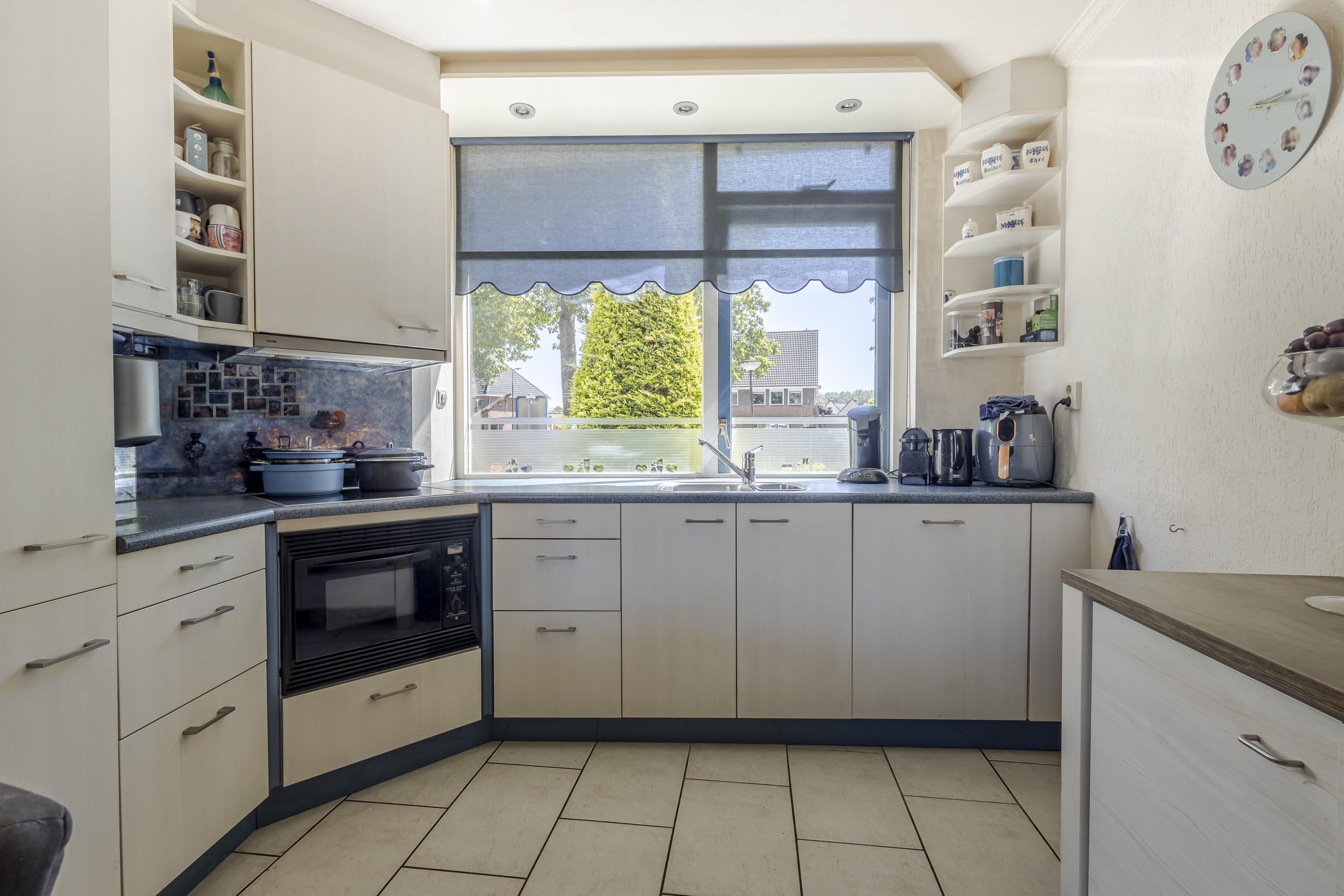 Begane grond: entree met meterkast, toilet, trap naar de 1e verdieping met aansluitend de woonkamer. De woonkamer is v.v. een lichte tegelvloer met vloerverwarming en aangrenzend de open keuken aan de voorzijde. De open keuken is gelegen in een hoekopstelling met een zit-/eetgedeelte en diverse inbouwapparatuur. Koken wordt hier een feestje, want vanuit het keukenraam is er vrij uitzicht aan de voorzijde. Vanuit de woonkamer is de achtertuin bereikbaar.