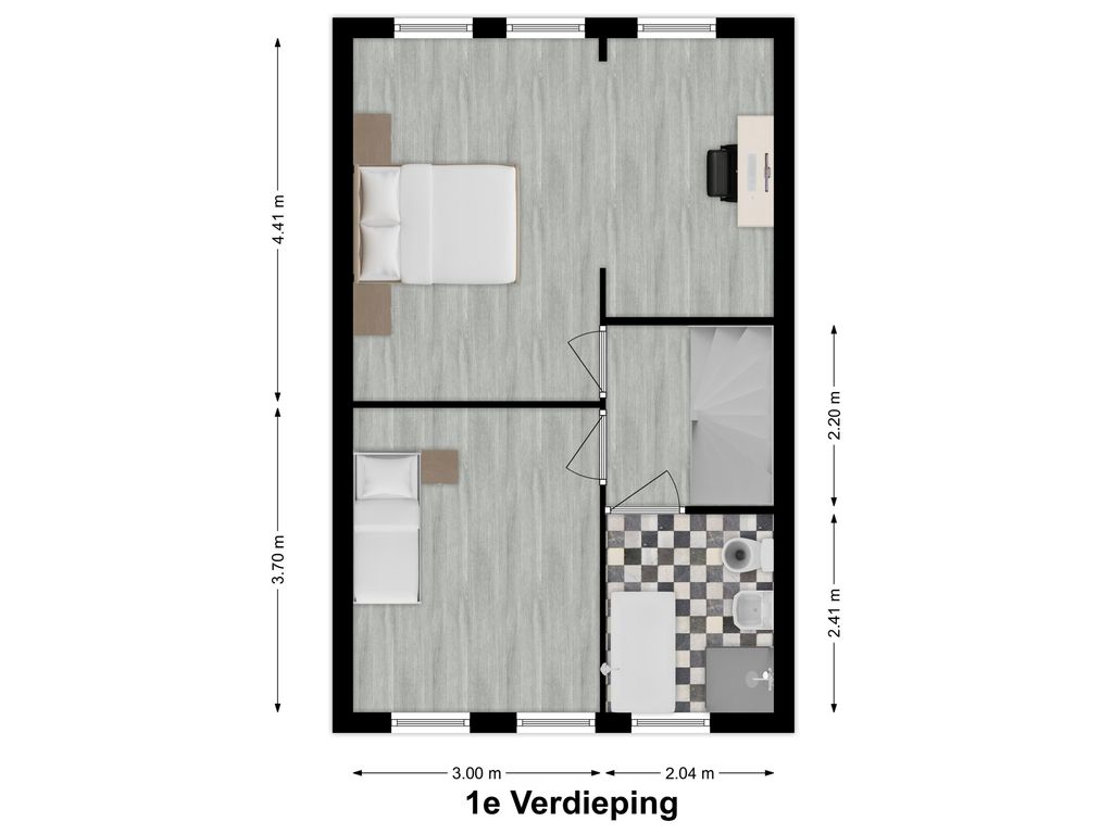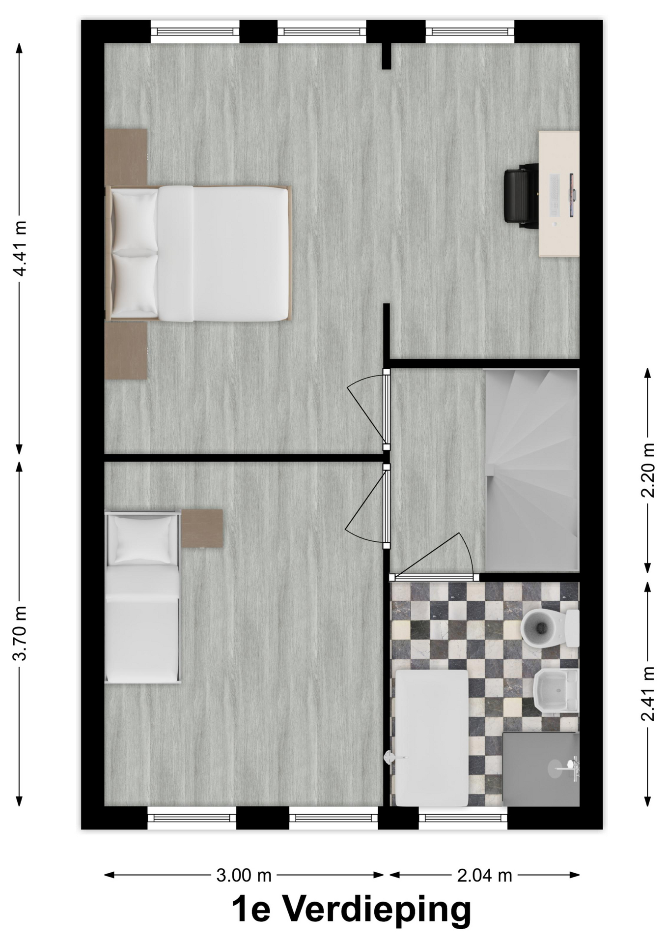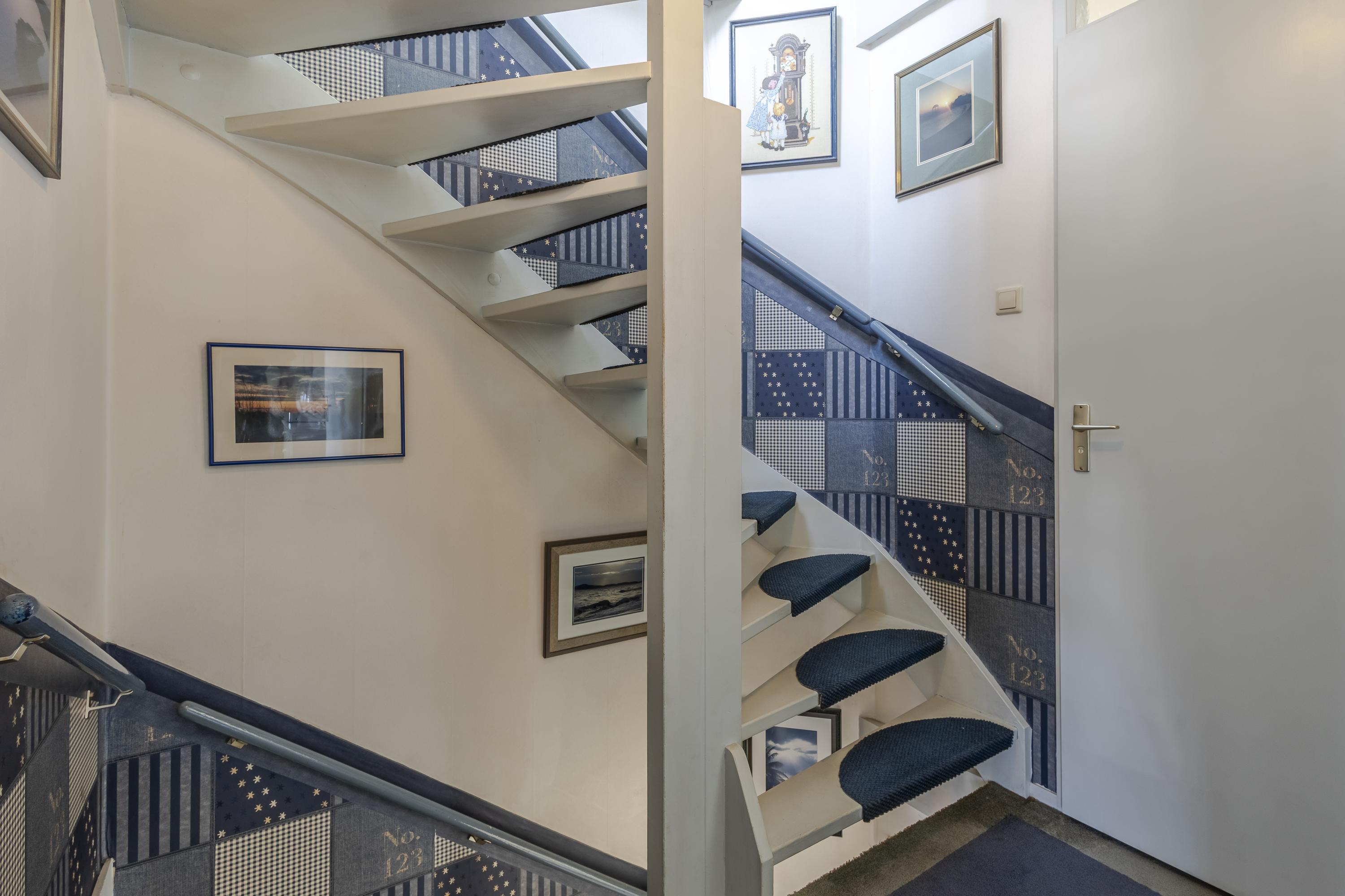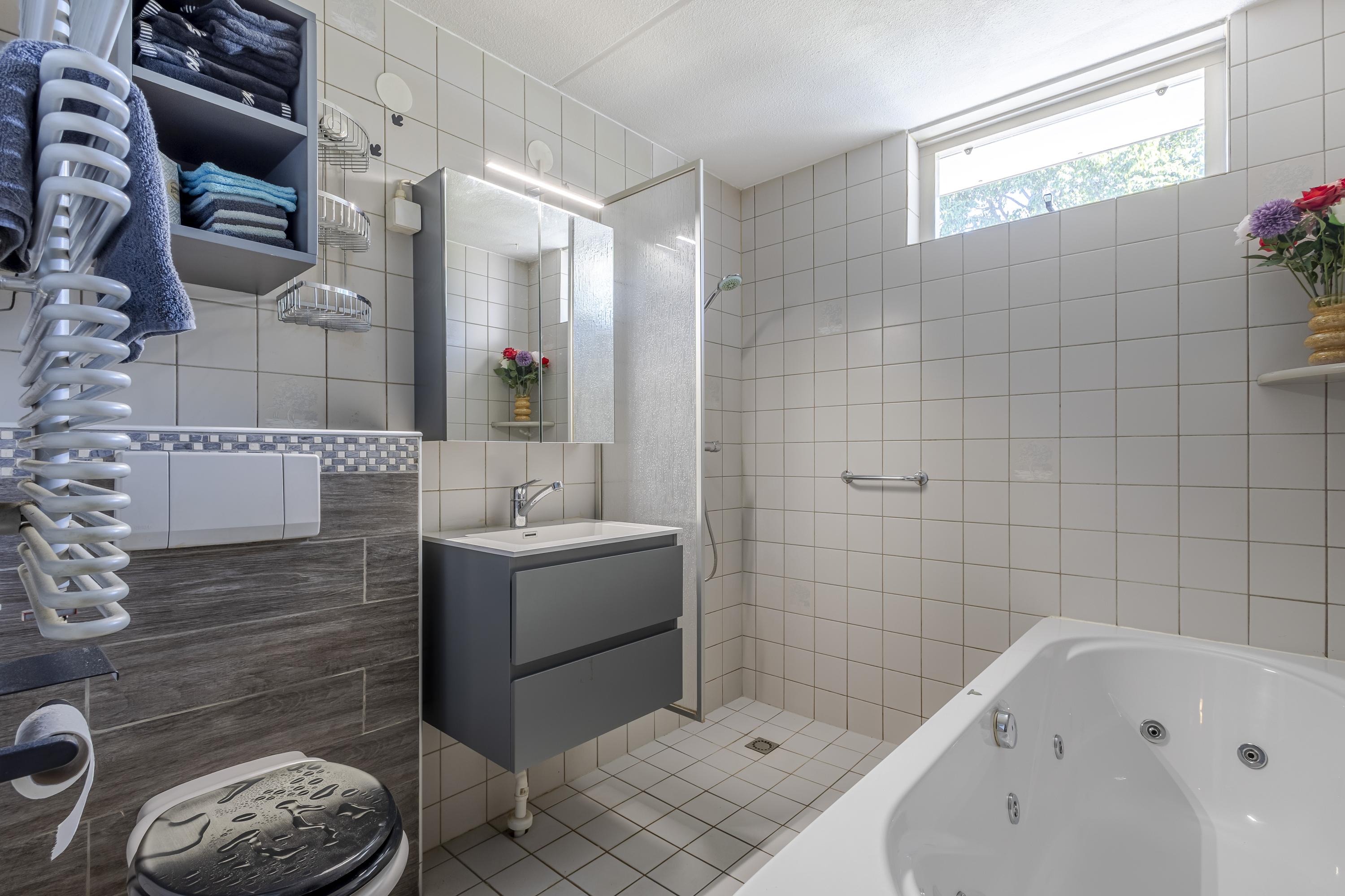 1e Verdieping: overloop met toegang tot 2 slaapkamers (voorheen 3) en de badkamer. De badkamer is v.v. een ligbad, douche, 2e toilet en designradiator.