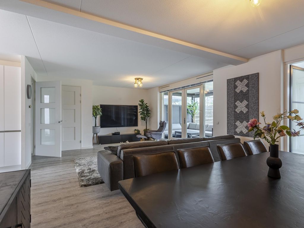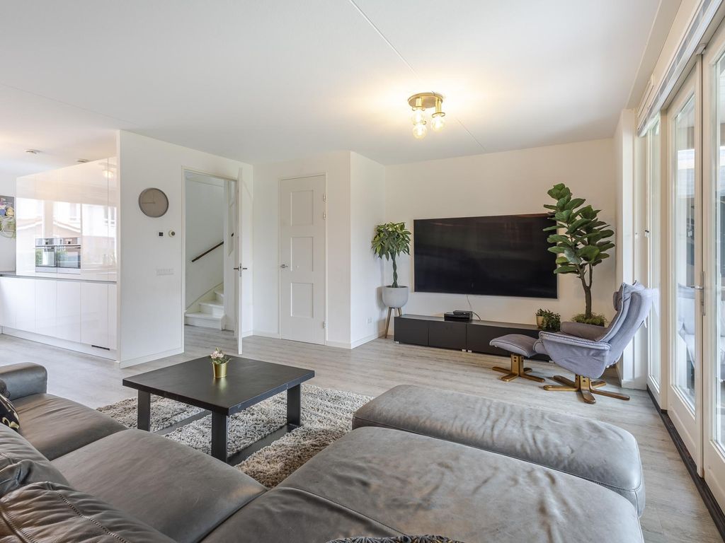 Stap vanuit de hal binnen in de royale woonkamer met veel lichtinval en een sfeervolle loungehoek onder de aangebouwde overkapping – perfect voor lange avonden binnen én buiten. De open keuken is modern en praktisch ingericht. Een bijkeuken en separatie (inpandige berging) completeren deze woonlaag.