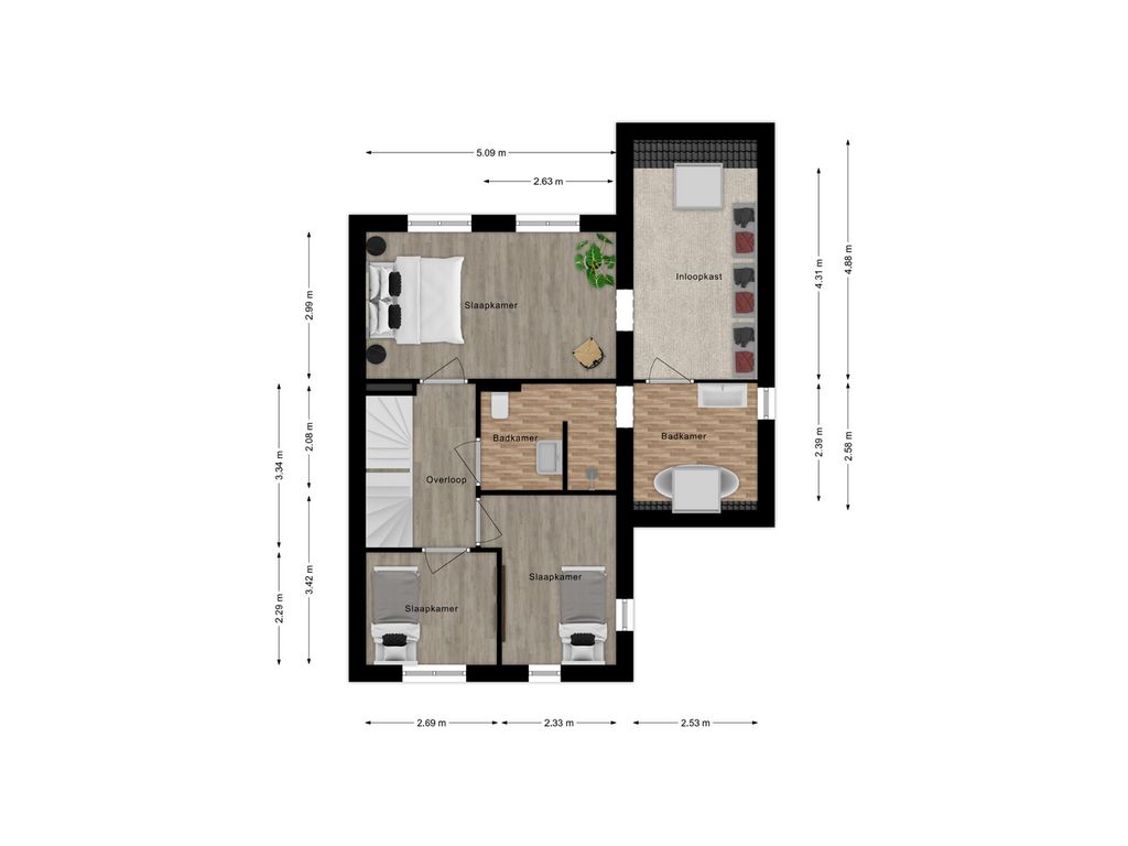 Op de eerste verdieping vindt u drie goed bemeten slaapkamers. De masterbedroom is een oase van rust en comfort, met directe toegang tot een ruime walk-in-closet én de exclusieve badkamer. Deze badkamer is in 2021 volledig vernieuwd en ademt luxe: een inloopdouche, vrijstaand ligbad, dubbel wastafelmeubel én een tweede toilet – alles uitgevoerd met hoogwaardige materialen en stijlvol design.