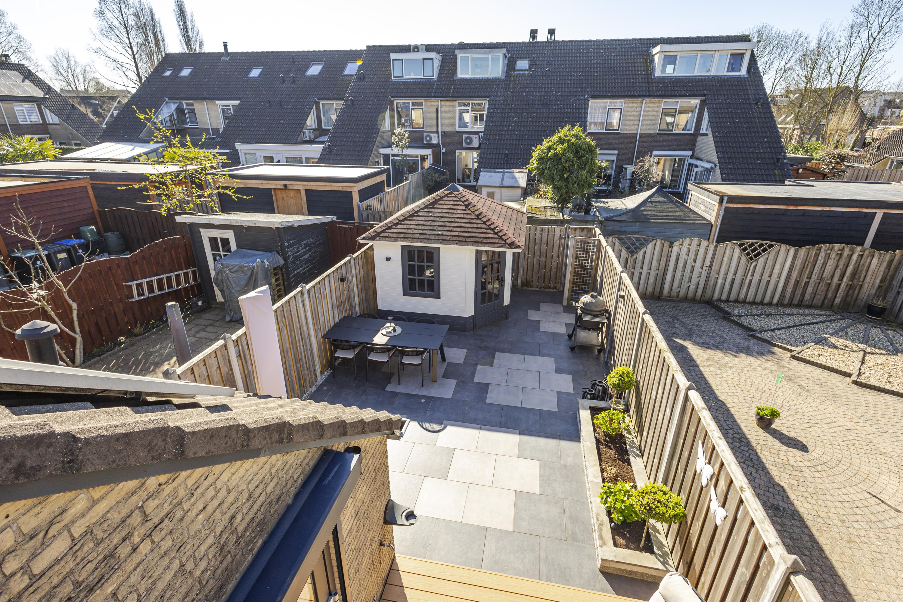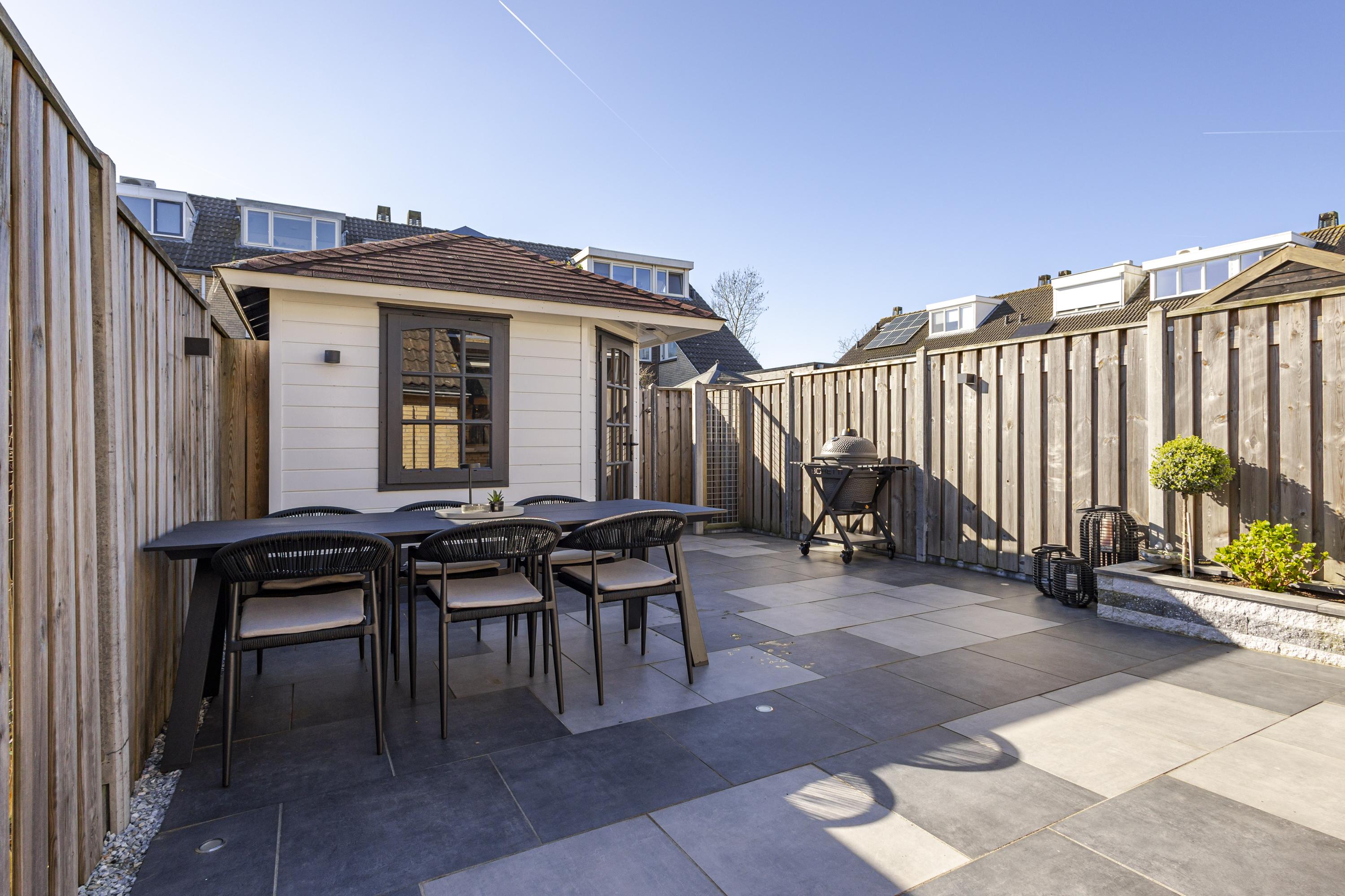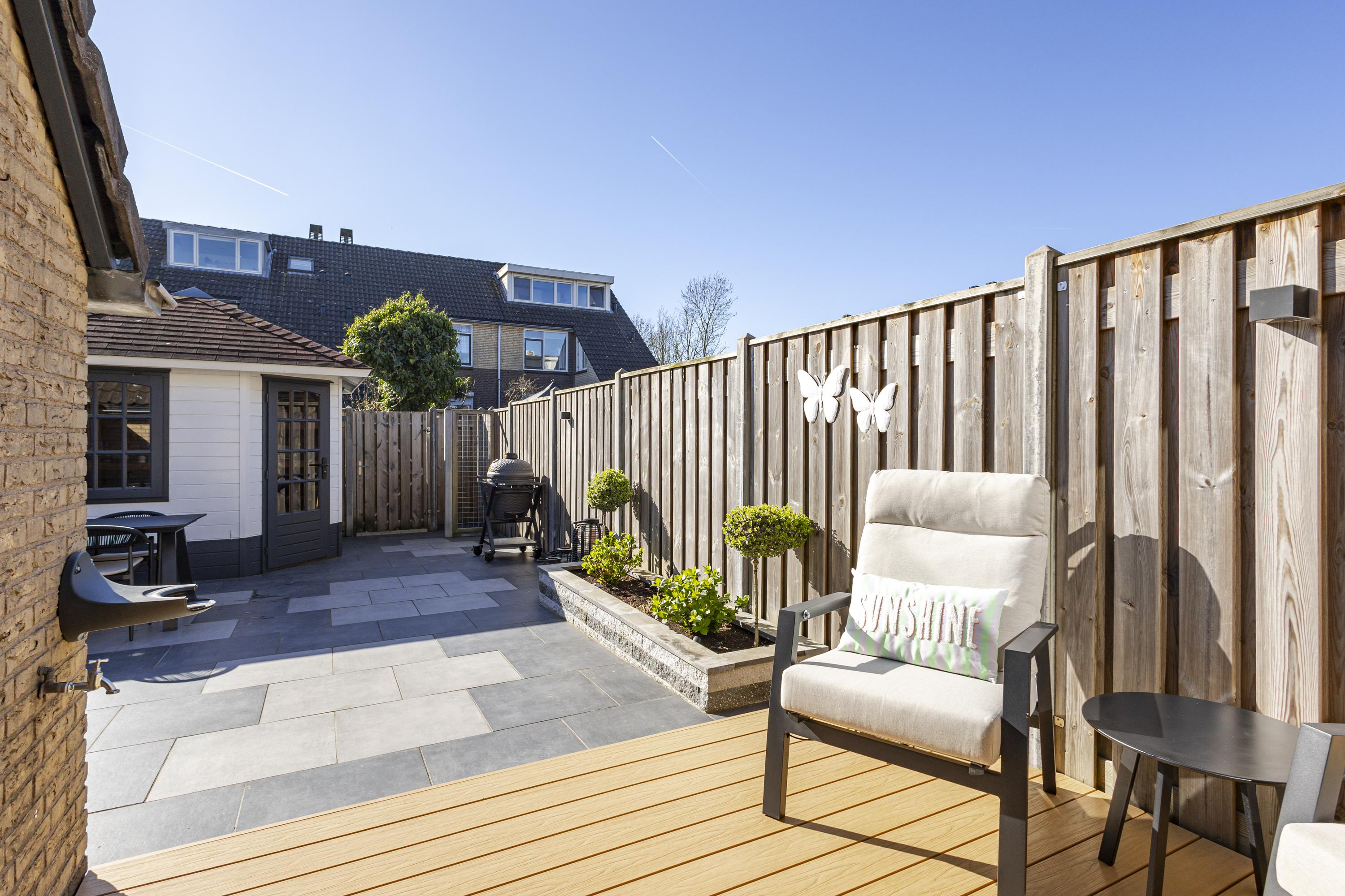 De achtertuin is verzorgd aangelegd met sierbestrating, een vlonder en groenaccenten in een border. Met een houten berging, stevige schuttingen en een achterom is ook het buitenplaatje compleet.