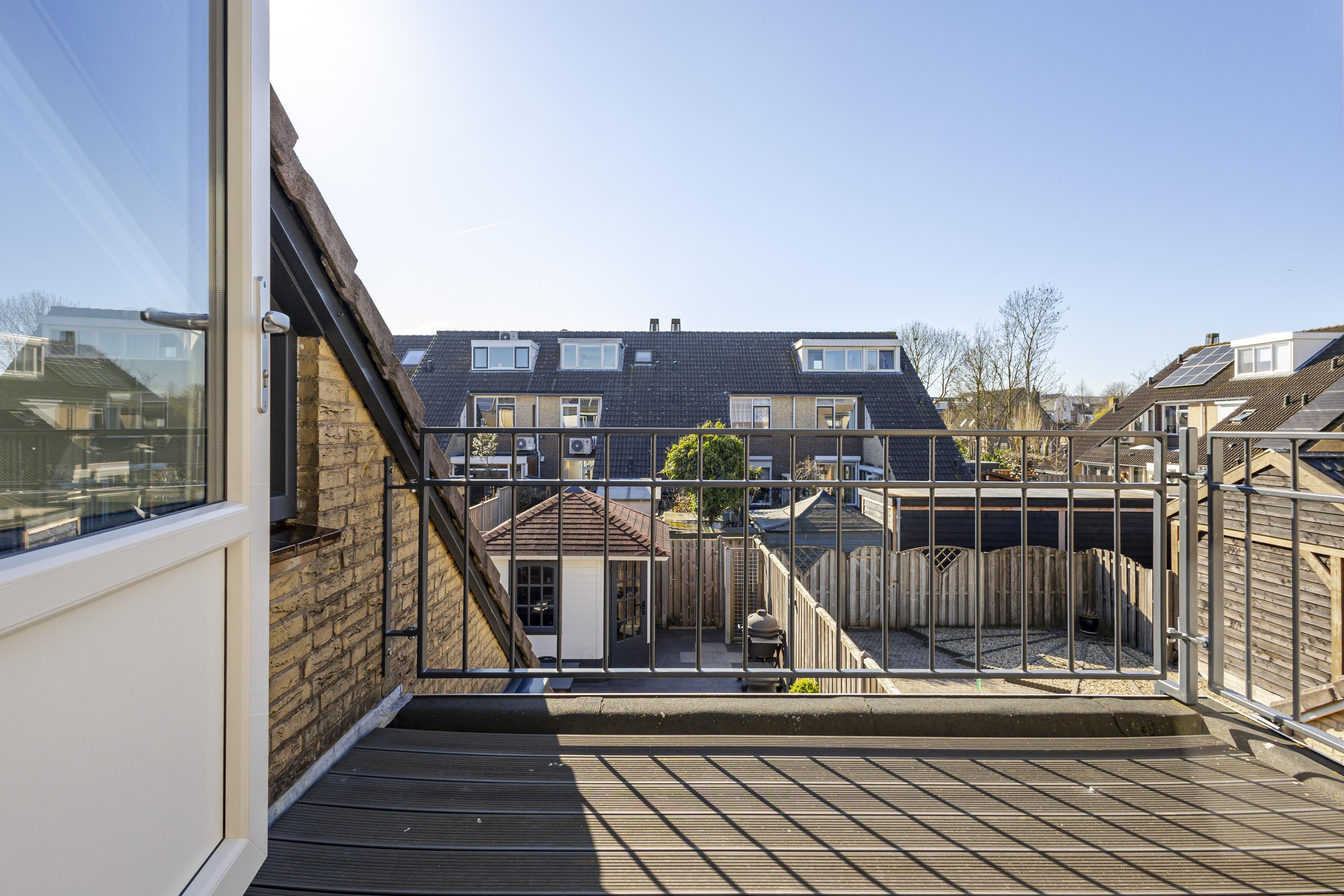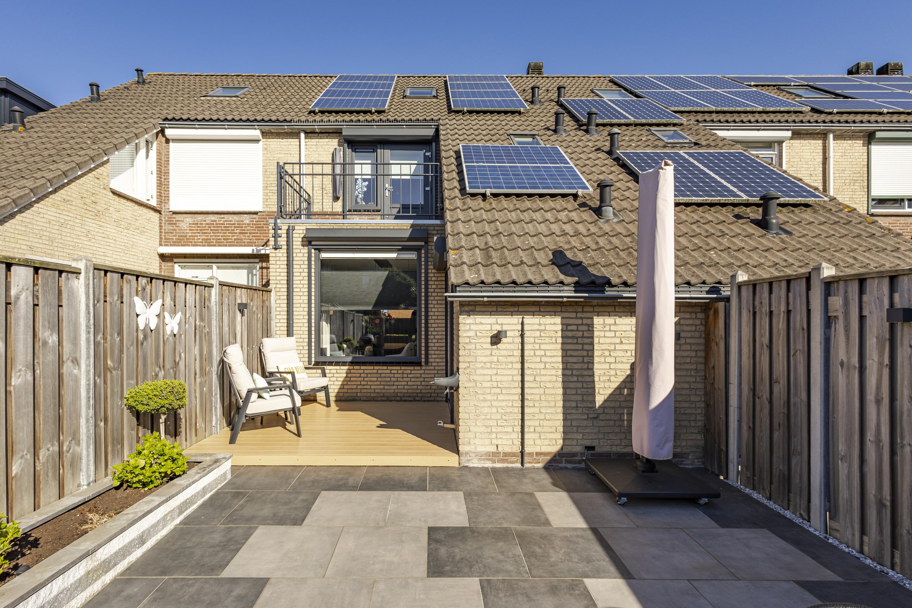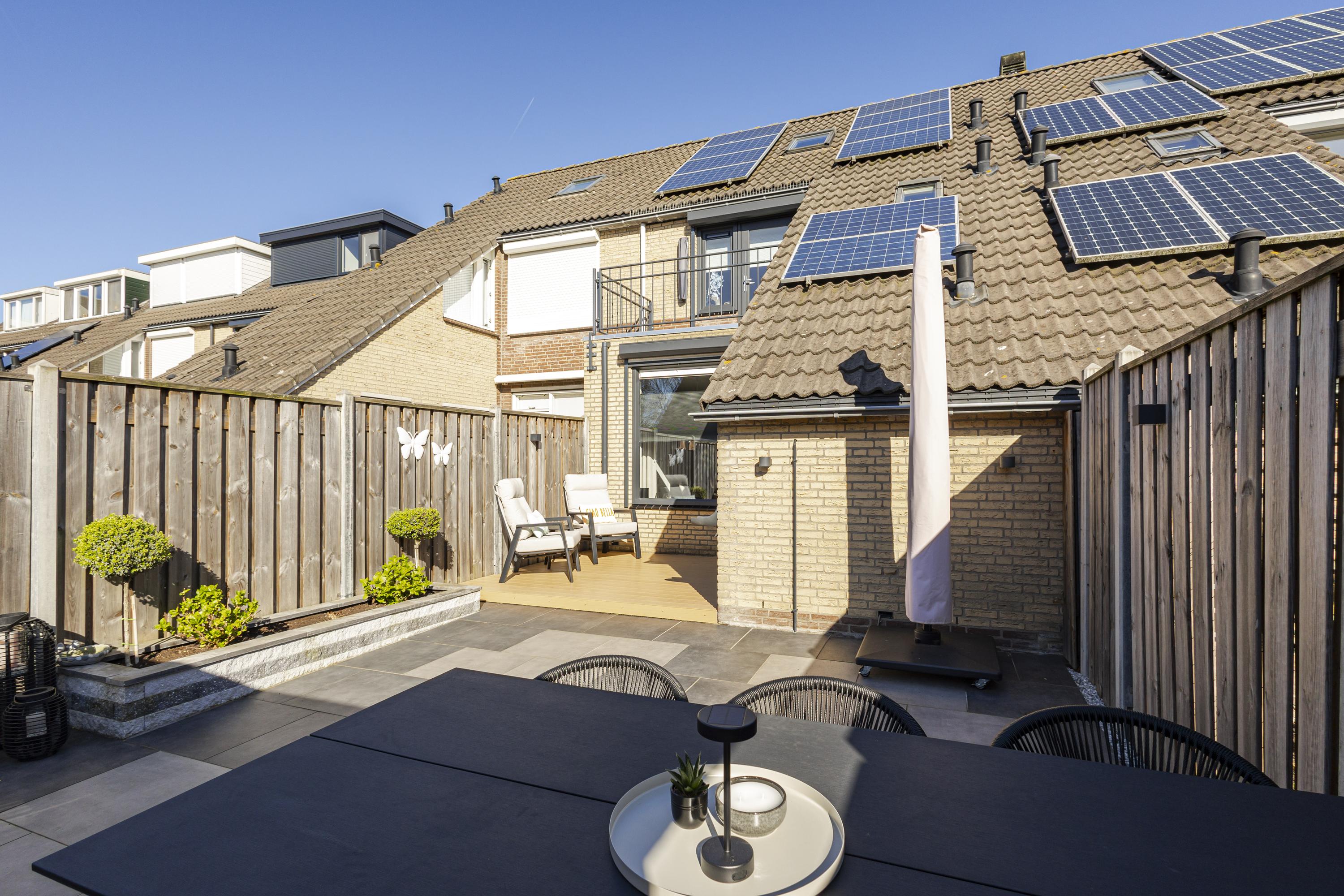 De achtertuin is verzorgd aangelegd met sierbestrating, een vlonder en groenaccenten in een border. Met een houten berging, stevige schuttingen en een achterom is ook het buitenplaatje compleet.