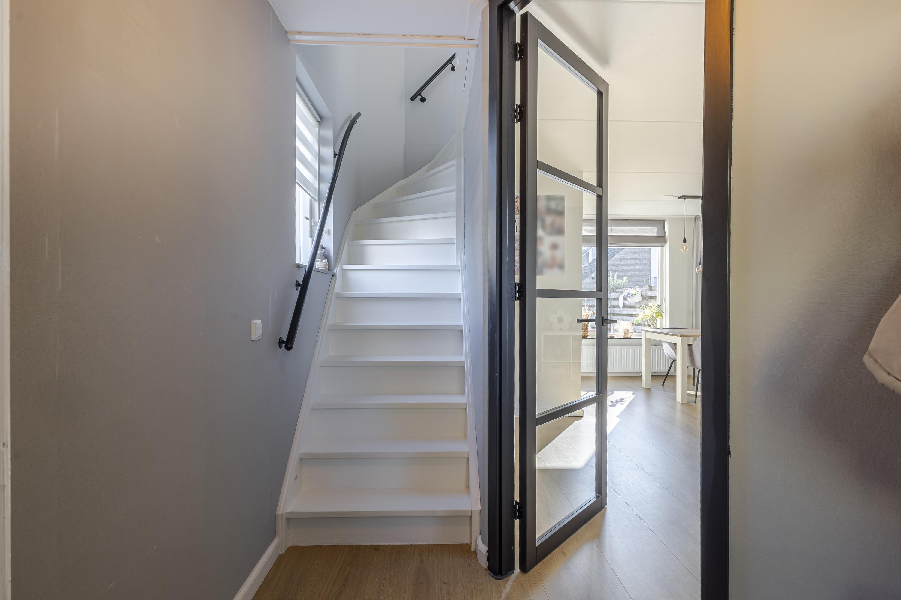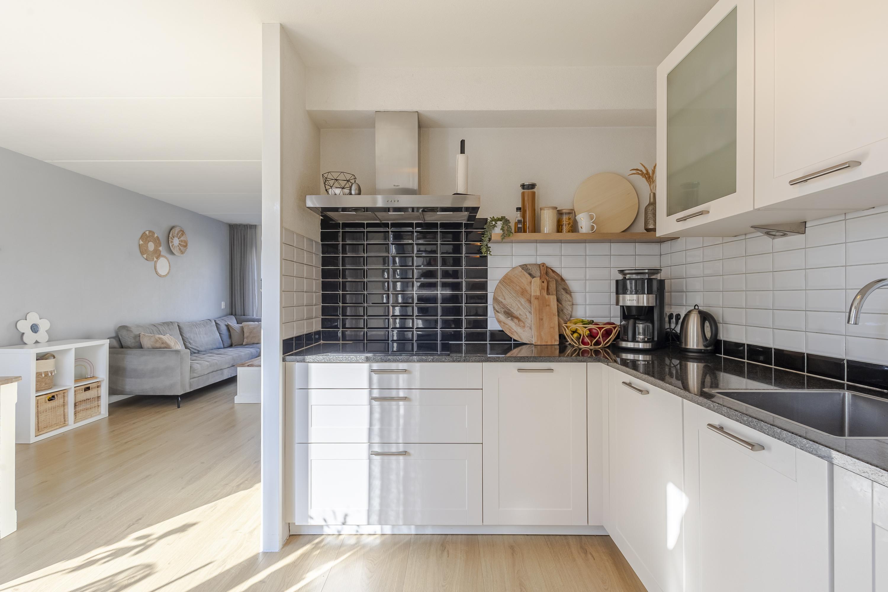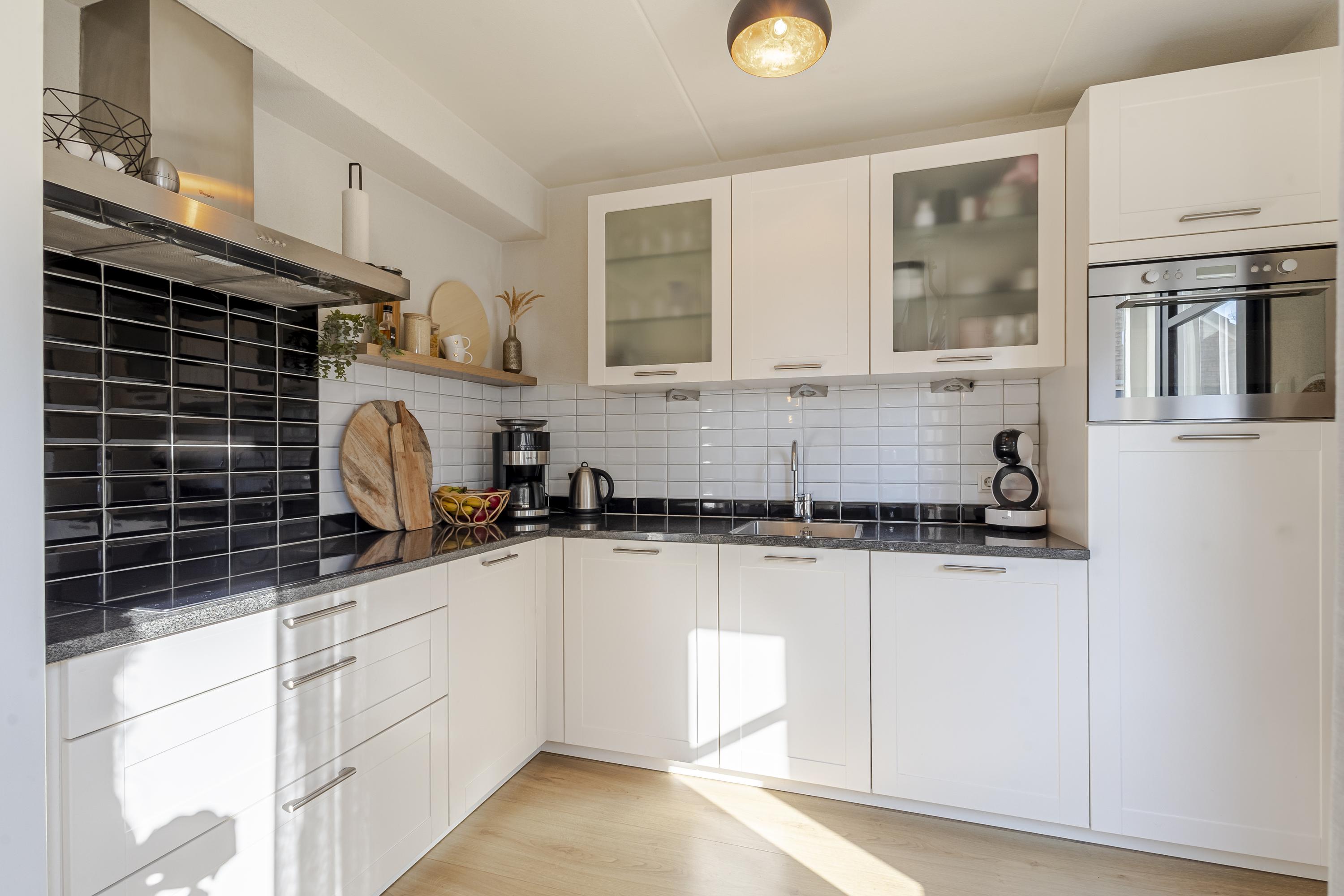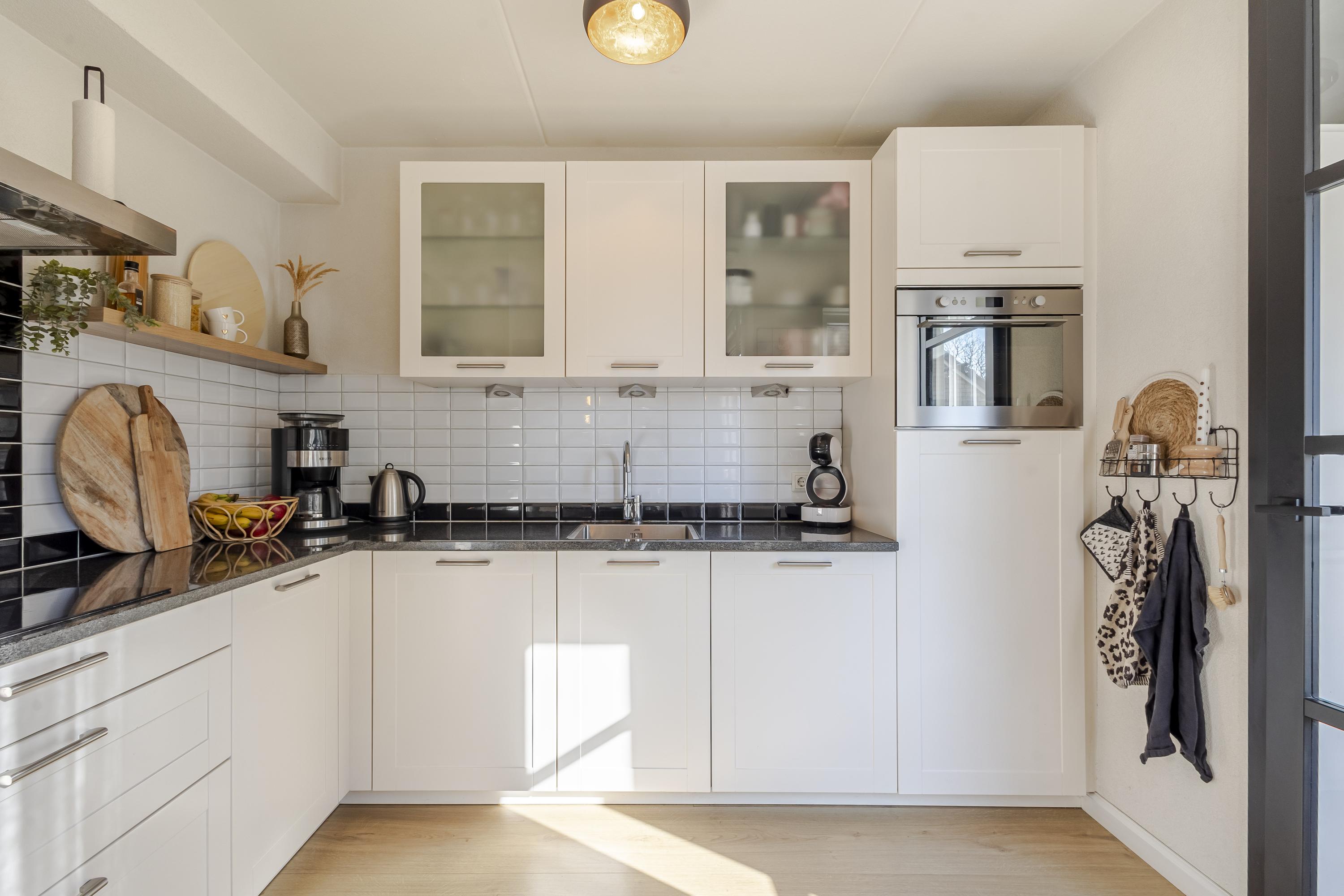 Naast de ruime hal is er op de begane grond een lichte woonkamer met open keuken en toegang tot het achterportaal en de trapkast. De keuken is tijdloos en voorzien van diverse inbouwapparatuur.