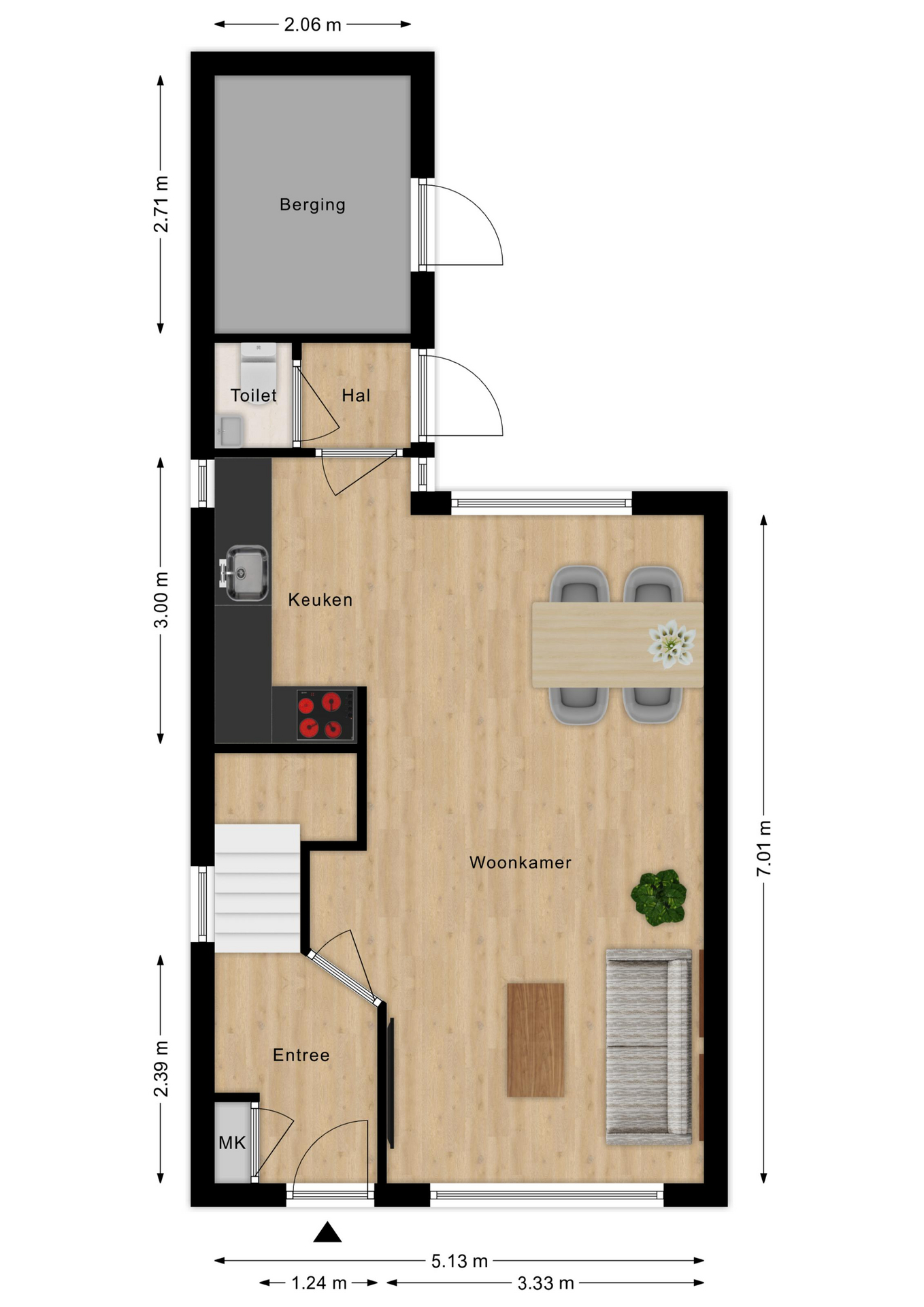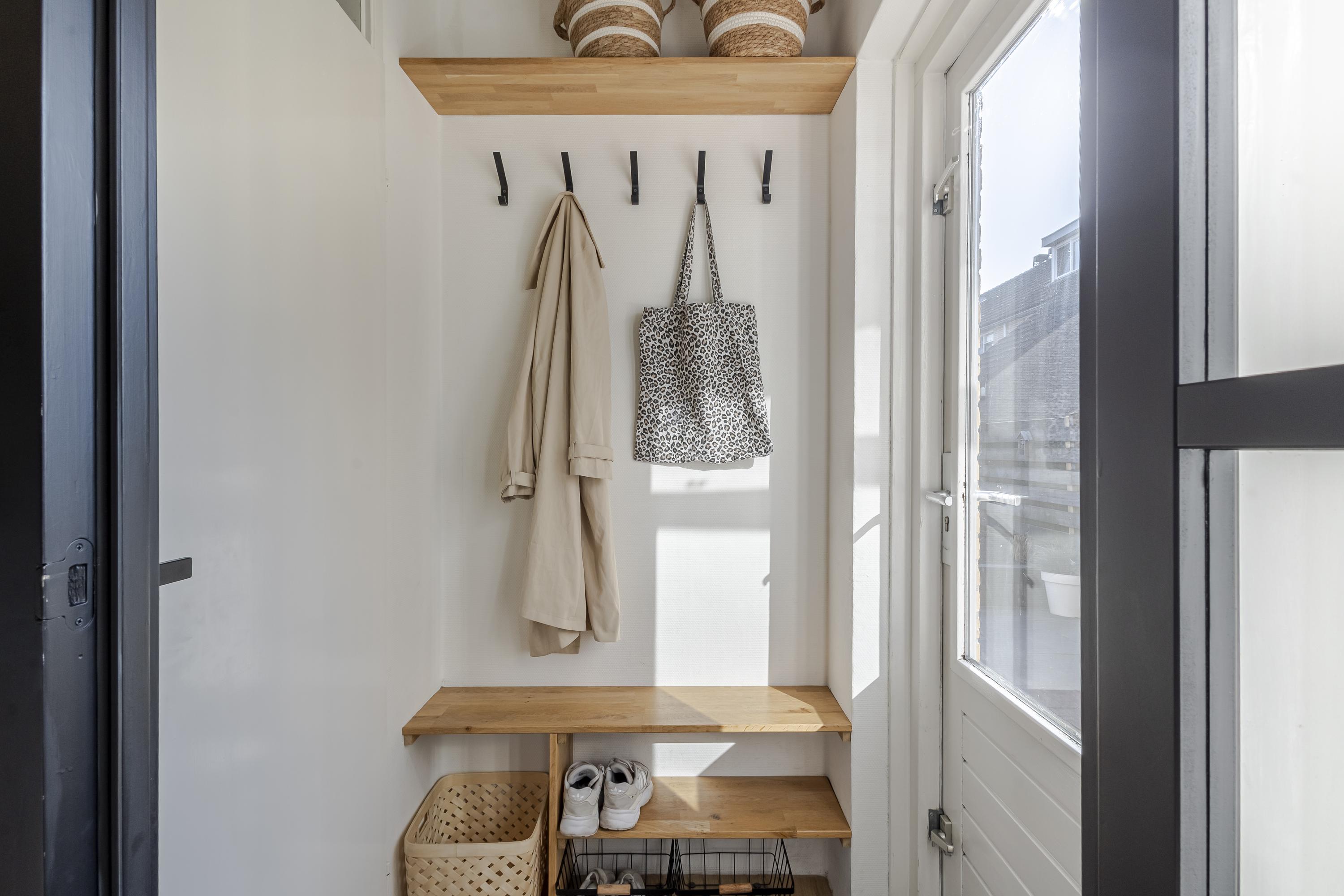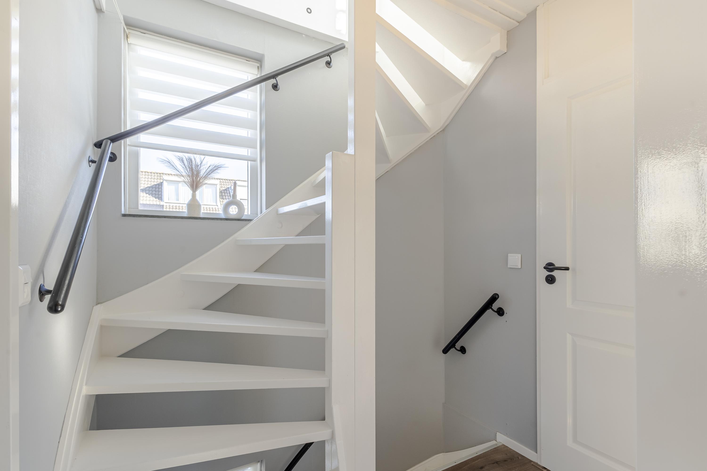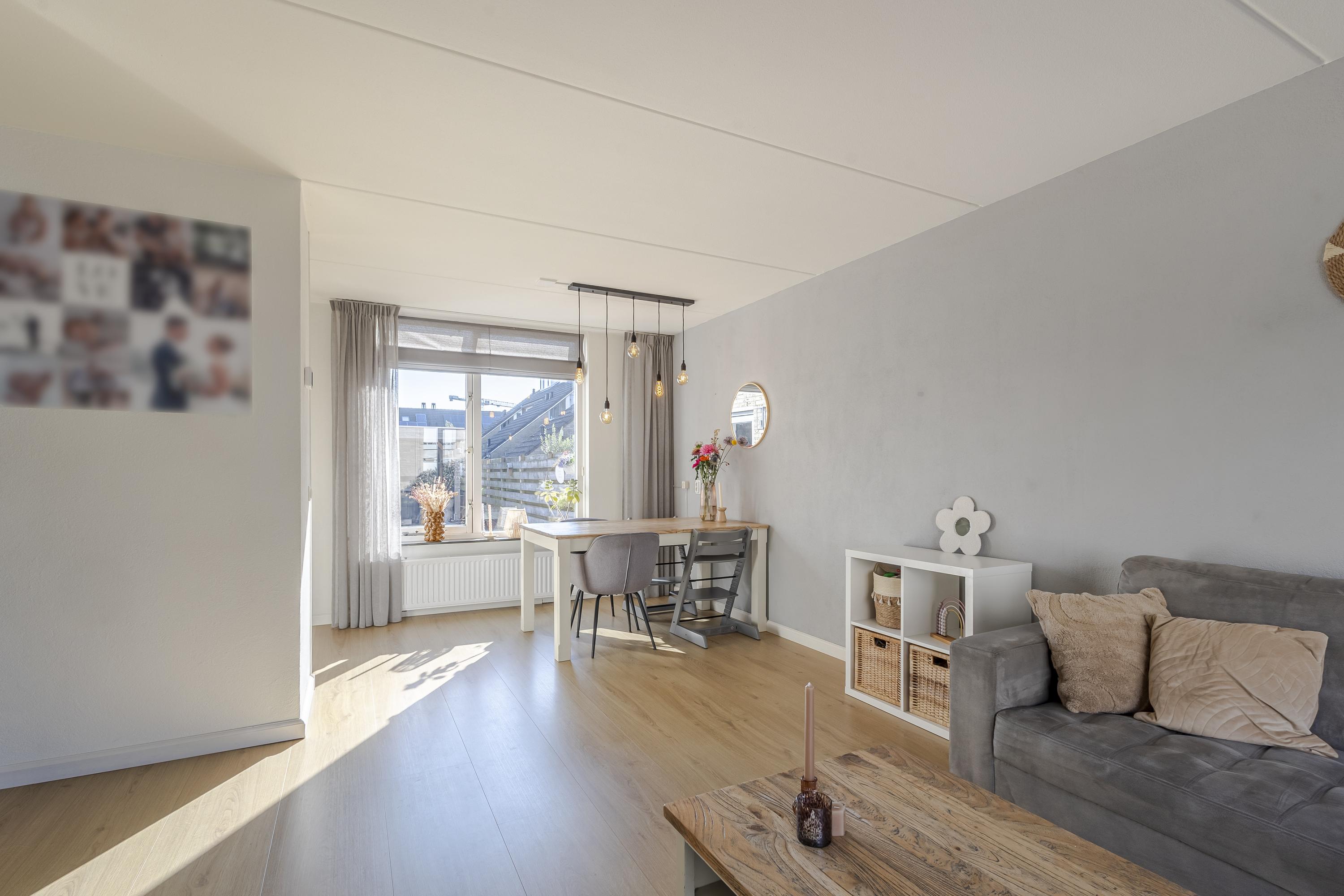 Naast de ruime hal is er op de begane grond een lichte woonkamer met open keuken en toegang tot het achterportaal en de trapkast. De keuken is tijdloos en voorzien van diverse inbouwapparatuur.