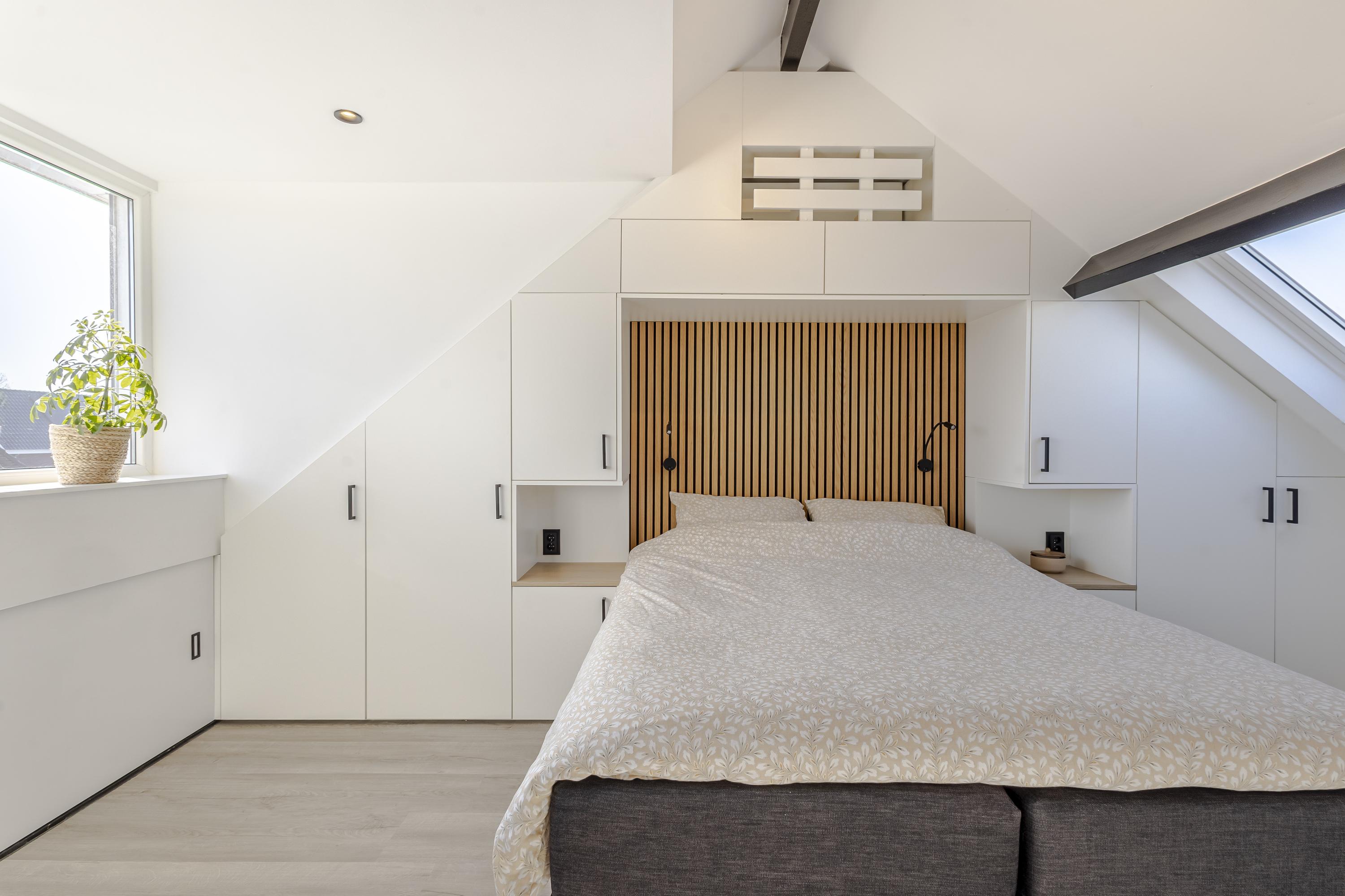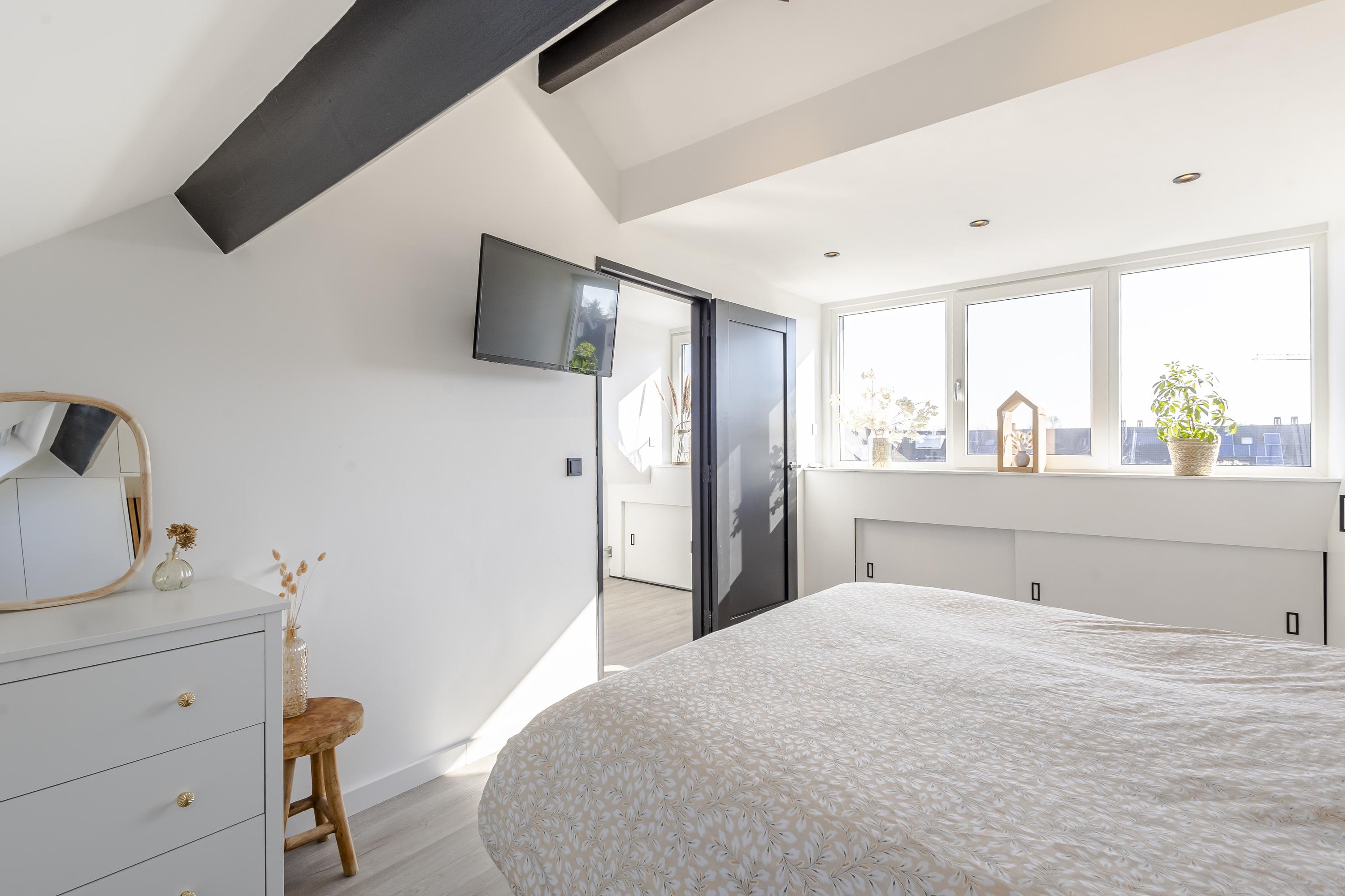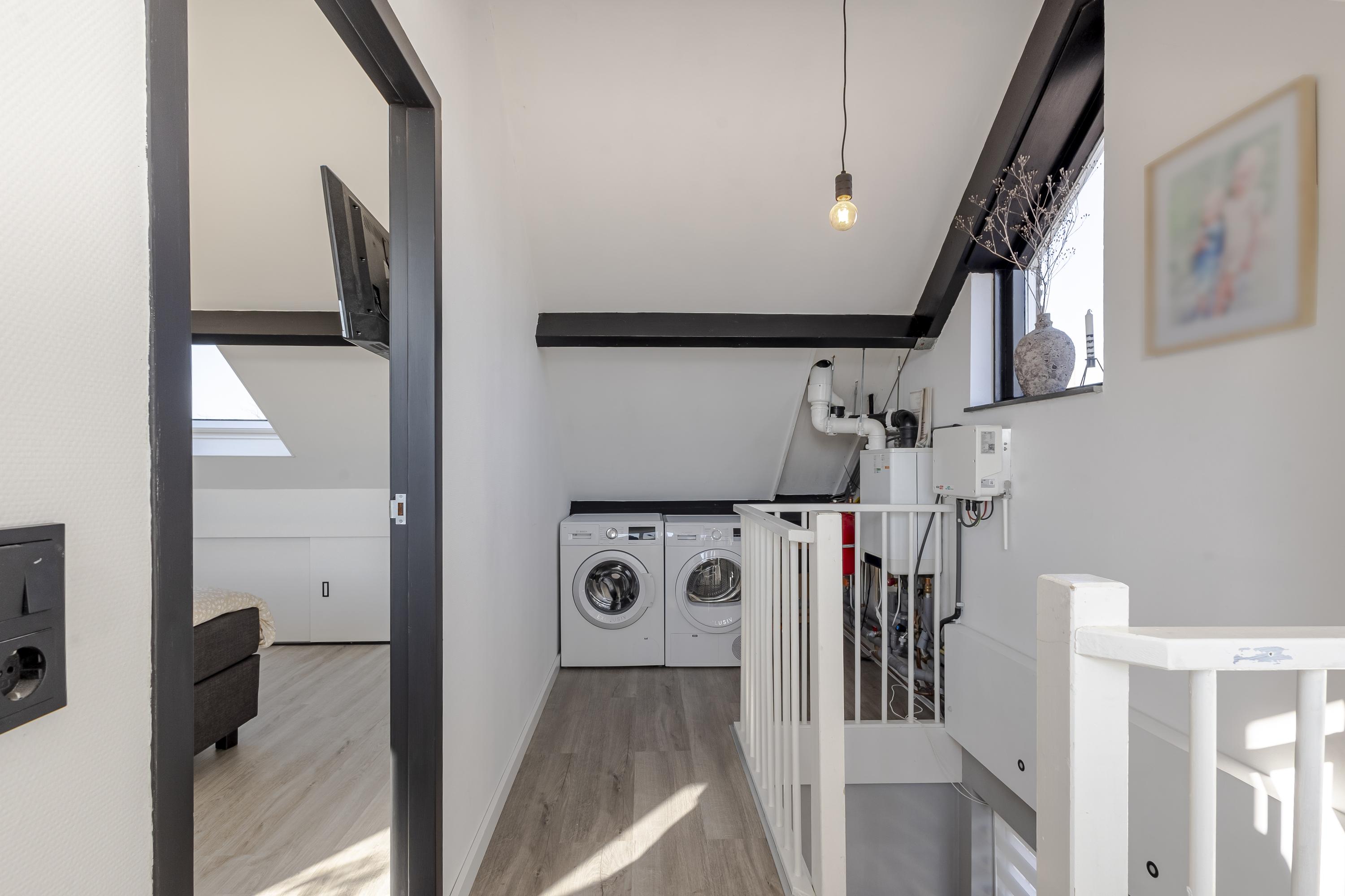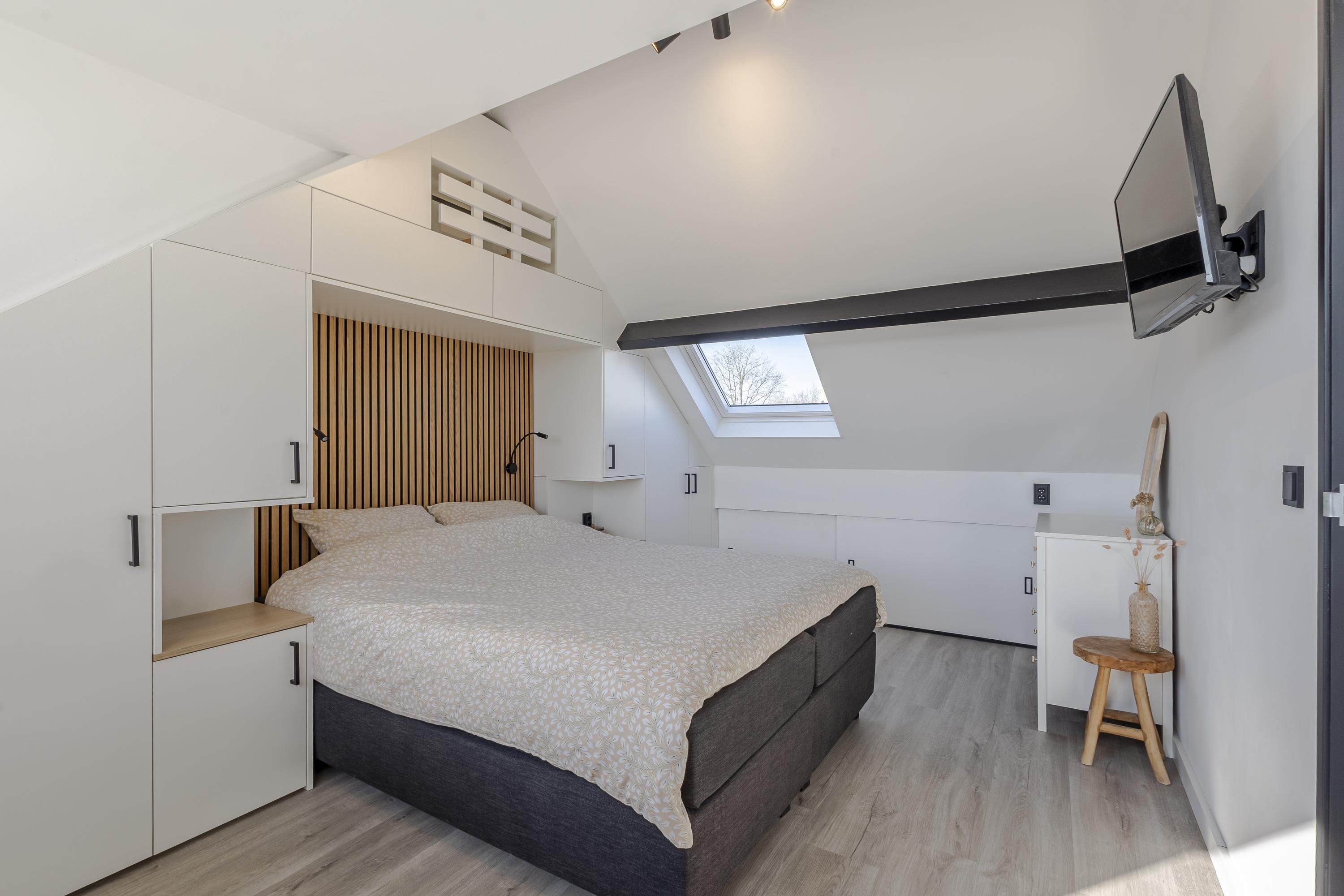 De 2e verdieping is grondig aangepakt en voorzien van de ouderslaapkamer. Deze slaapkamer is keurig afgetimmerd met rondom kast-/bergruimte. Op de overloop zijn de aansluitingen voor het witgoed en de cv-ketel geplaatst. Aan de achterzijde is een dakkapel geplaatst voor extra licht en ruimte.