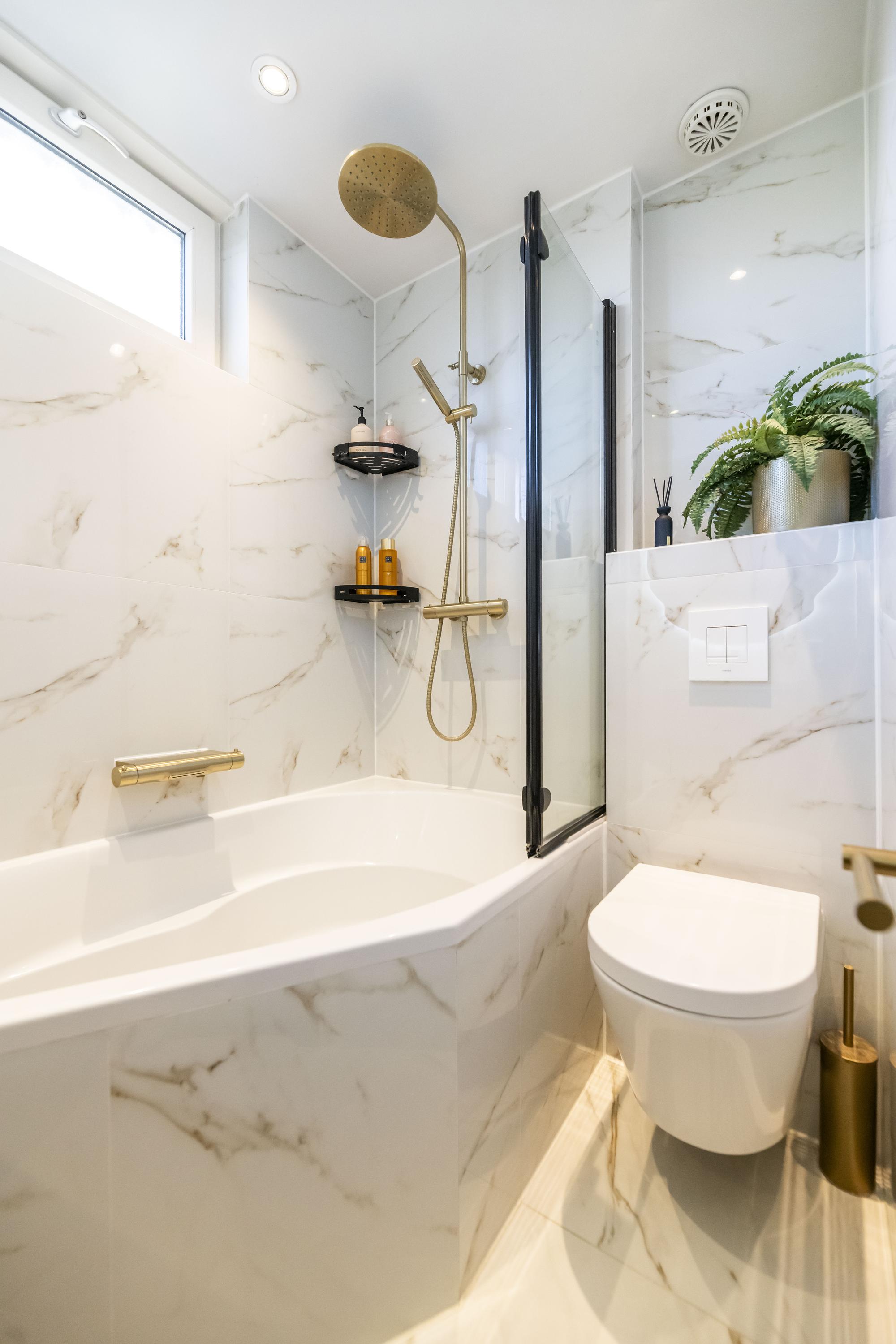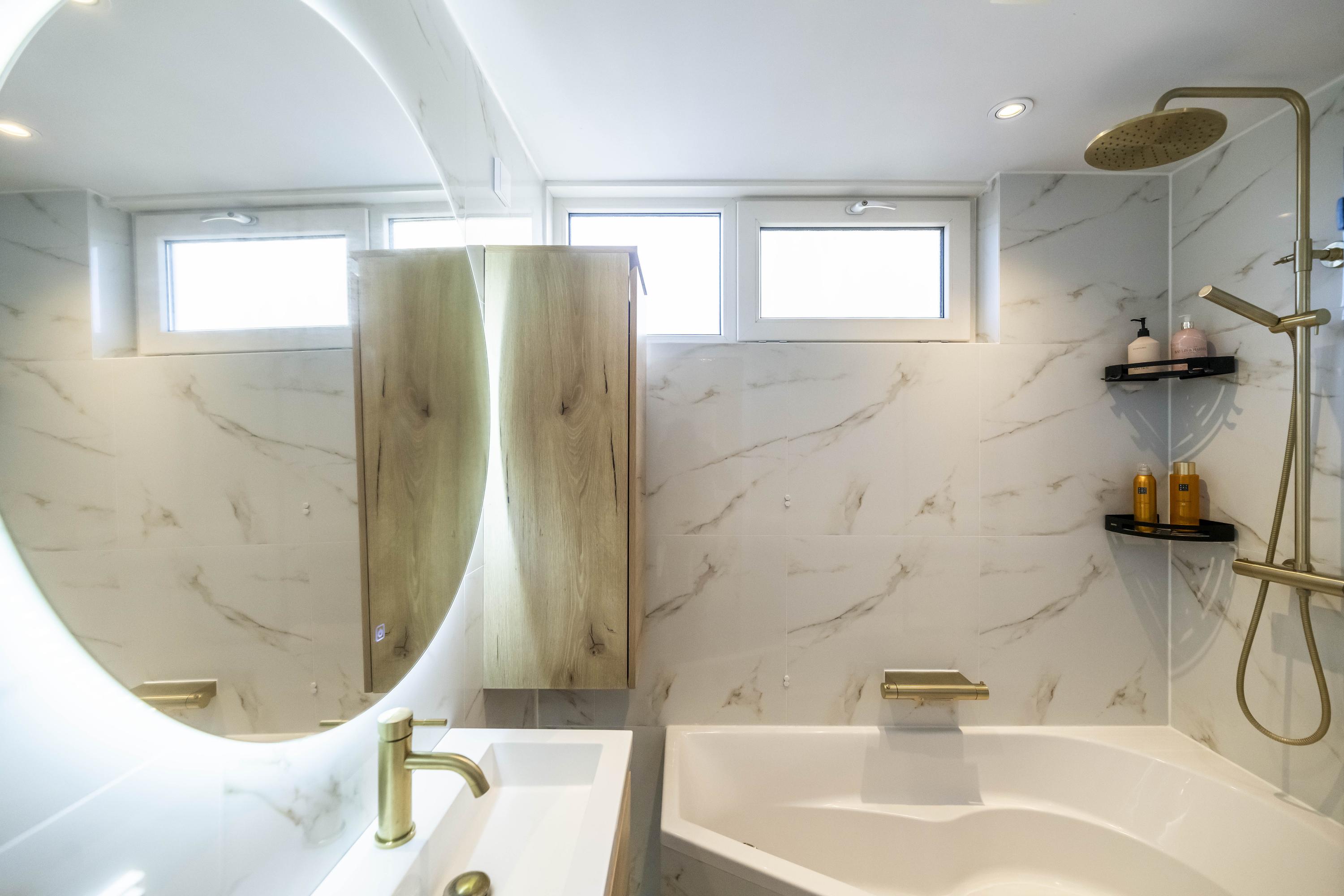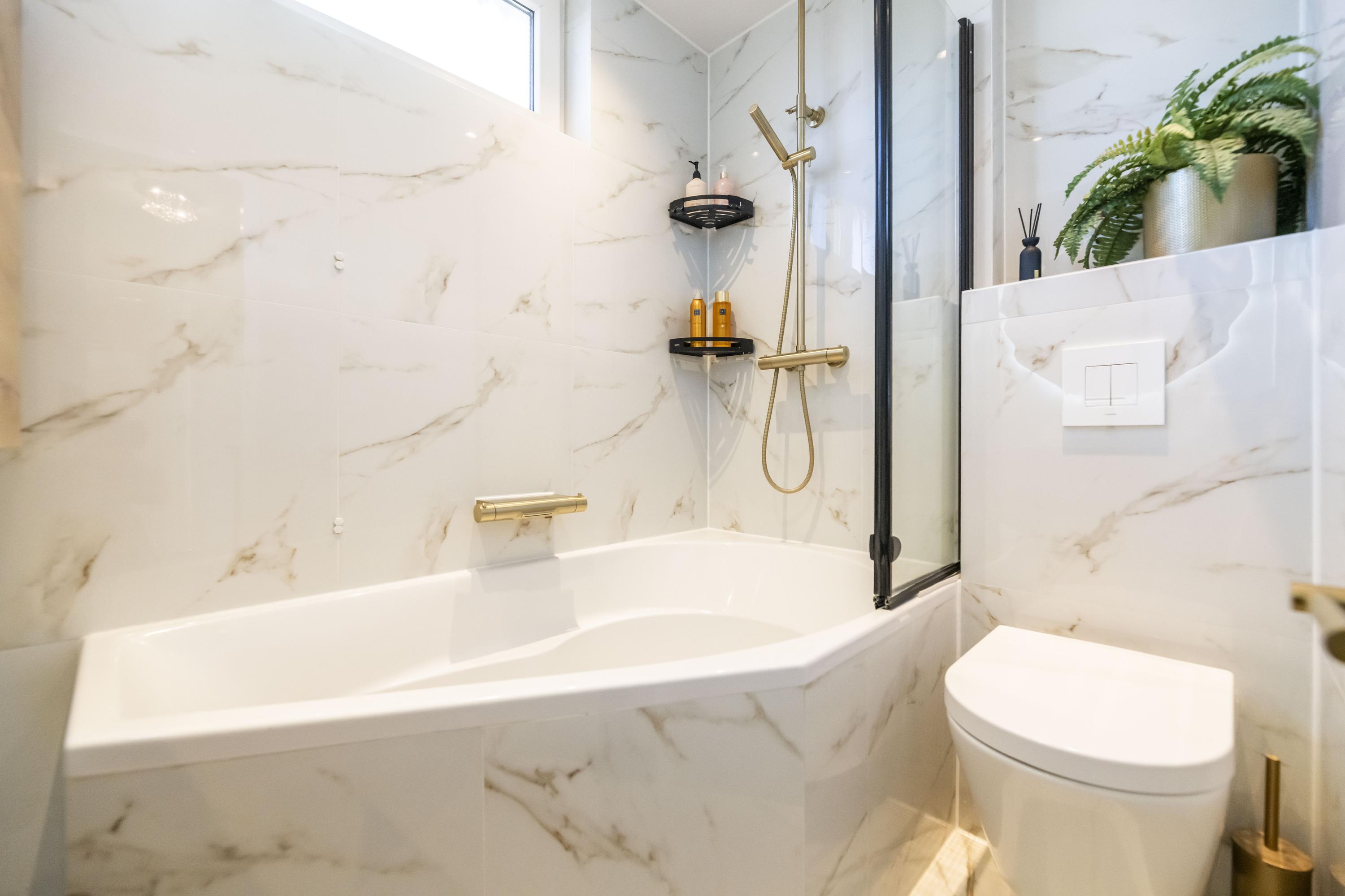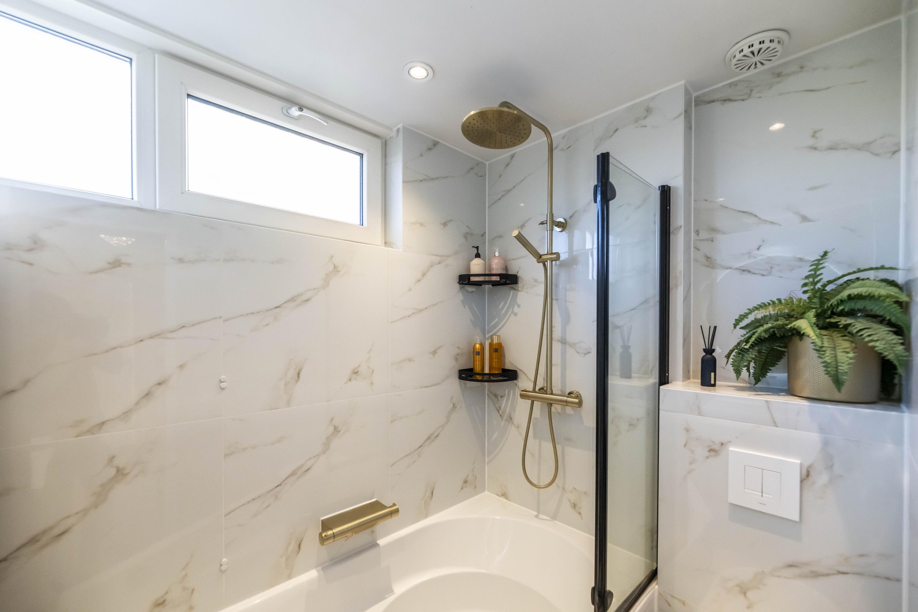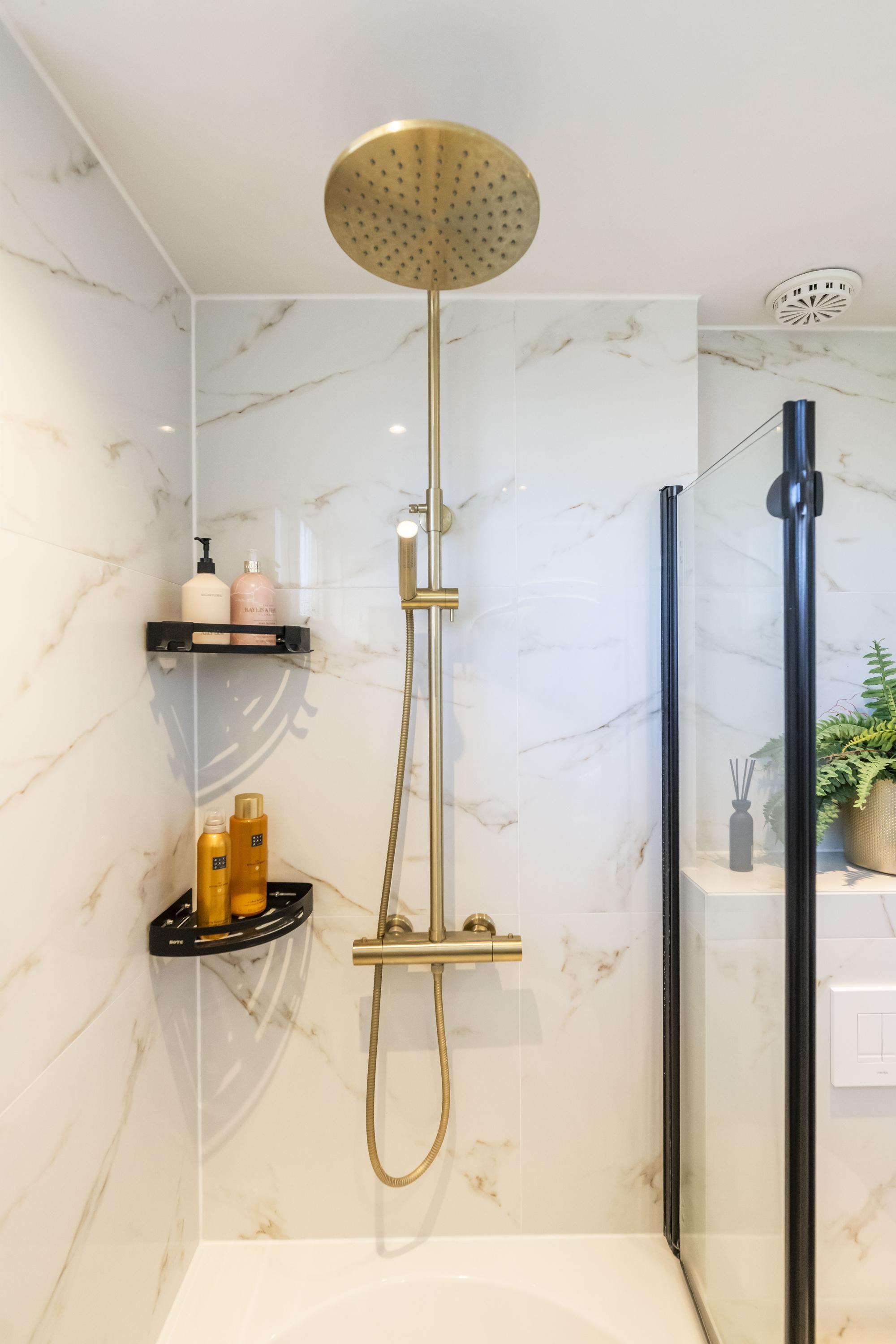 • Een moderne badkamer, recent vernieuwd met eigentijdse materialen en een frisse uitstraling.