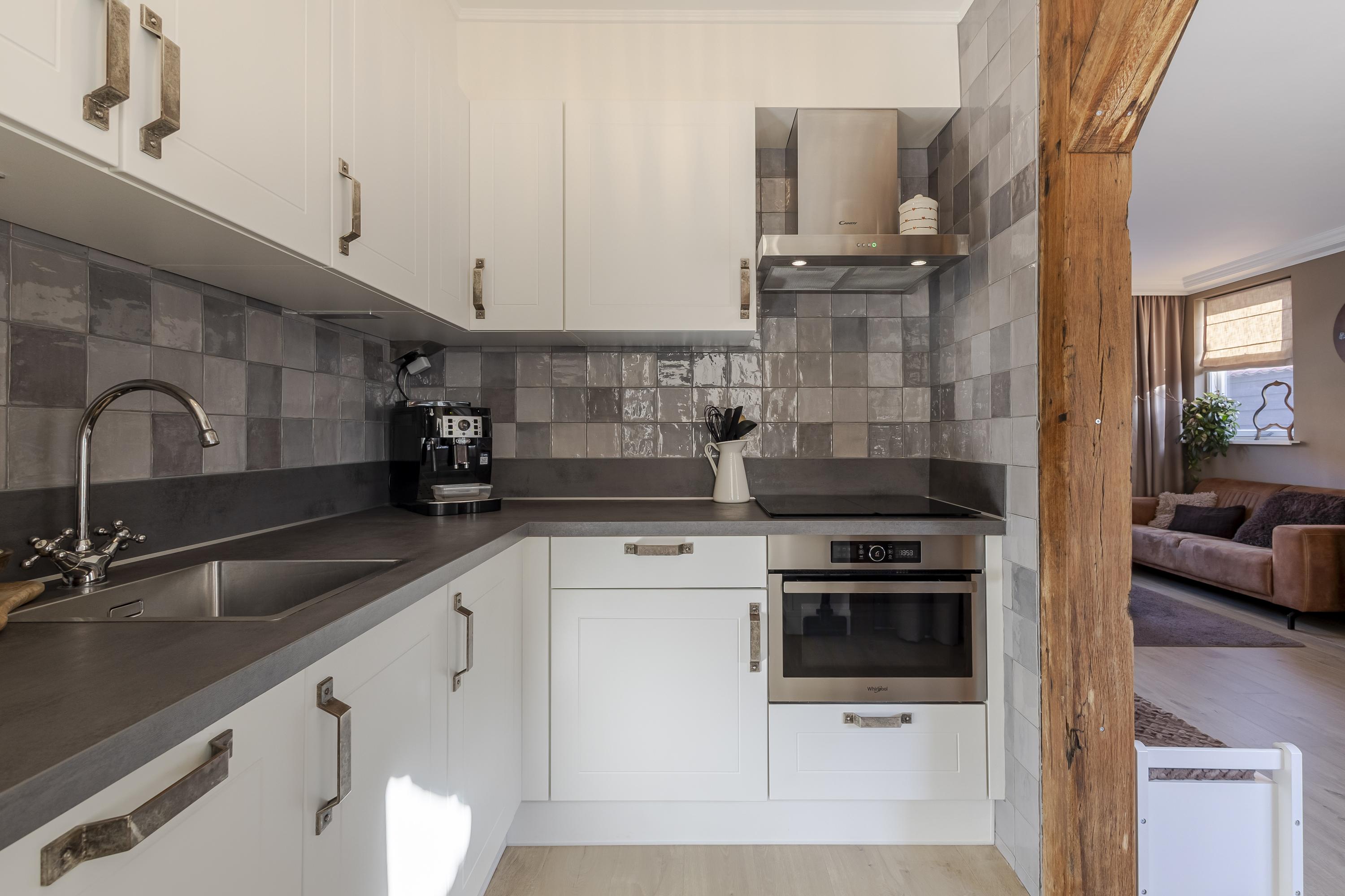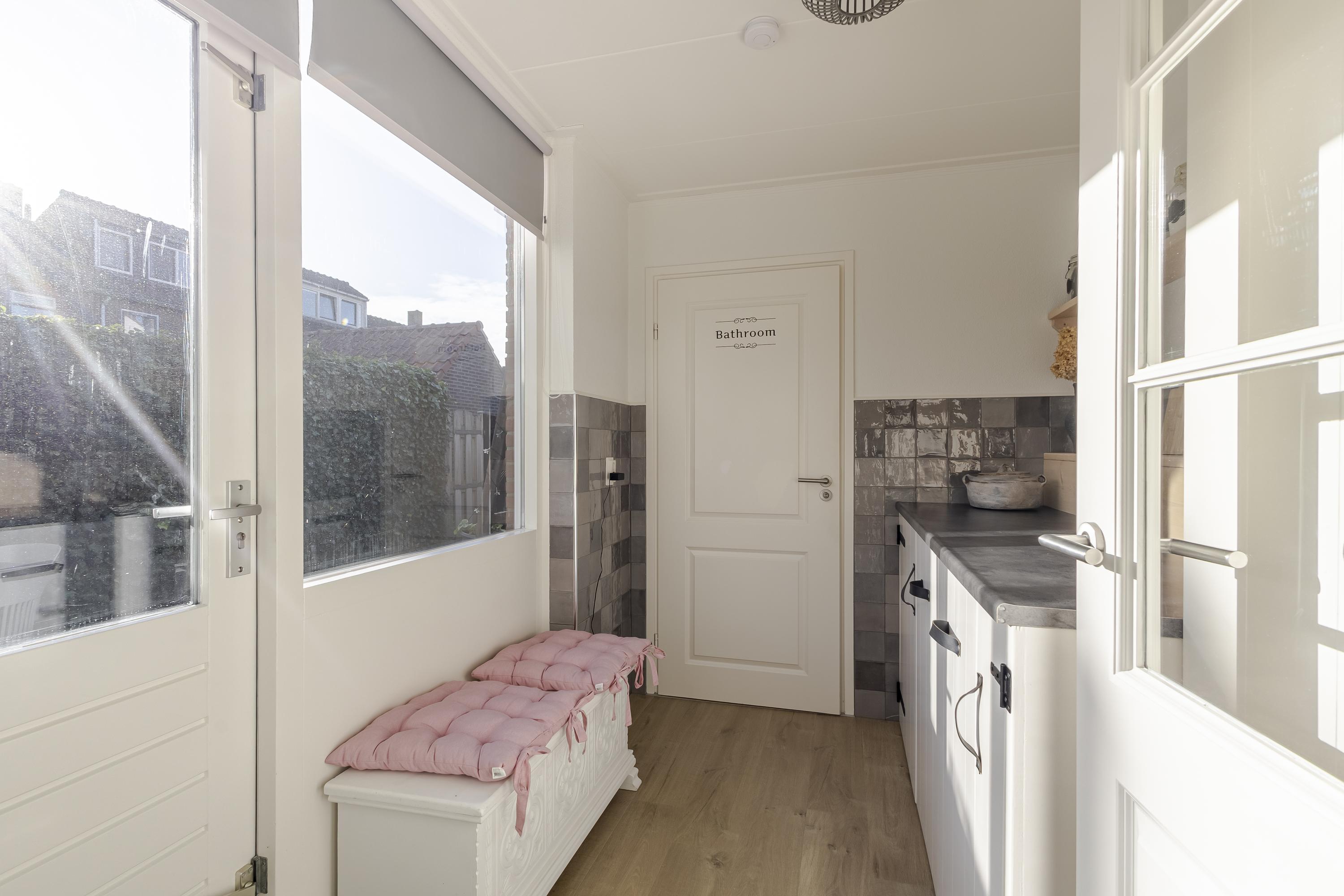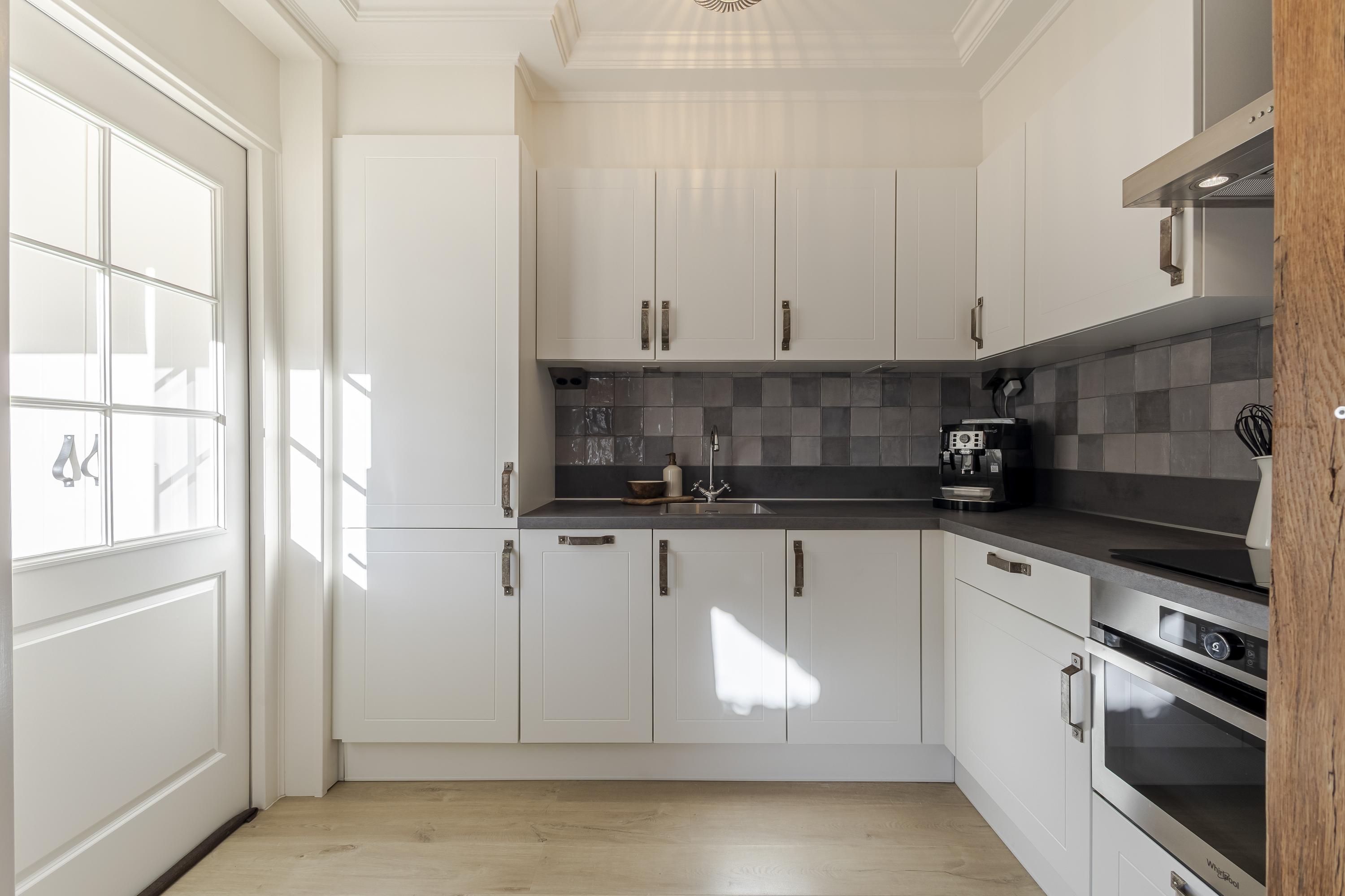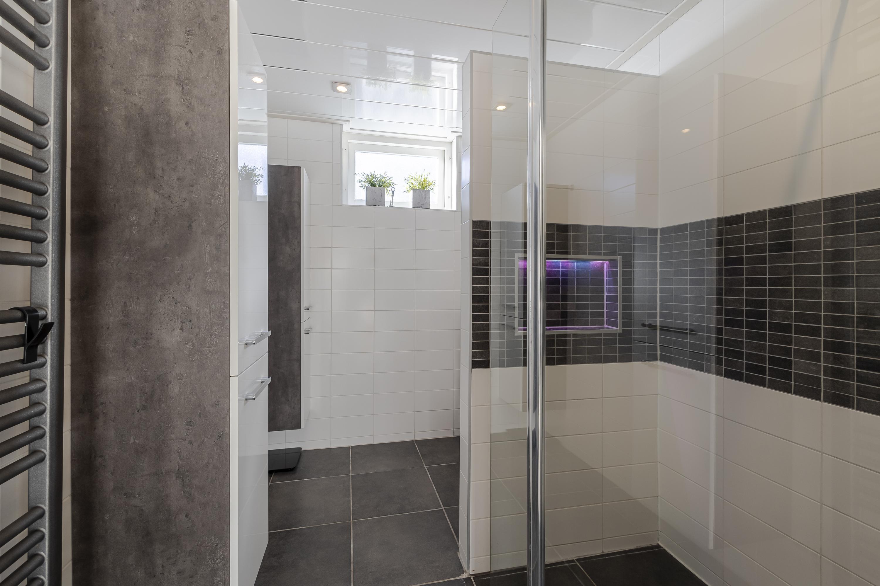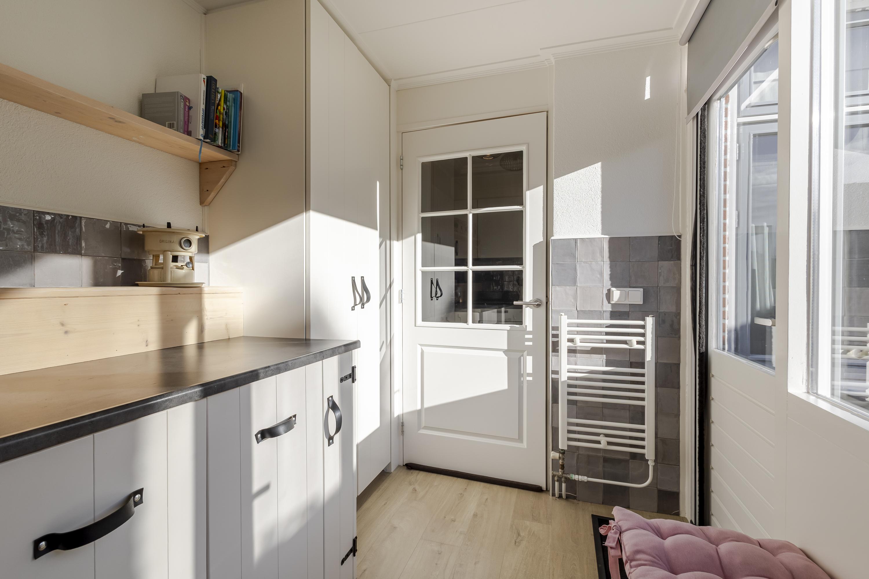 Extra praktisch is de aangrenzende bijkeuken met strakke kastenwand, werkblad én een mooi weggewerkte plek voor de wasmachine. Vanuit hier bereik je zowel de ruime badkamer als de onderhoudsvriendelijke achtertuin. De badkamer is modern en comfortabel, voorzien van een royale douche en wastafelmeubel.