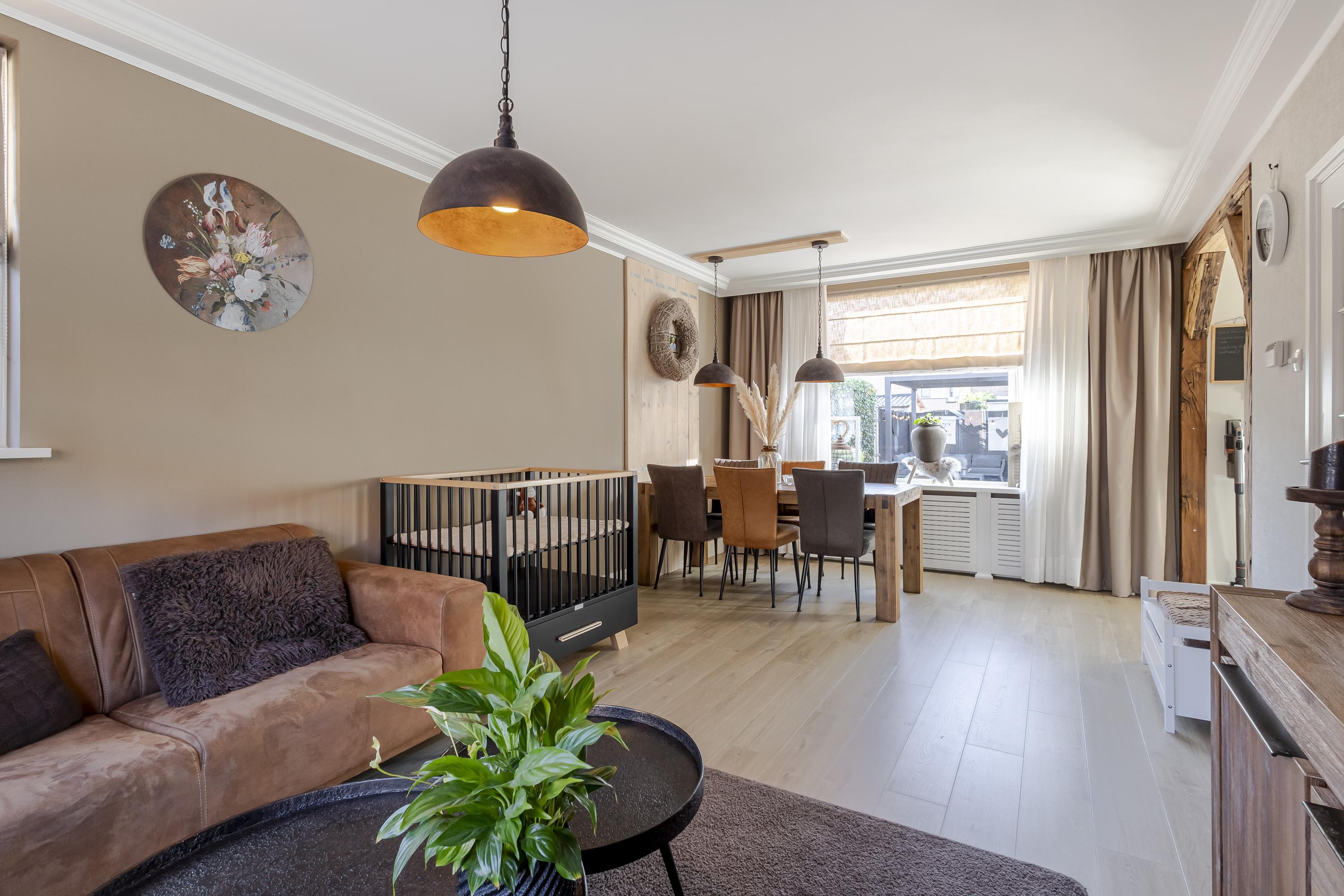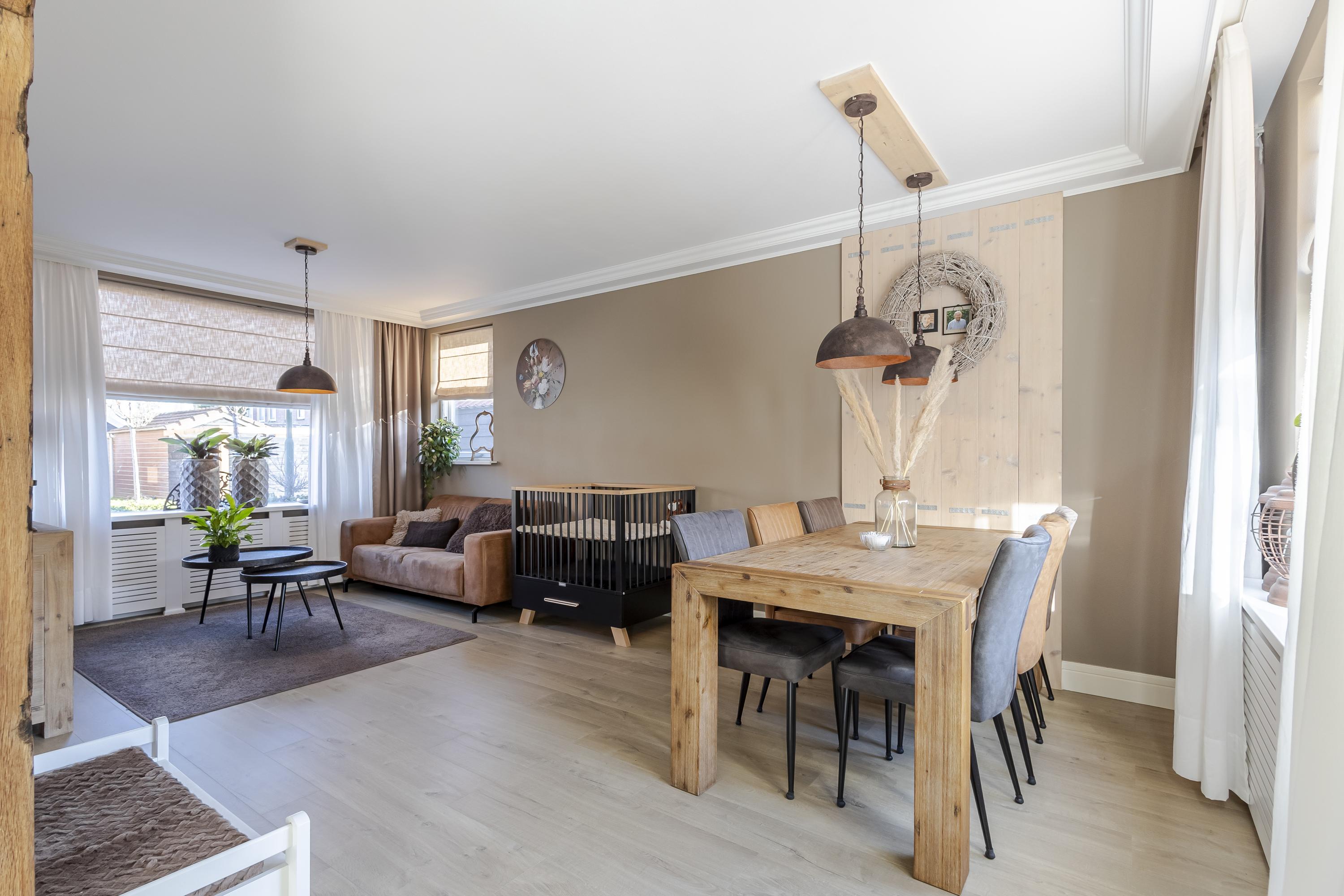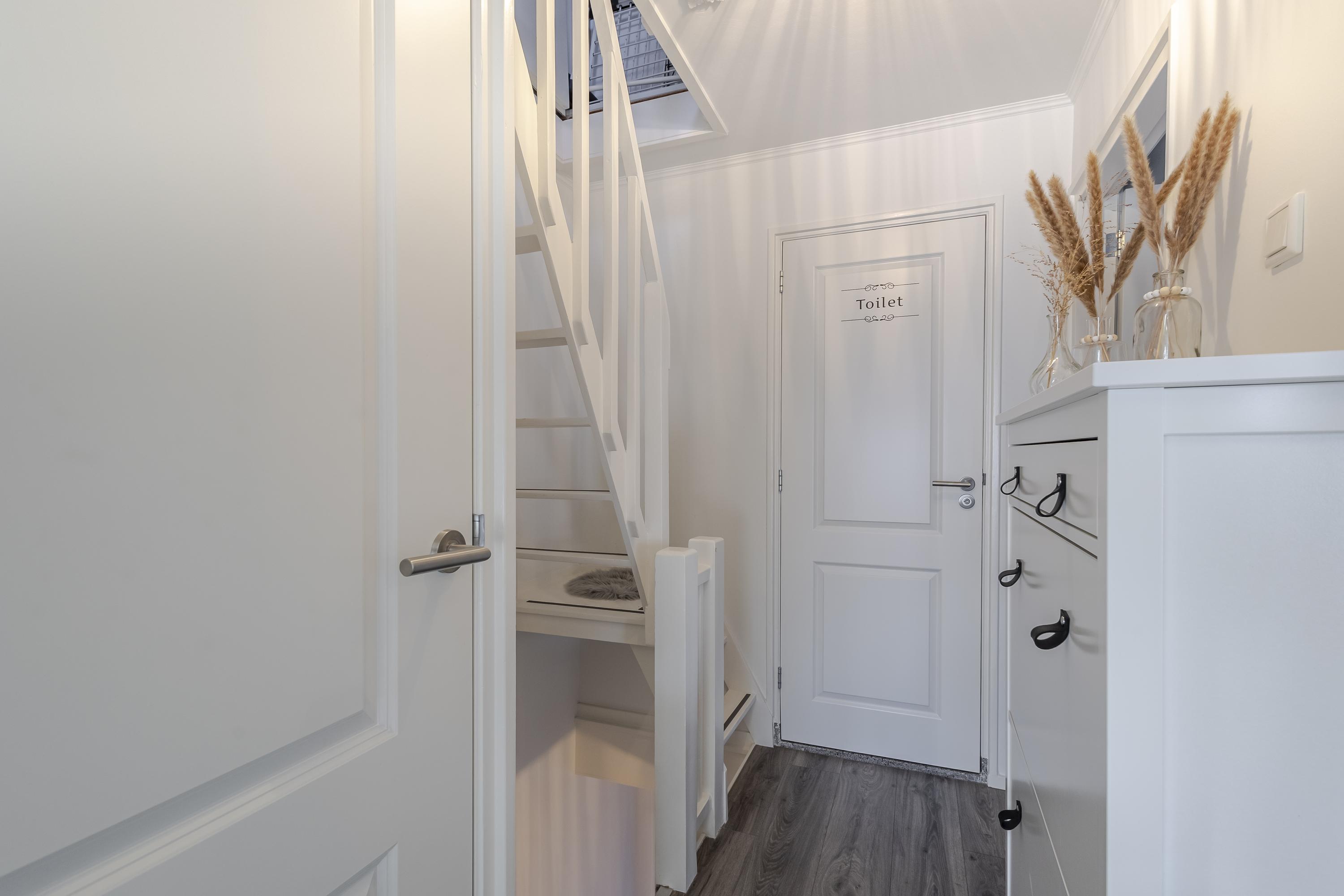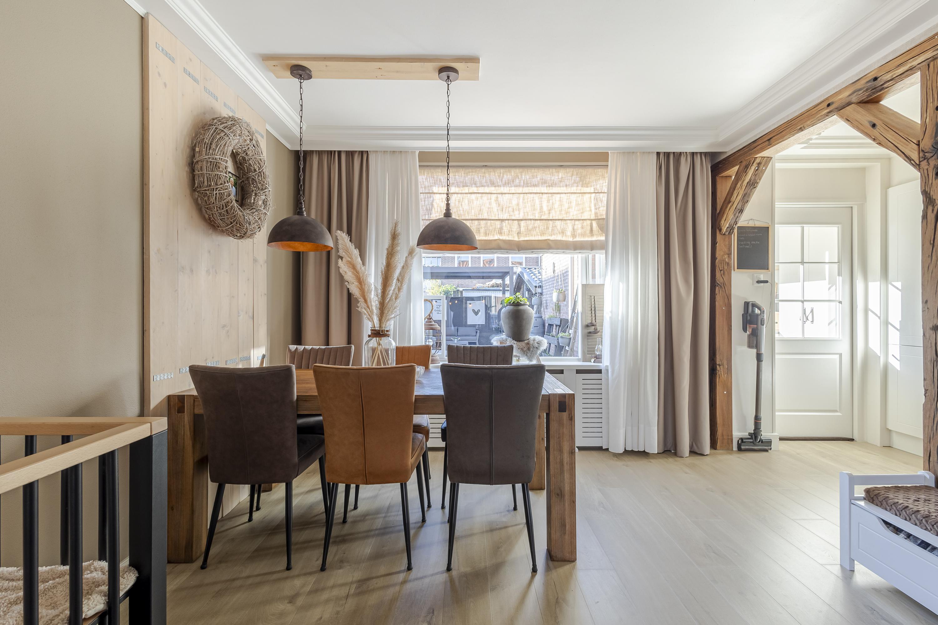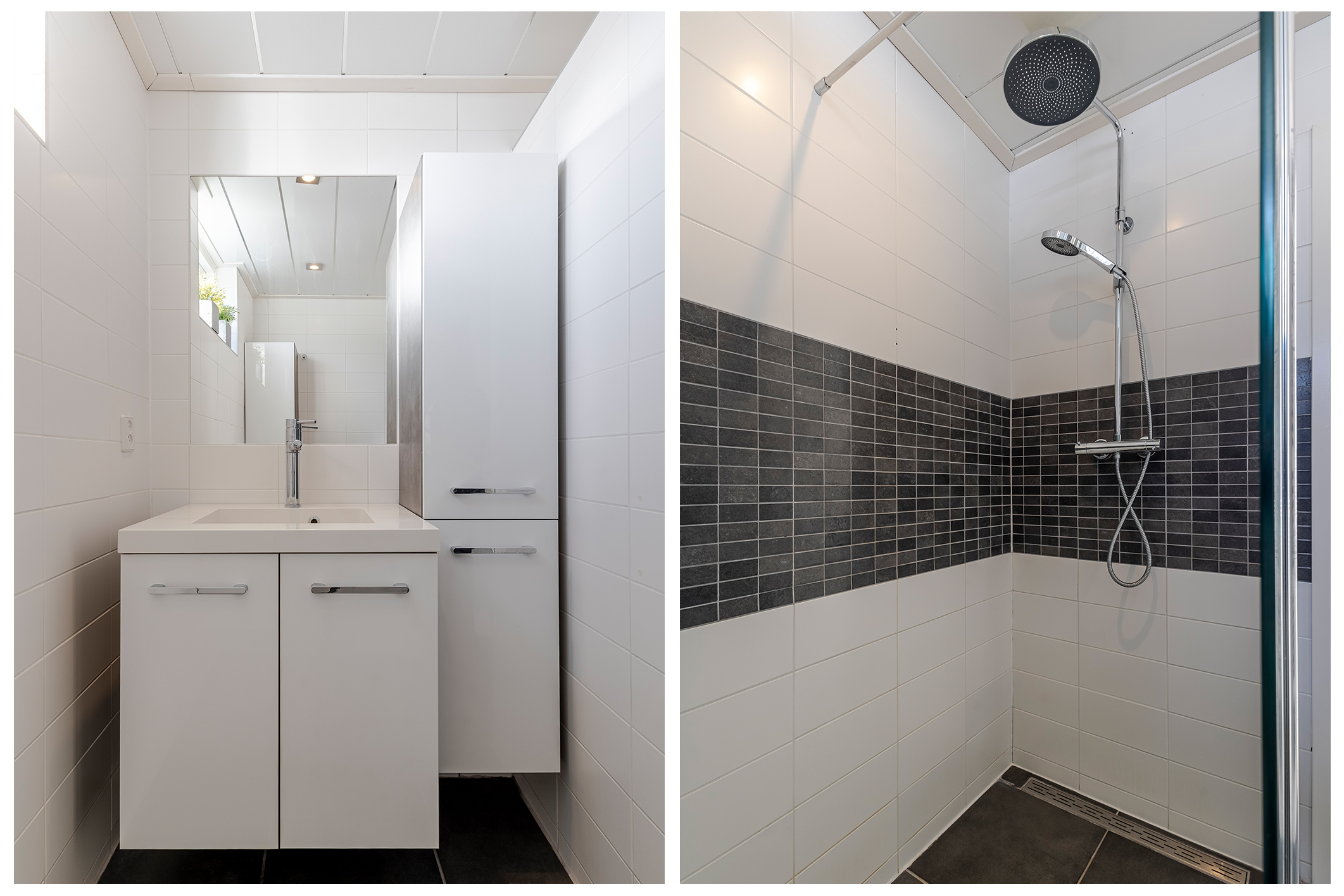 Extra praktisch is de aangrenzende bijkeuken met strakke kastenwand, werkblad én een mooi weggewerkte plek voor de wasmachine. Vanuit hier bereik je zowel de ruime badkamer als de onderhoudsvriendelijke achtertuin. De badkamer is modern en comfortabel, voorzien van een royale douche en wastafelmeubel.