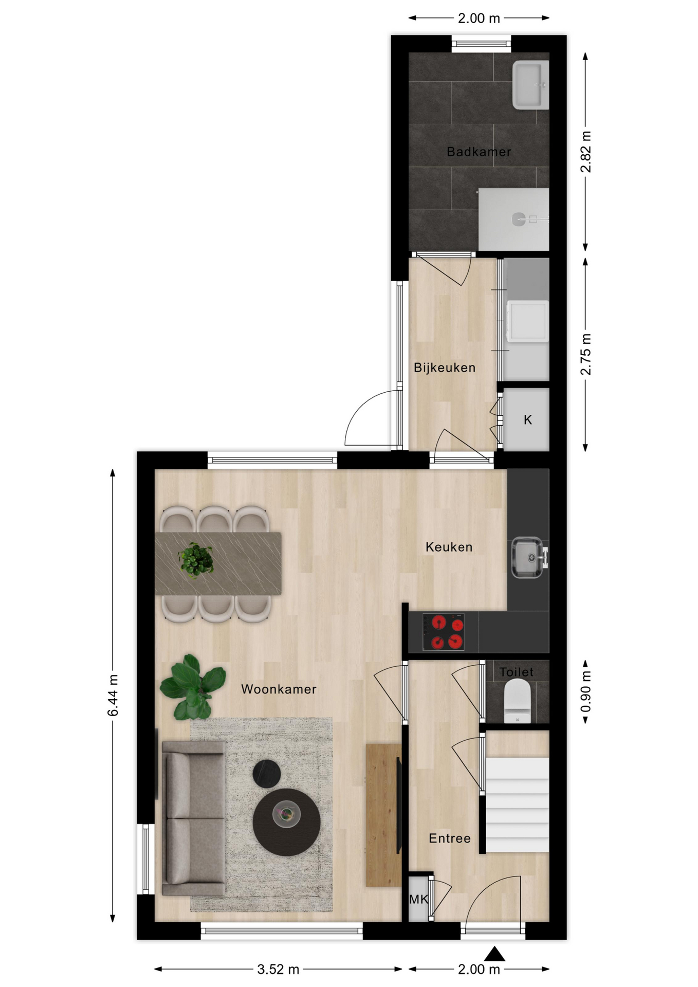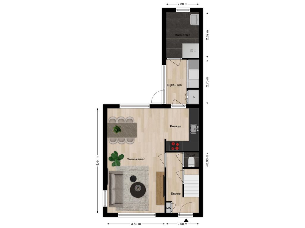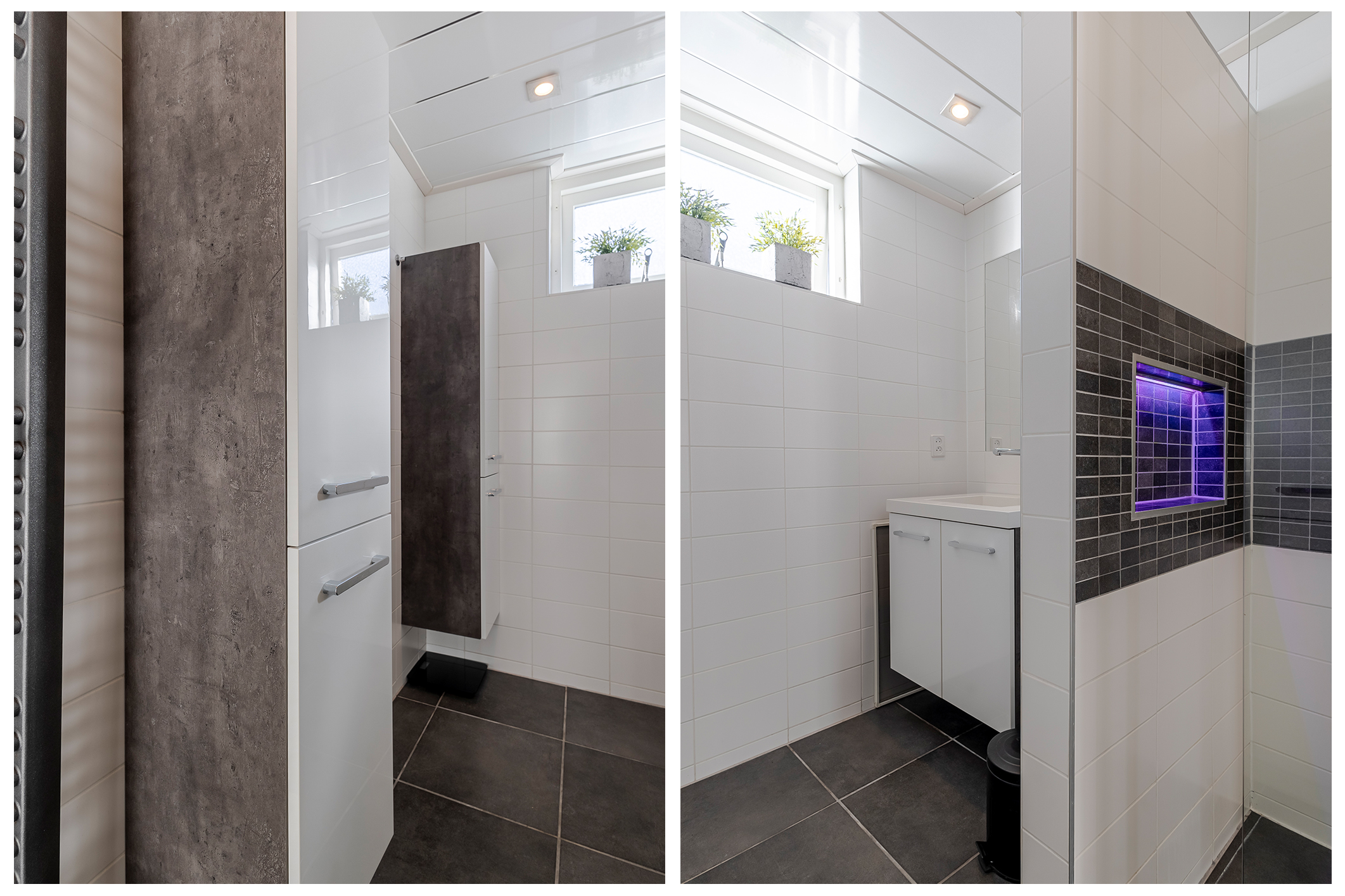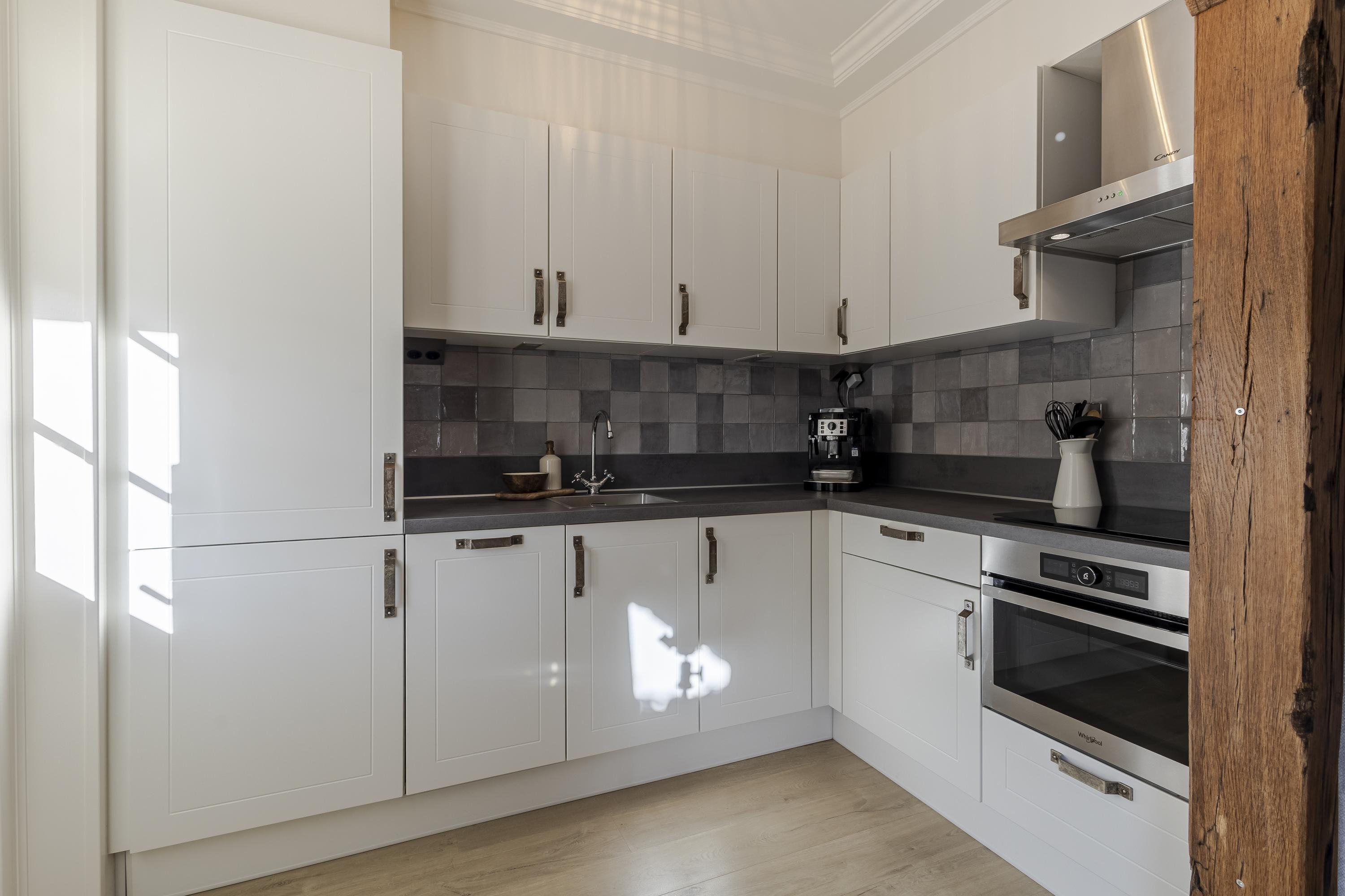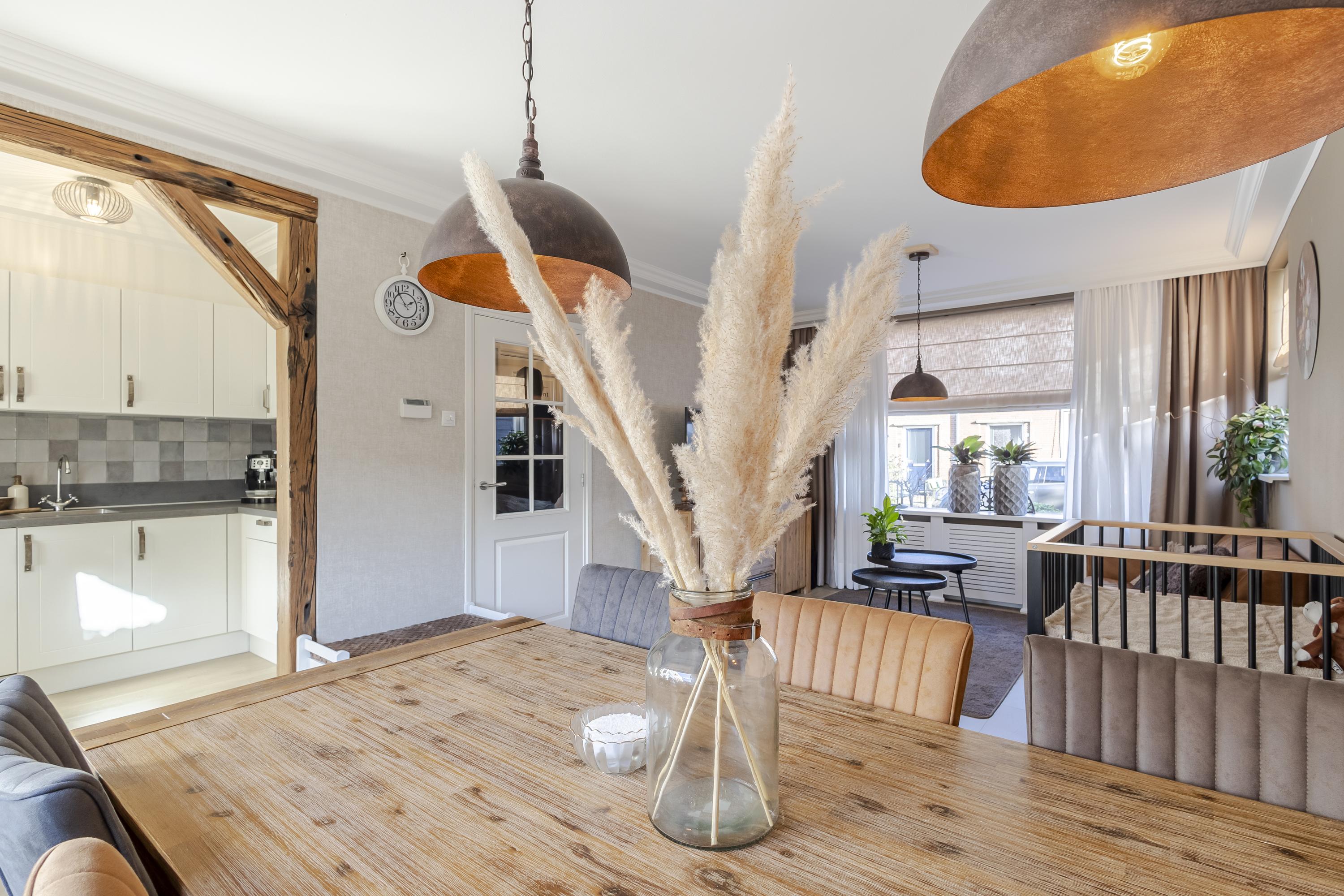 Extra praktisch is de aangrenzende bijkeuken met strakke kastenwand, werkblad én een mooi weggewerkte plek voor de wasmachine. Vanuit hier bereik je zowel de ruime badkamer als de onderhoudsvriendelijke achtertuin. De badkamer is modern en comfortabel, voorzien van een royale douche en wastafelmeubel.