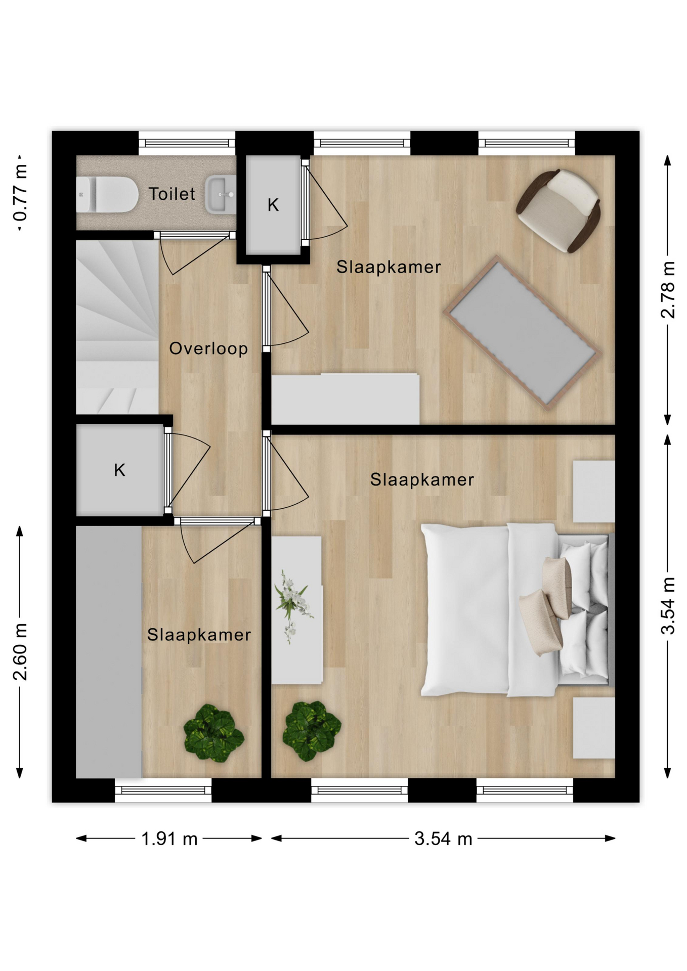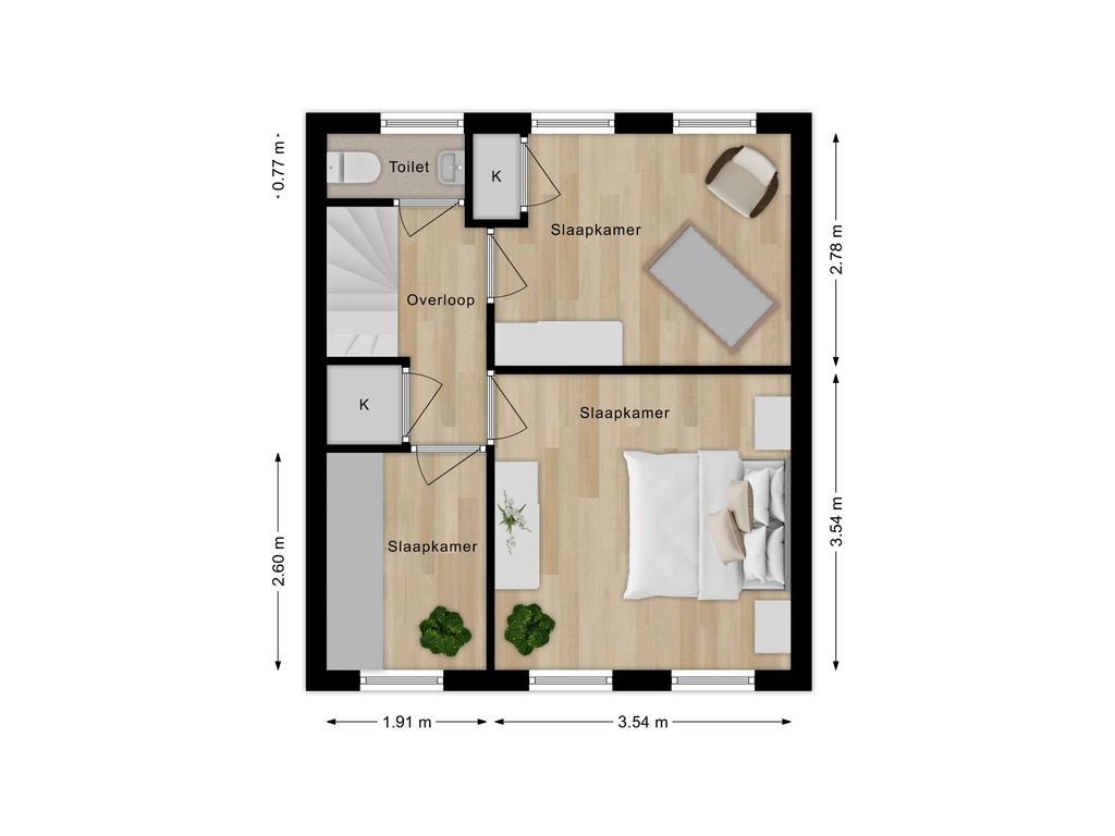 Op de eerste verdieping bevinden zich twee ruime slaapkamers en een derde compacte kamer die ideaal is als thuiswerkplek, inloopkast of babykamer. Daarnaast is er een separaat toilet. Wel zo praktisch!