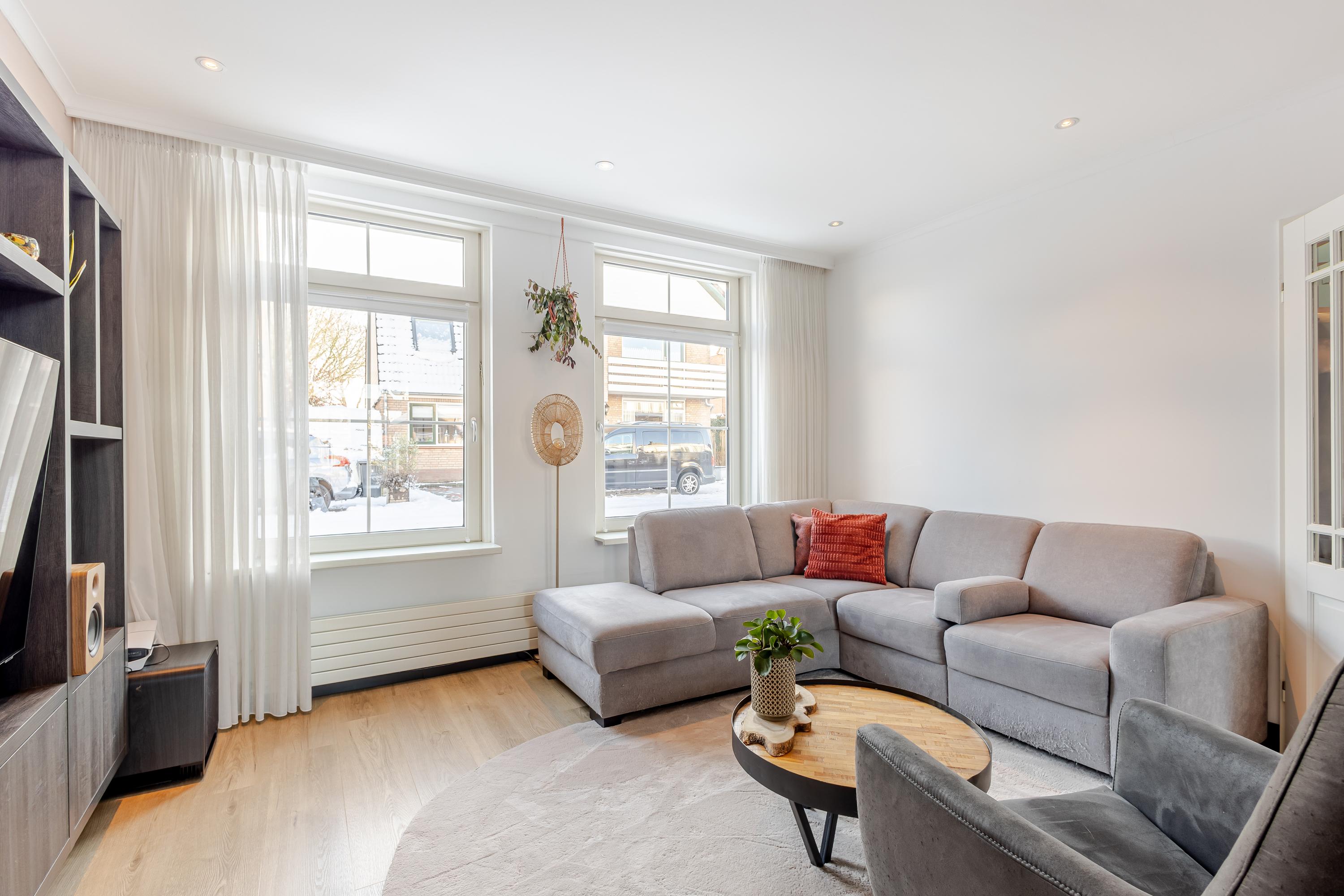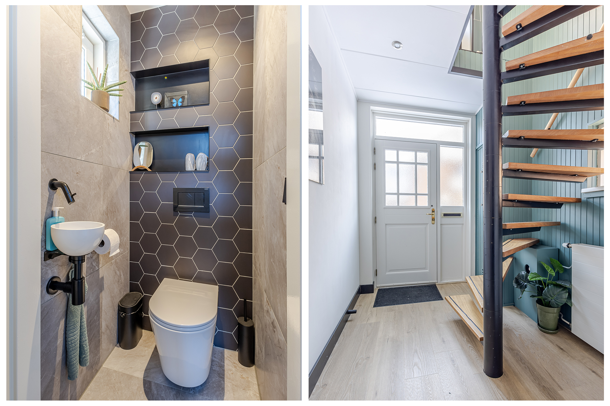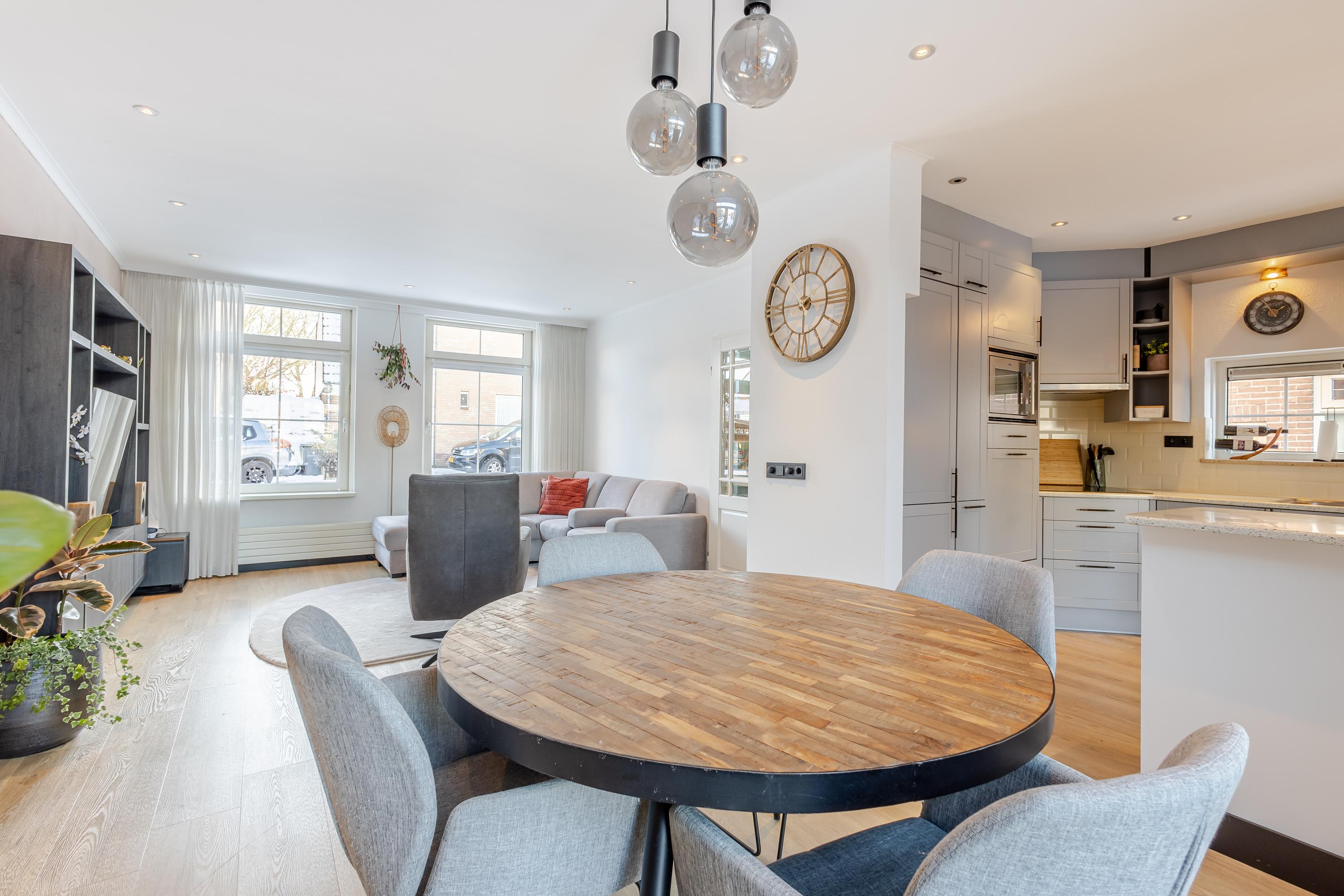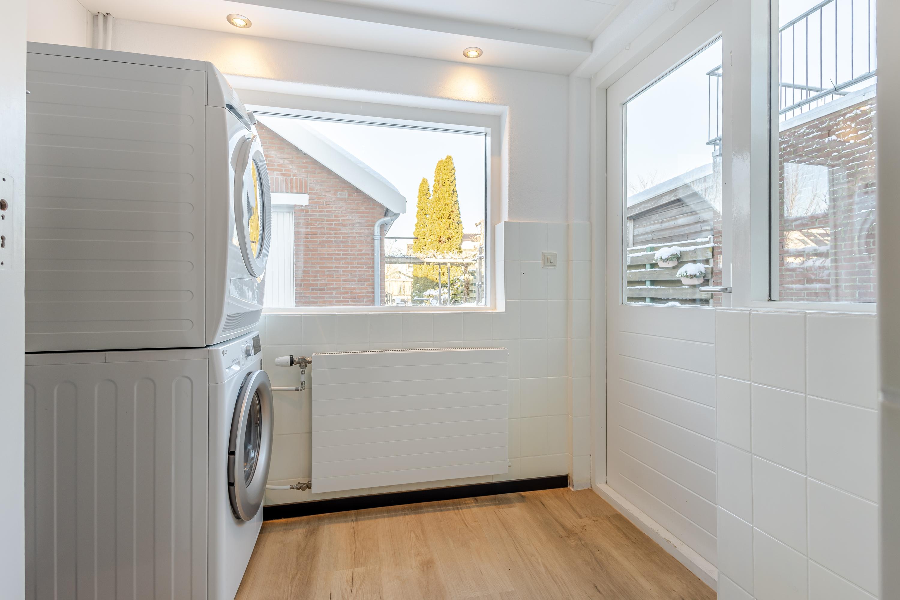 Entree/hal met meterkast, trapopgang en modern toilet (2024). Toegang tot de sfeervolle doorzonwoonkamer met openslaande deuren naar de tuin. De halfopen keuken met hoekopstelling is voorzien van inbouwapparatuur en staat in directe verbinding met de praktische bijkeuken, uitgerust met witgoedaansluitingen en een achterom. De gehele begane grond is afgewerkt met pvc en comfortabele vloerverwarming.