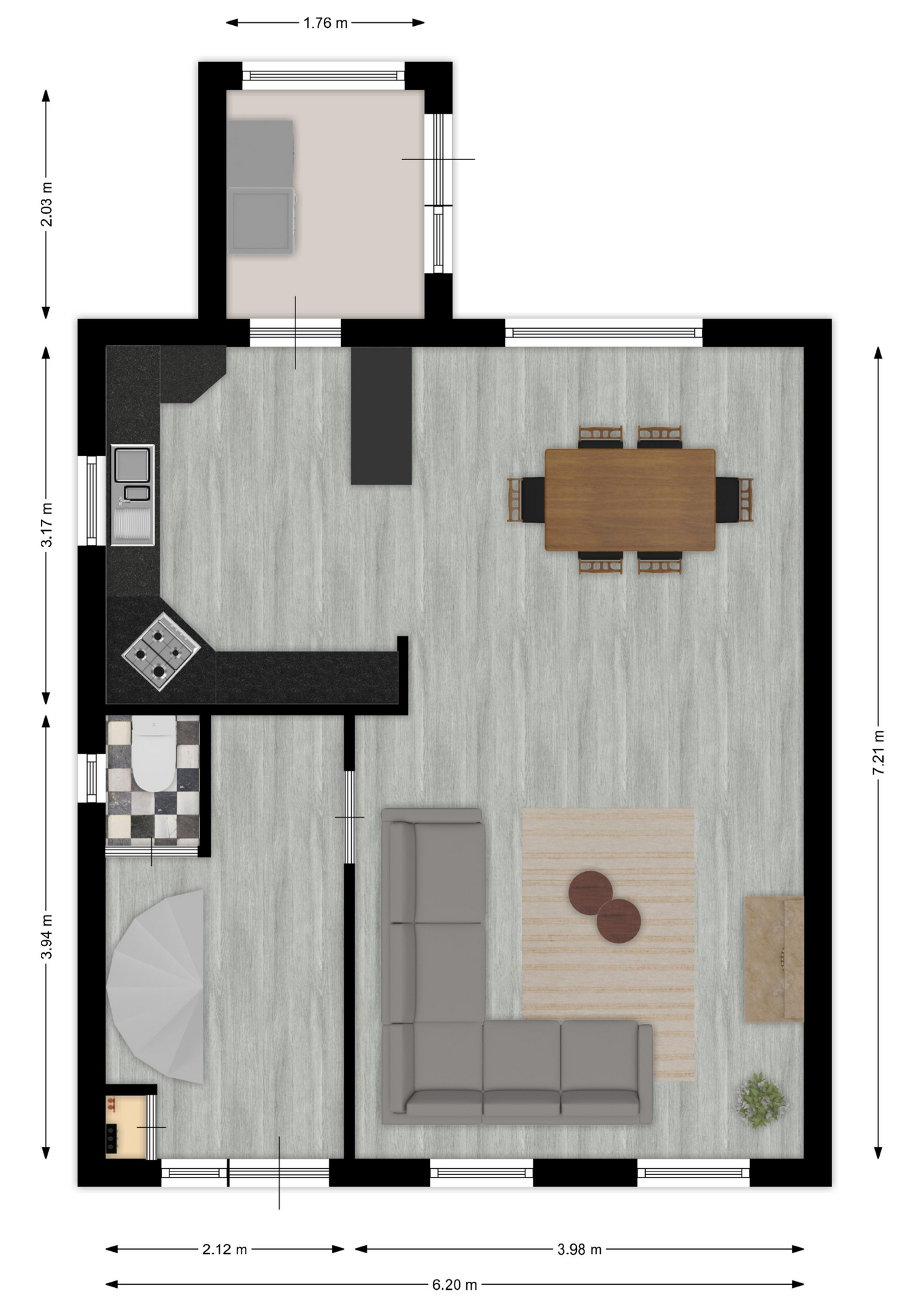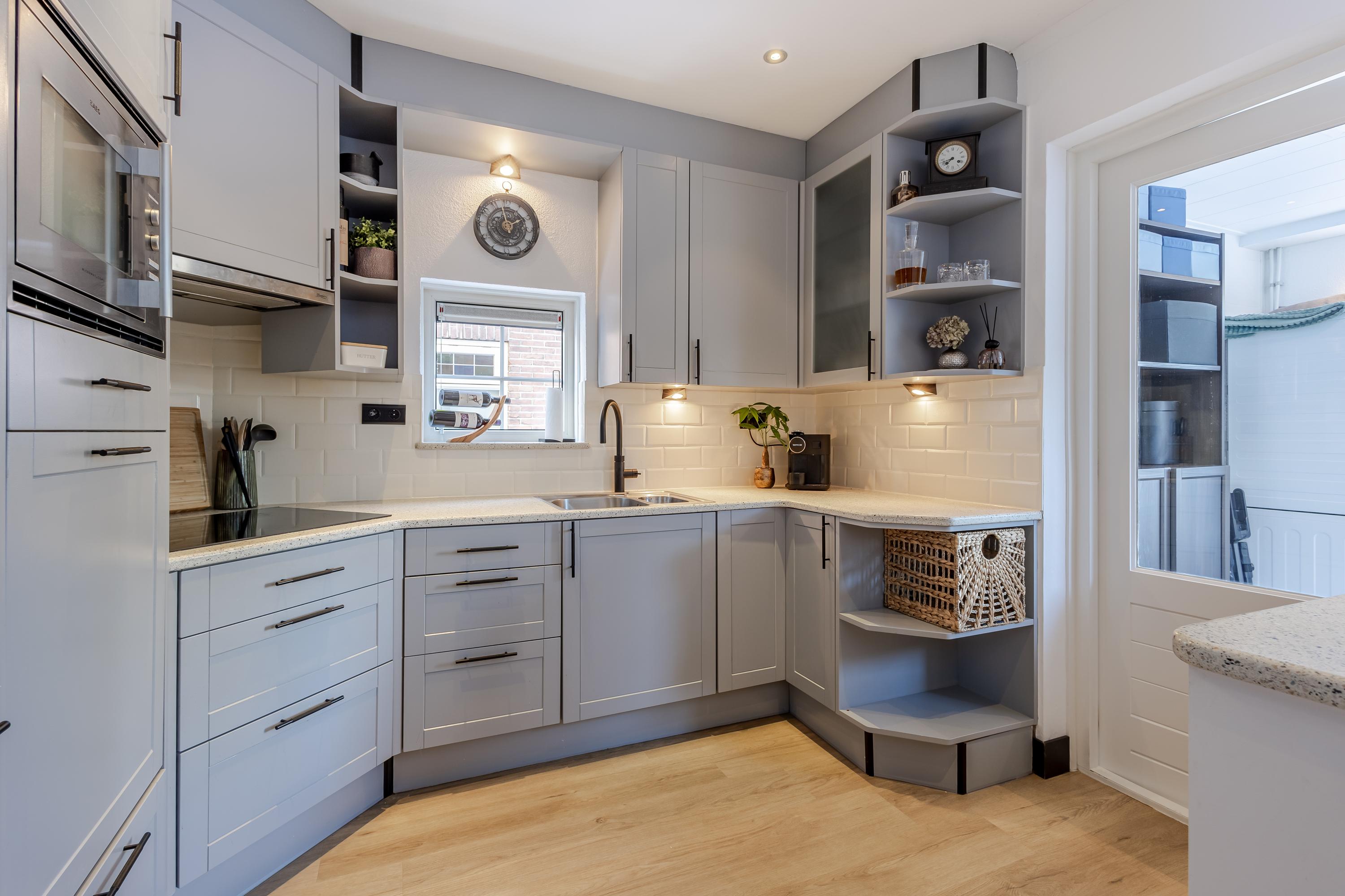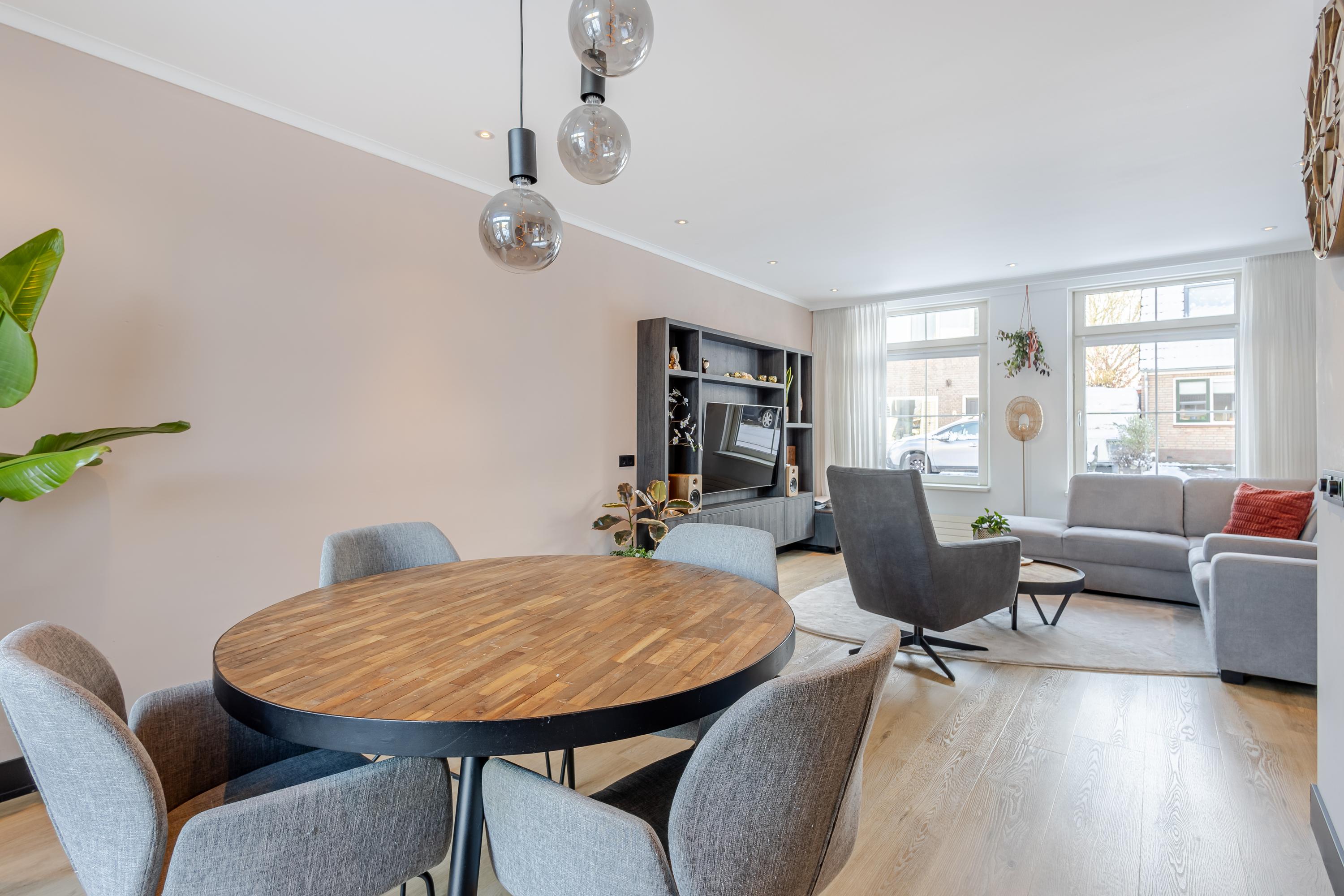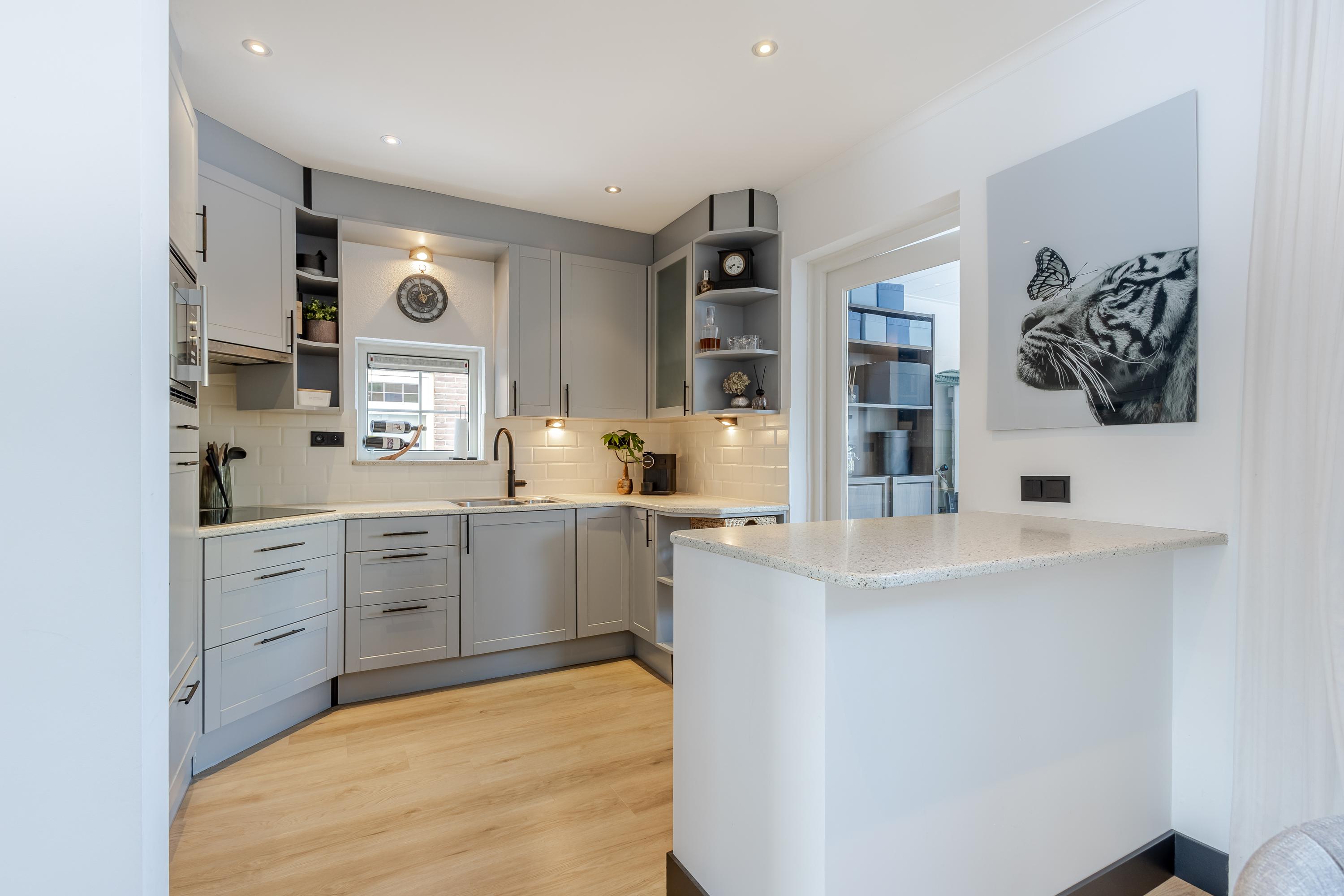 Entree/hal met meterkast, trapopgang en modern toilet (2024). Toegang tot de sfeervolle doorzonwoonkamer met openslaande deuren naar de tuin. De halfopen keuken met hoekopstelling is voorzien van inbouwapparatuur en staat in directe verbinding met de praktische bijkeuken, uitgerust met witgoedaansluitingen en een achterom. De gehele begane grond is afgewerkt met pvc en comfortabele vloerverwarming.
