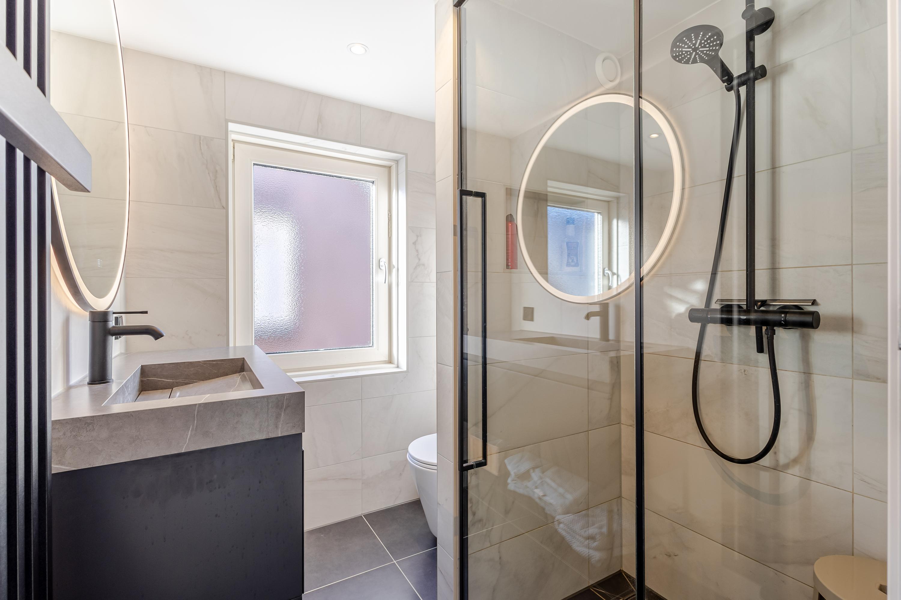 Een ruime overloop met toegang tot drie slaapkamers, de badkamer en de bergzolder. De moderne badkamer (2024) is compleet uitgevoerd met een inloopdouche, tweede toilet, designradiator en wastafelmeubel waarboven een, te verwarmen, spiegel.